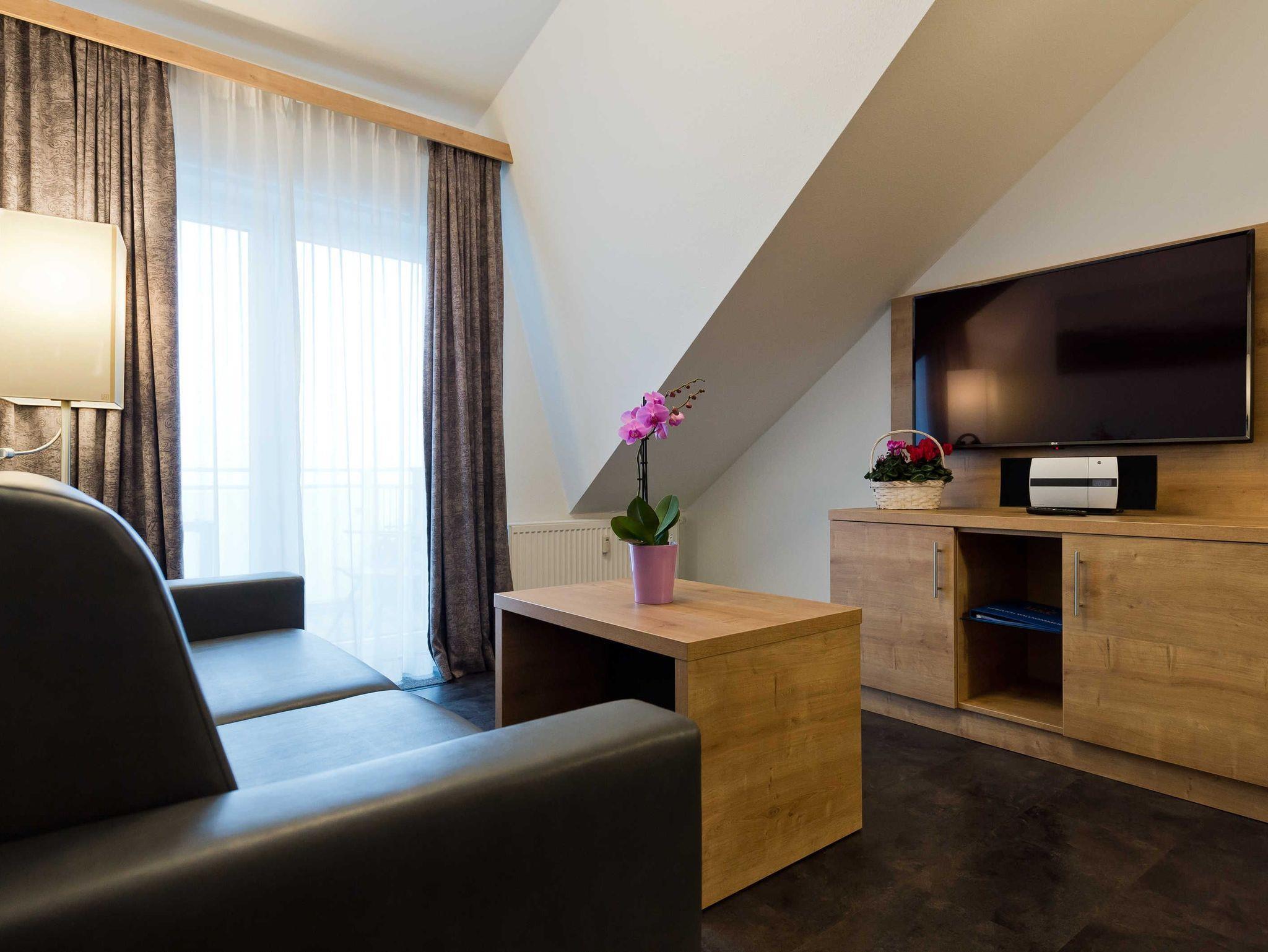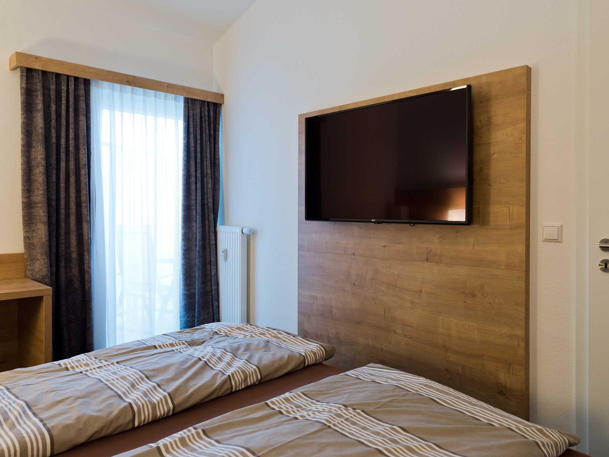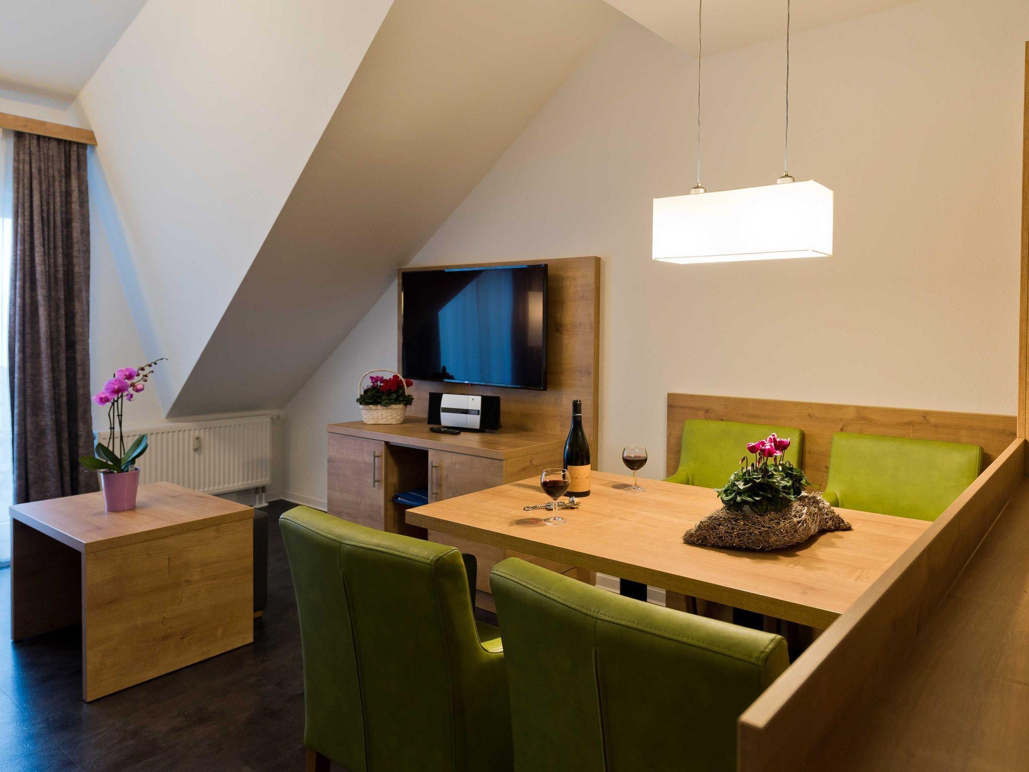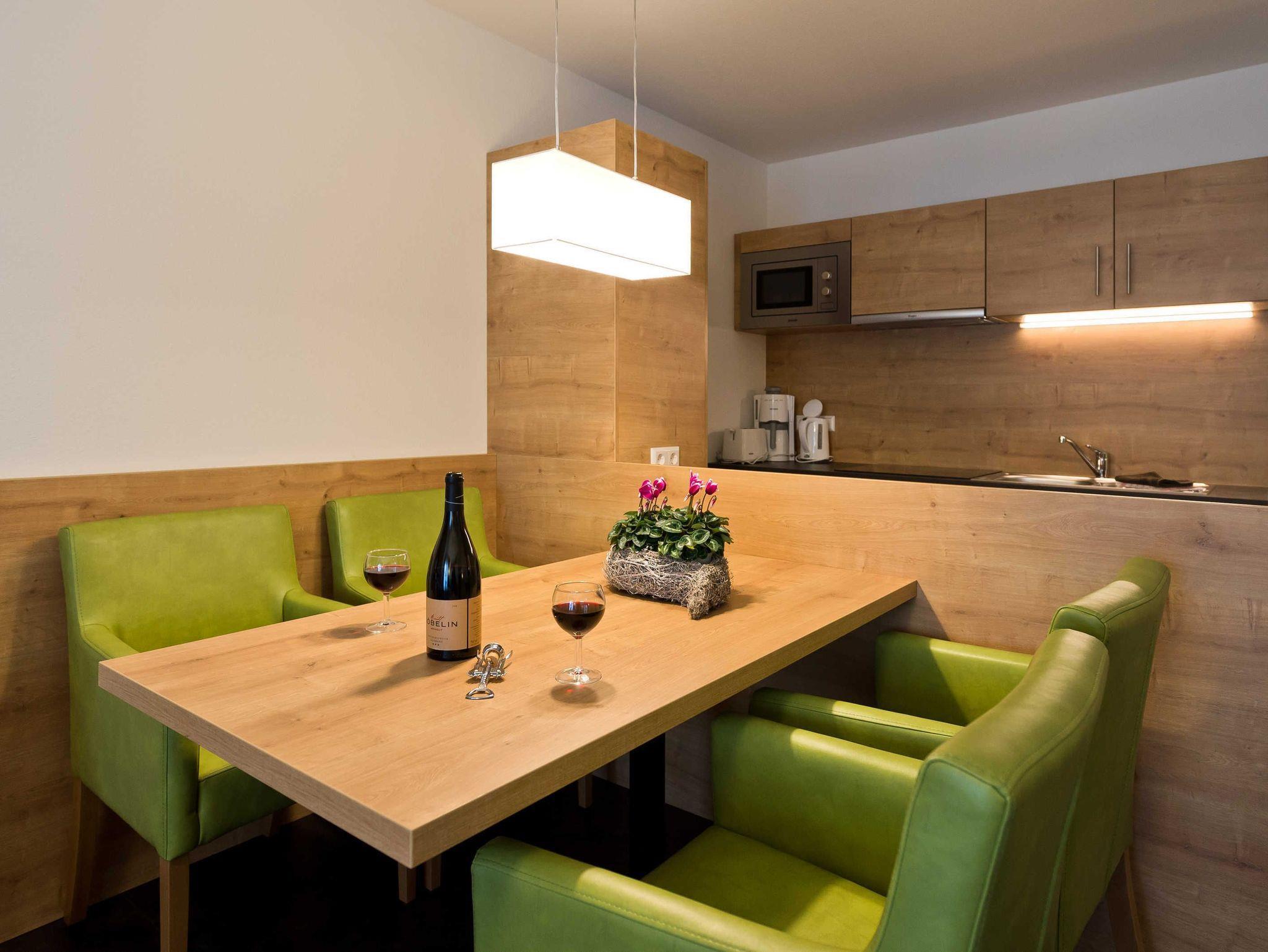Sie wohnen in einem modernen 2-Zimmer-Appartement für bis zu 4 Personen. Das Schlafzimmer verfügt über ein Doppelbett, einen geräumigen Kleiderschrank und einen 43 SAT-TV. Im Wohnbereich finden Sie die voll ausgestattete Küche mit Cerankochfeld, Backofen, Mikrowelle, Kaffeemaschine, Wasserkocher, Toaster und Geschirrspüler. Direkt daneben lädt der Esstisch mit seinen vier bequemen Sesseln zum gemütlichen Beisammensein ein.