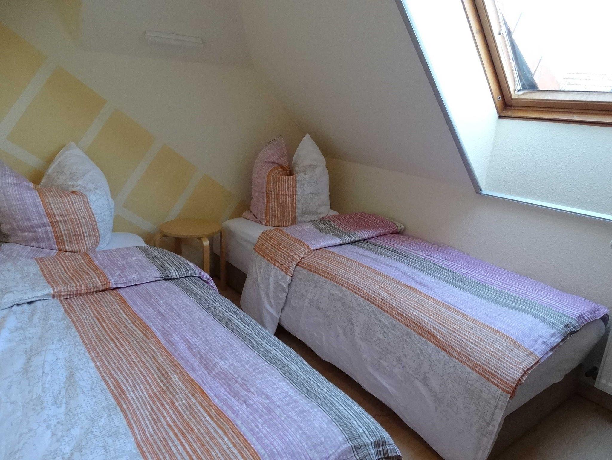 Die Dachflächenfenster verfügen über Sonnenschutz und teilweise Fliegengitter. Im Schlafzimmer stehen zwei Einzelbetten mit einer Liegefläche von 80x200 cm. Der Zugang zum Obergeschoss erfolgt über eine etwas steile Treppe mit Handlauf.