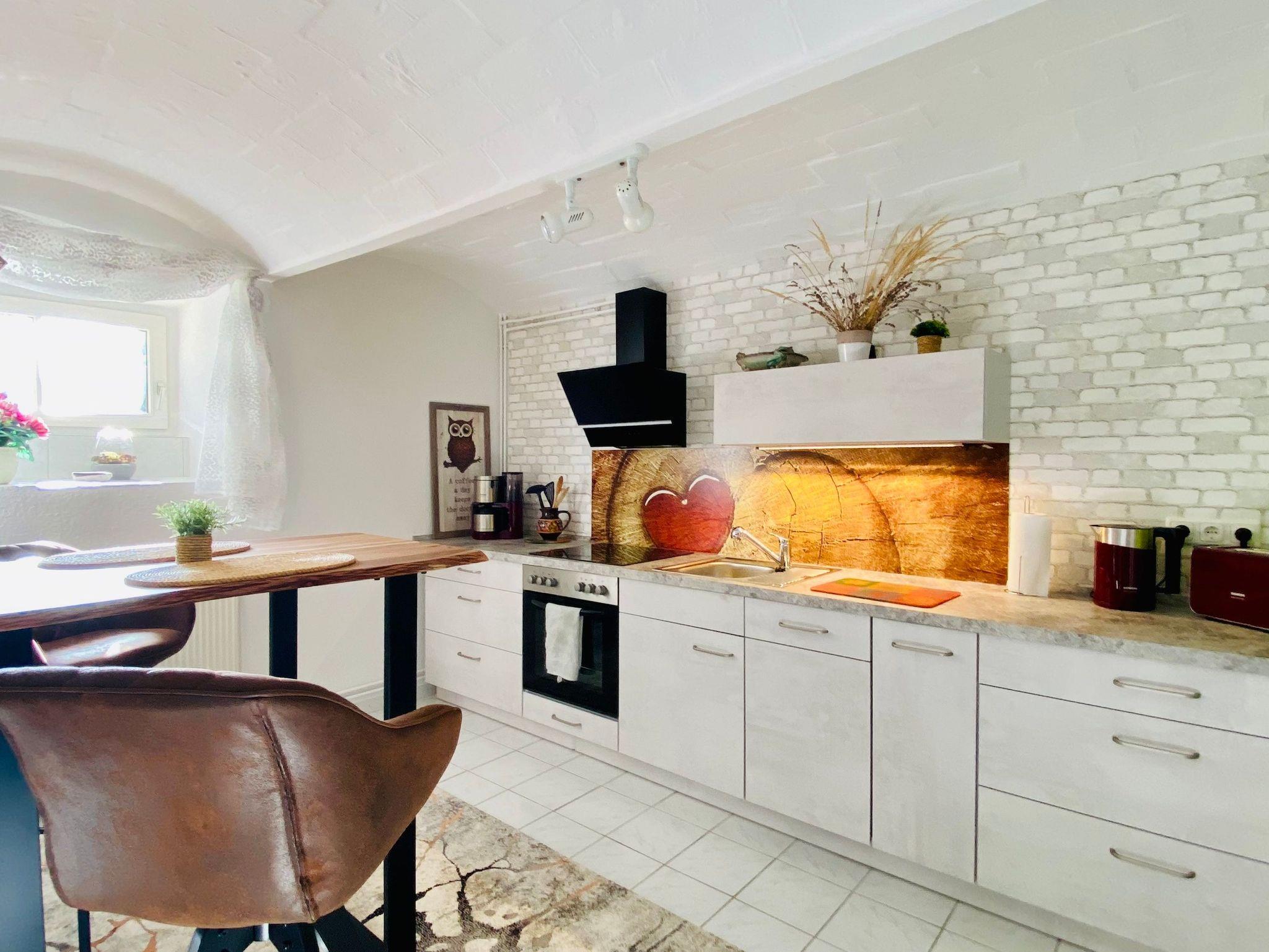 Über eine kleine Treppe gelangen Sie in das Souterrain. Dort befinden sich ein Flur mit viel Stauraum für Ihre Urlaubssachen, ein kleines Bad mit Dusche und WC für die tägliche Hygiene. Das ehemalige Weingewölbe haben wir 2023 neu saniert und für sie eine sehr komfortable, moderne Gewölbeküche eingerichtet. Die Ausstattung der Küche bietet alles was sie benötigen um auch den Magen zu verwöhnen. In diesem sehr besonderen Ambiente bleiben wenig oder keine Wünsche offen. Am Bartisch bequem sitzend haben Sie einen schönen Blick ins Grüne, während Kaffeeduft durch das Gewölbe zieht und auf zauberhaftem Geschirr leckere Speisen bereit stehen.