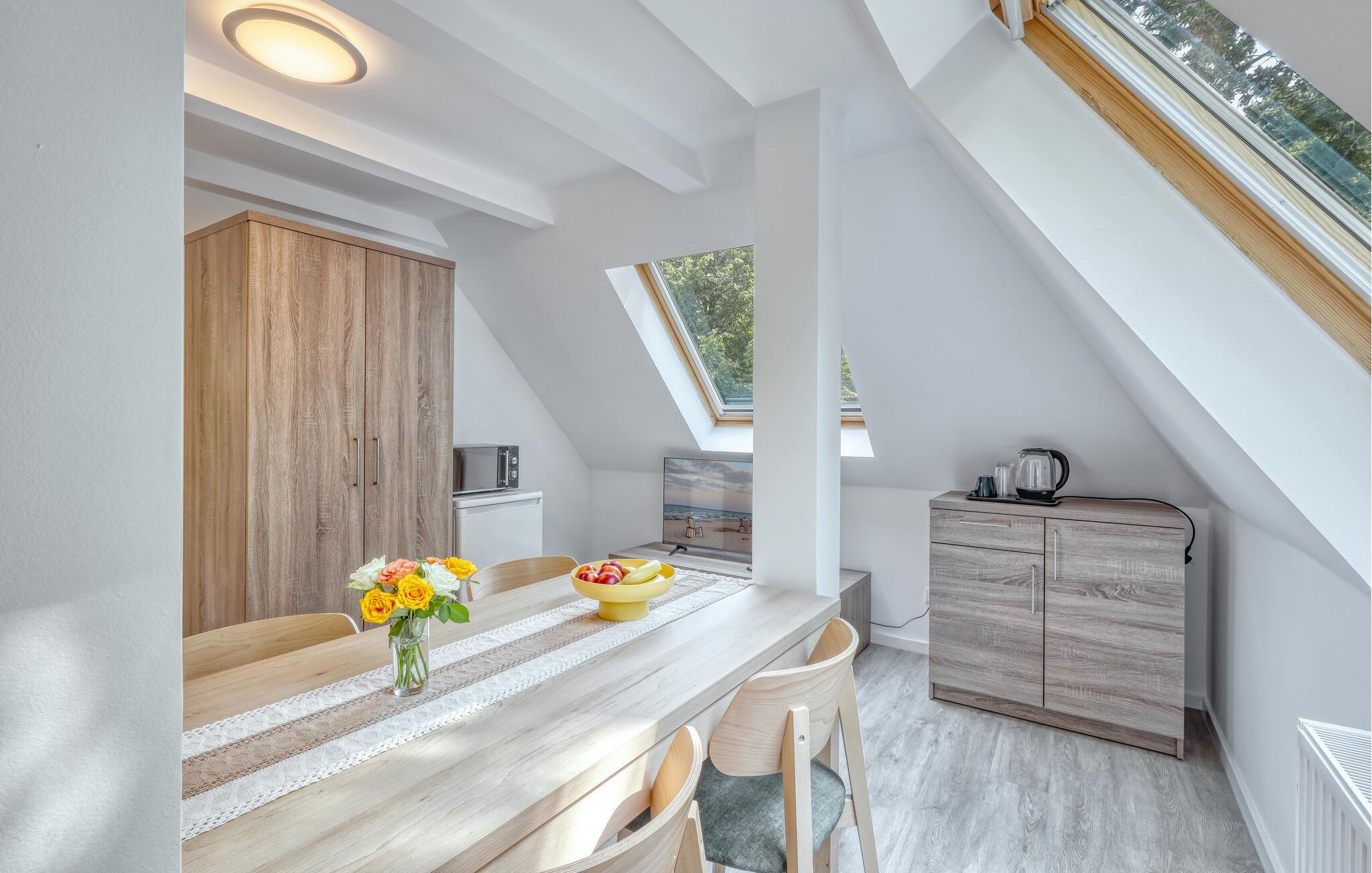 Der er lagt op til nogle fredfyldte dage i denne funktionelle og moderne lejlighed, der ligger nogle få skridt fra den smukke naturstrand. Her er der gode rammer til par, familier eller venner på tur. Feriekomplekset ligger idyllisk placeret mellem fyrreskove og klitter, ideelt til afslappende dage ved havet eller aktiv rekreation midt i naturen. Efter en begivenhedsrig dag kan I vende tilbage til de lyse rum, sætte jer til rette i de behagelige møbler og snakke længe.