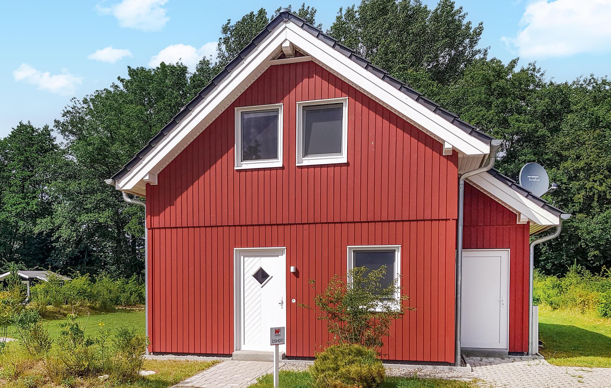 Det rummelige Sonnenblick træhus ligger ikke langt fra badeområdet og imponerer med sin skandinaviske stil og lover dig nok plads til din familie i to etager.