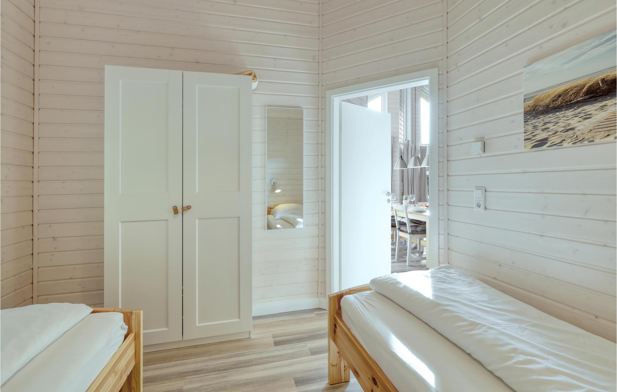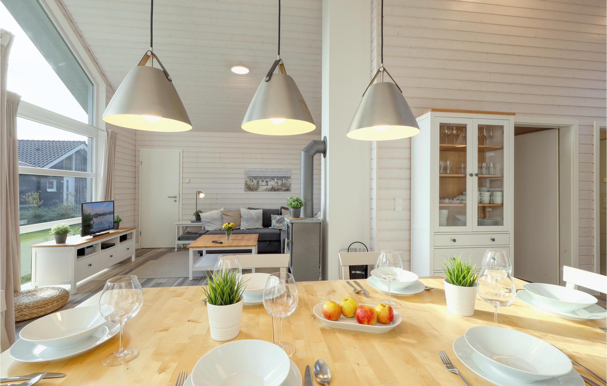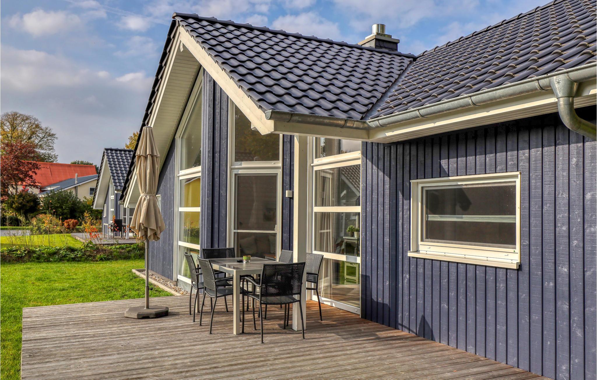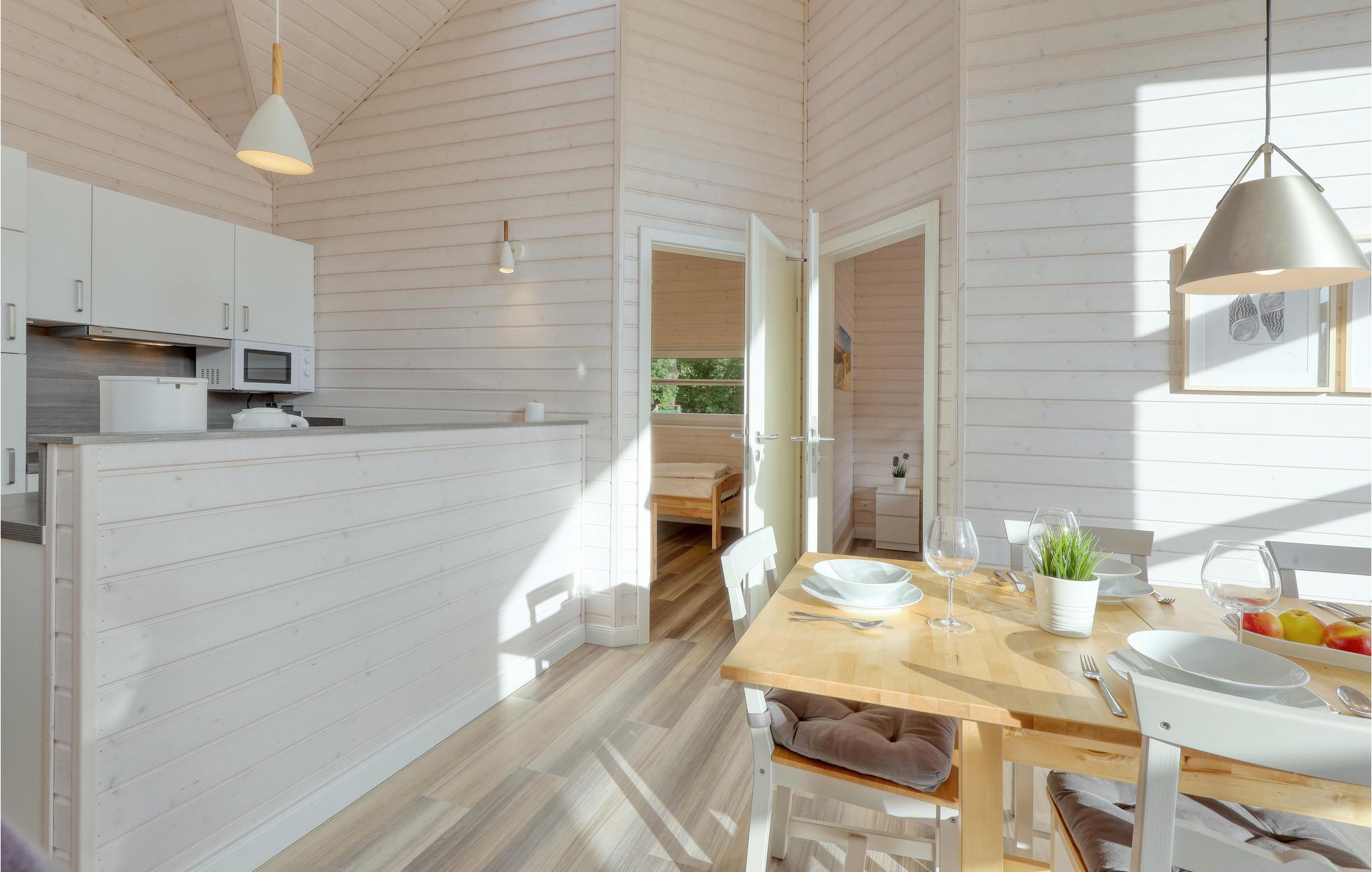 Det moderne træhus "Seezauber" imponerer med sin skandinaviske stil og giver plads til 6 personer. Her kan I nyde en behagelig rumfølelse og lyse rum. De maritime møbler i lyse toner øger komforten.