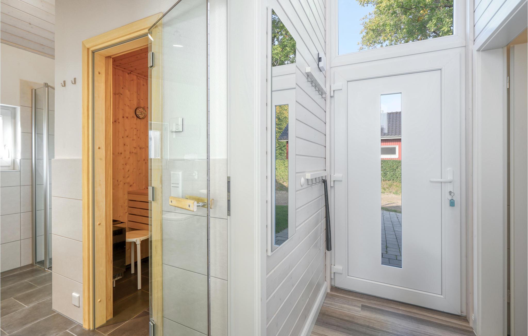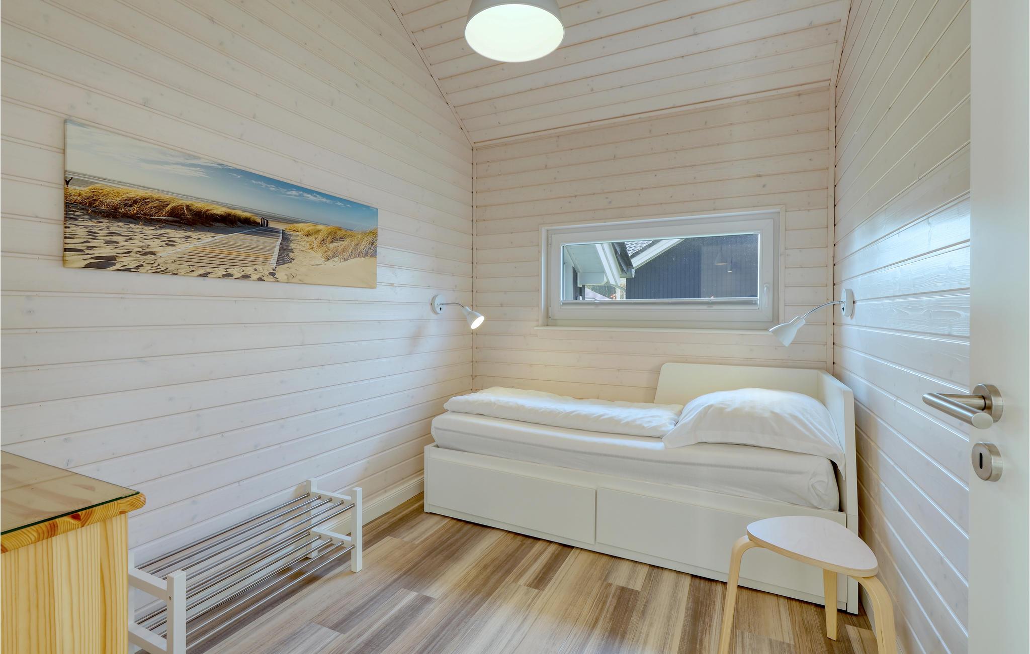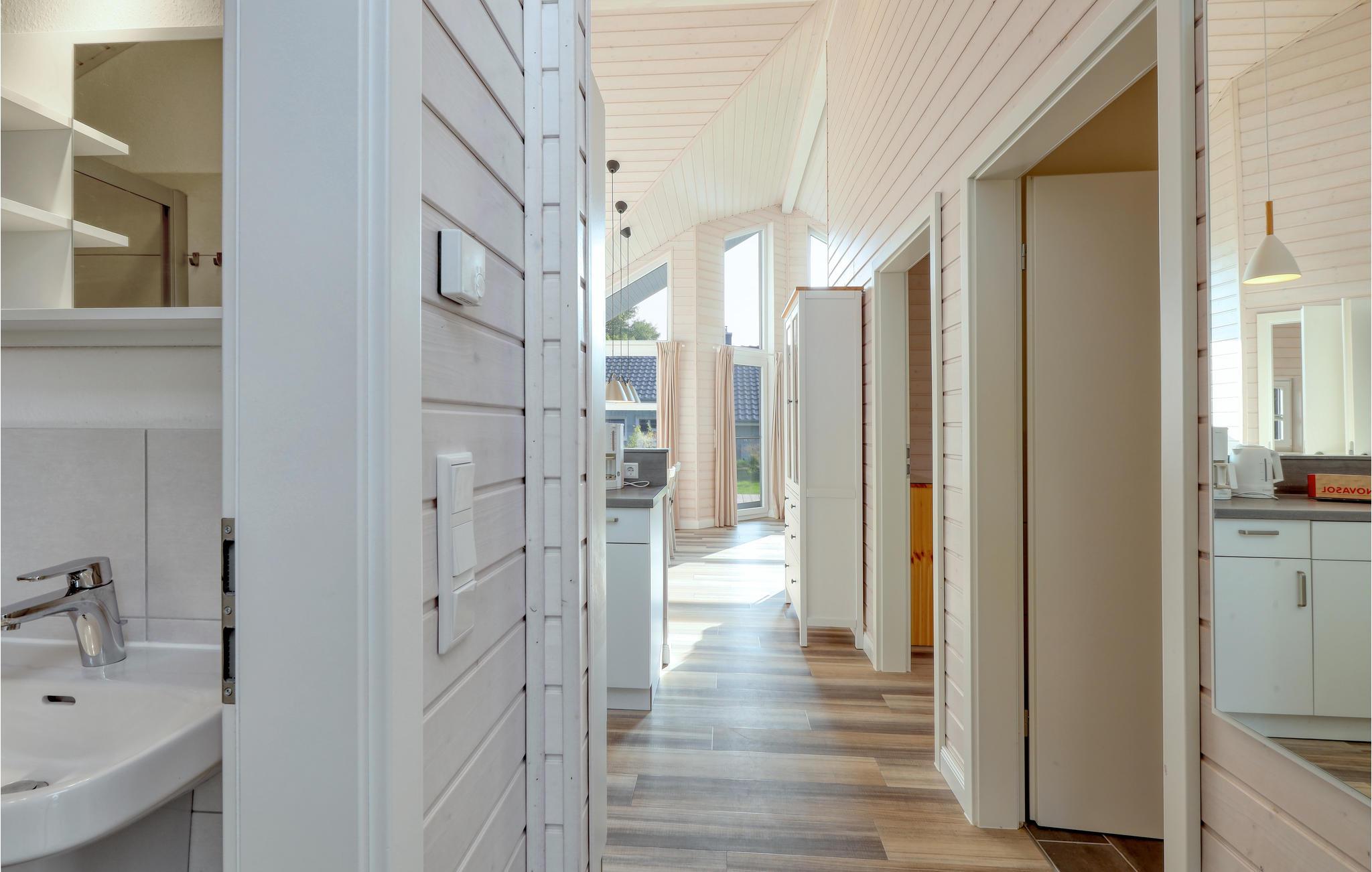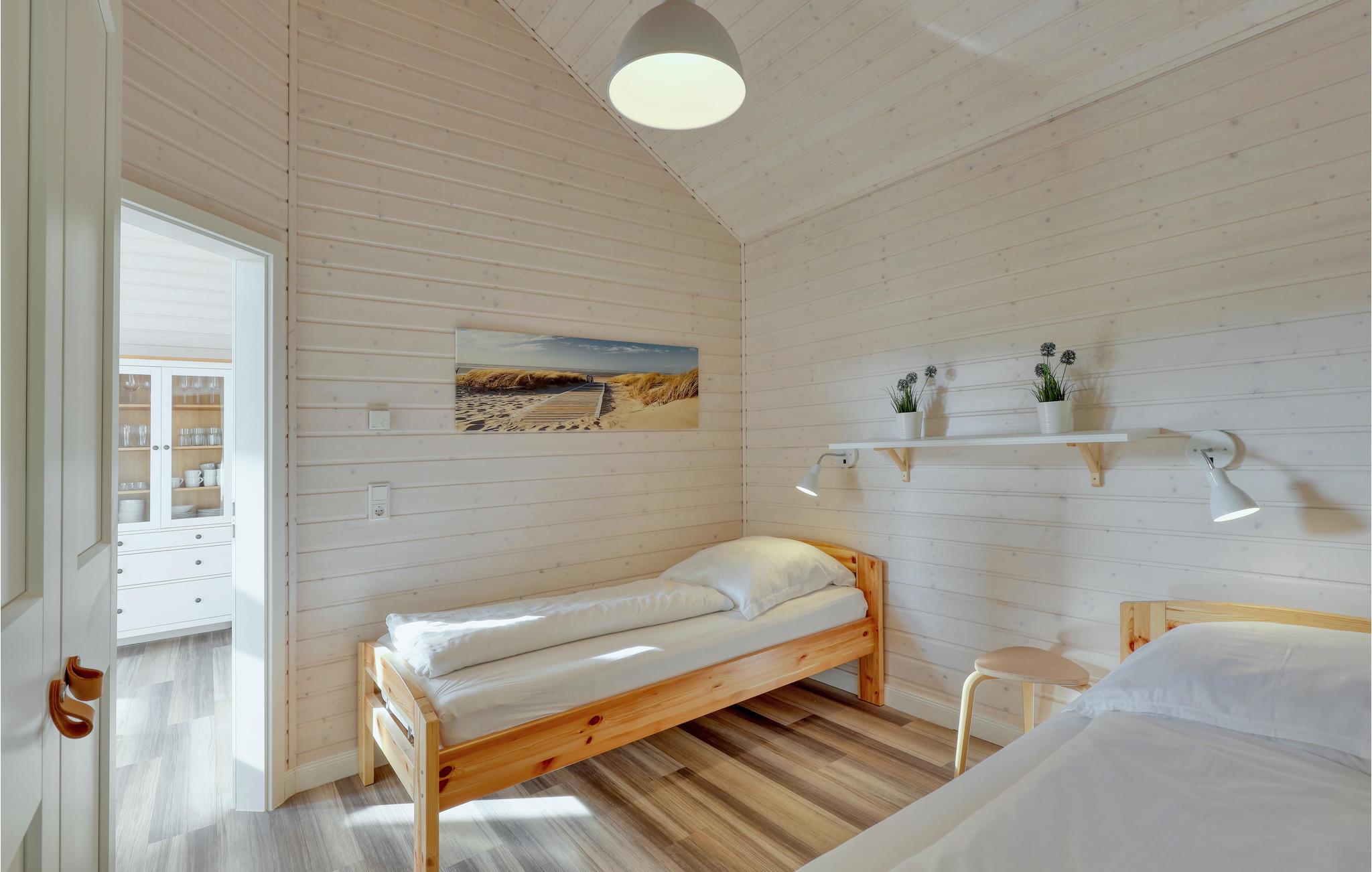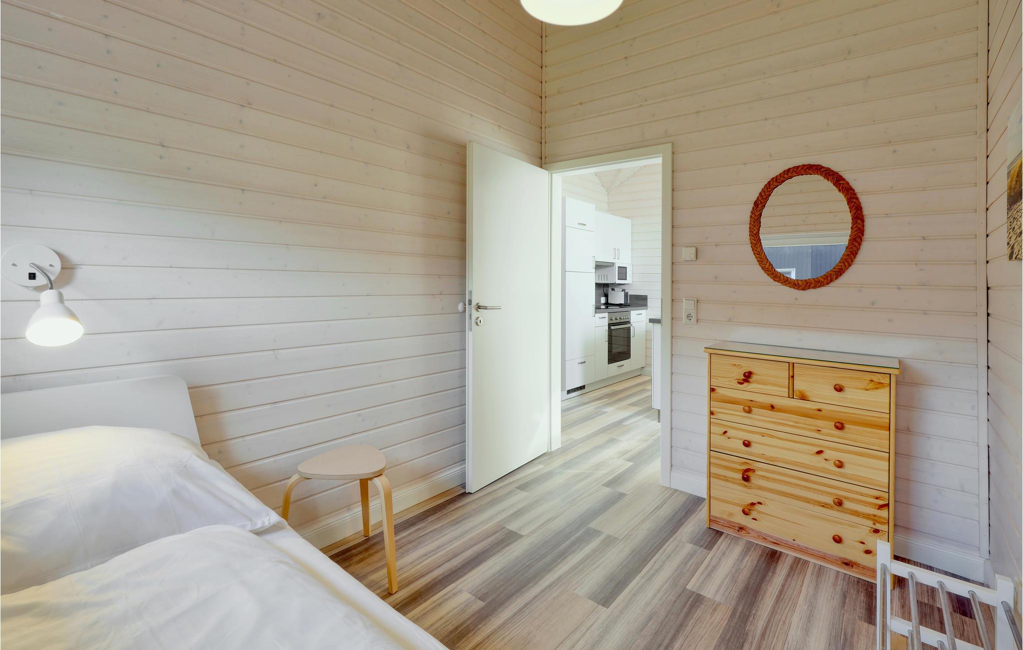 Det moderne træhus "Seezauber" imponerer med sin skandinaviske stil og giver plads til 6 personer. Her kan I nyde en behagelig rumfølelse og lyse rum. De maritime møbler i lyse toner øger komforten.