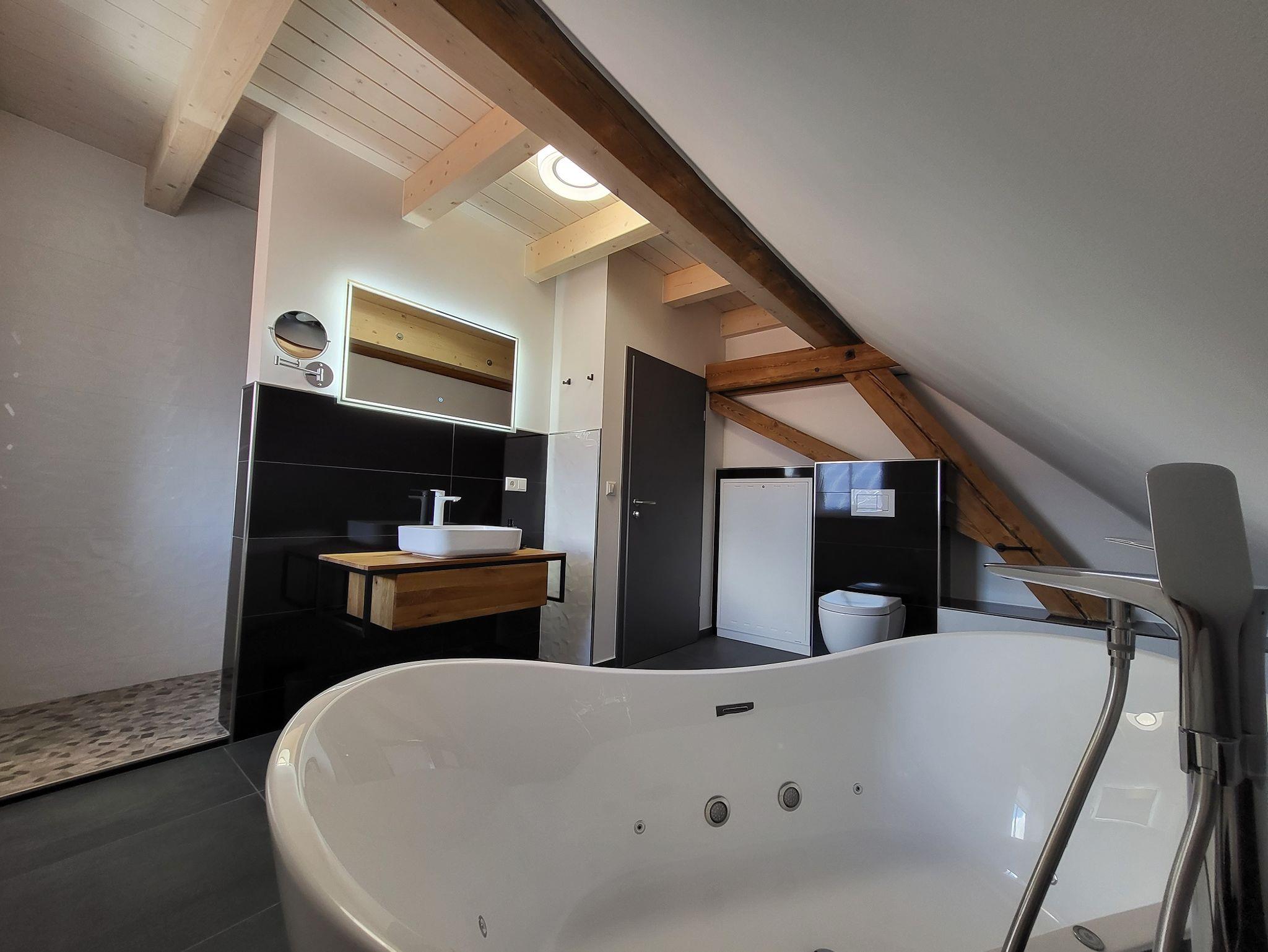 Für das besondere Wohlfühlerlebnis befindet sich im Scheunengebäude ein kleiner Wellnessbereich mit Sauna, Infrarotkabine, Relaxliegen und großer Whirlwanne für 2 Personen. Vom Ruhebereich aus haben Sie Zugang zu einer kleinen Privatterrasse mit Sonnenliegen auf der Sie entspannen können.