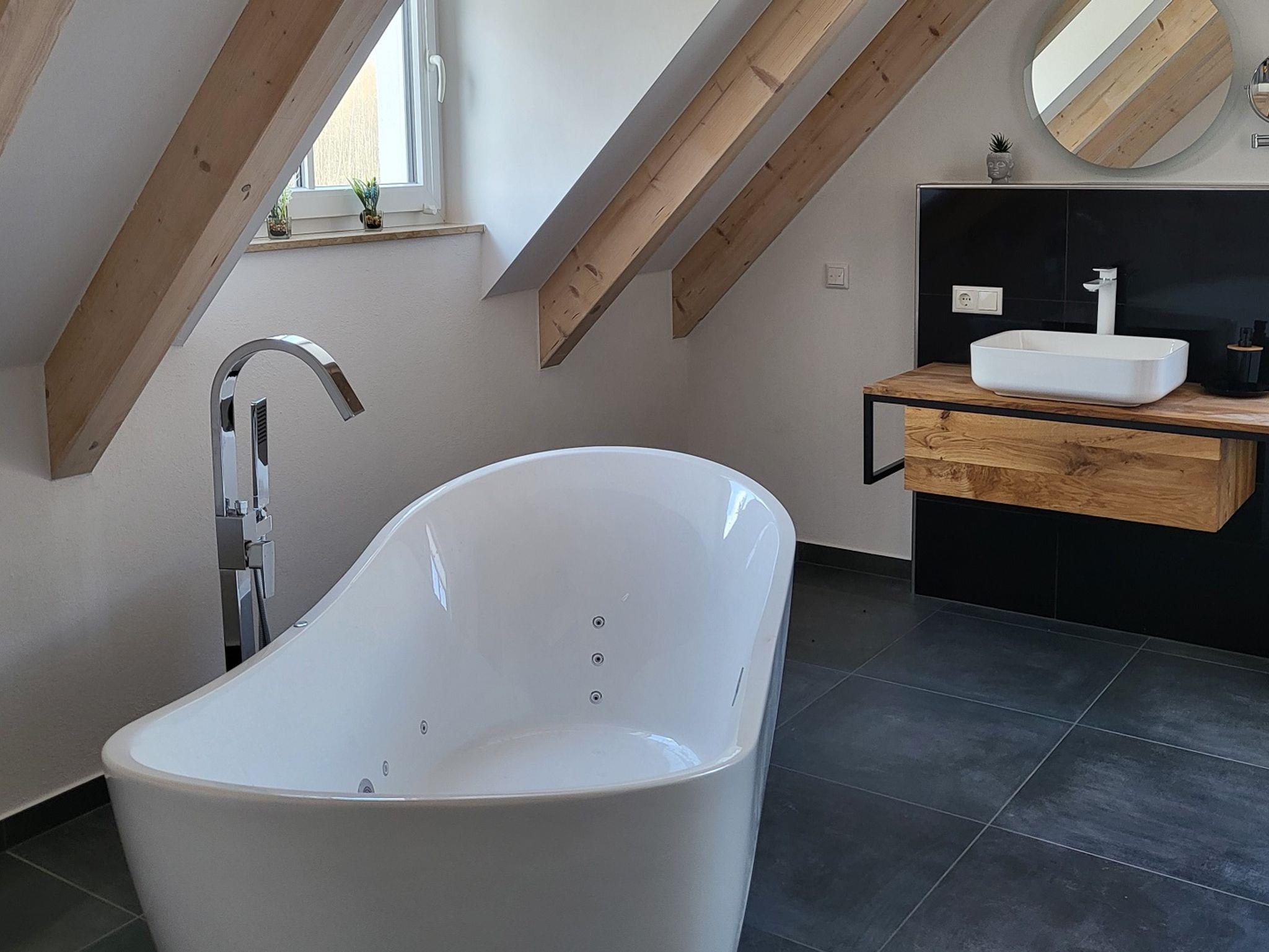 Für einen besonderen Wellnessmoment sorgen die Sauna im unteren Badezimmer, die Whirlwanne im oberen Badezimmer und der Whirlpool auf der großzügigen Terrasse.