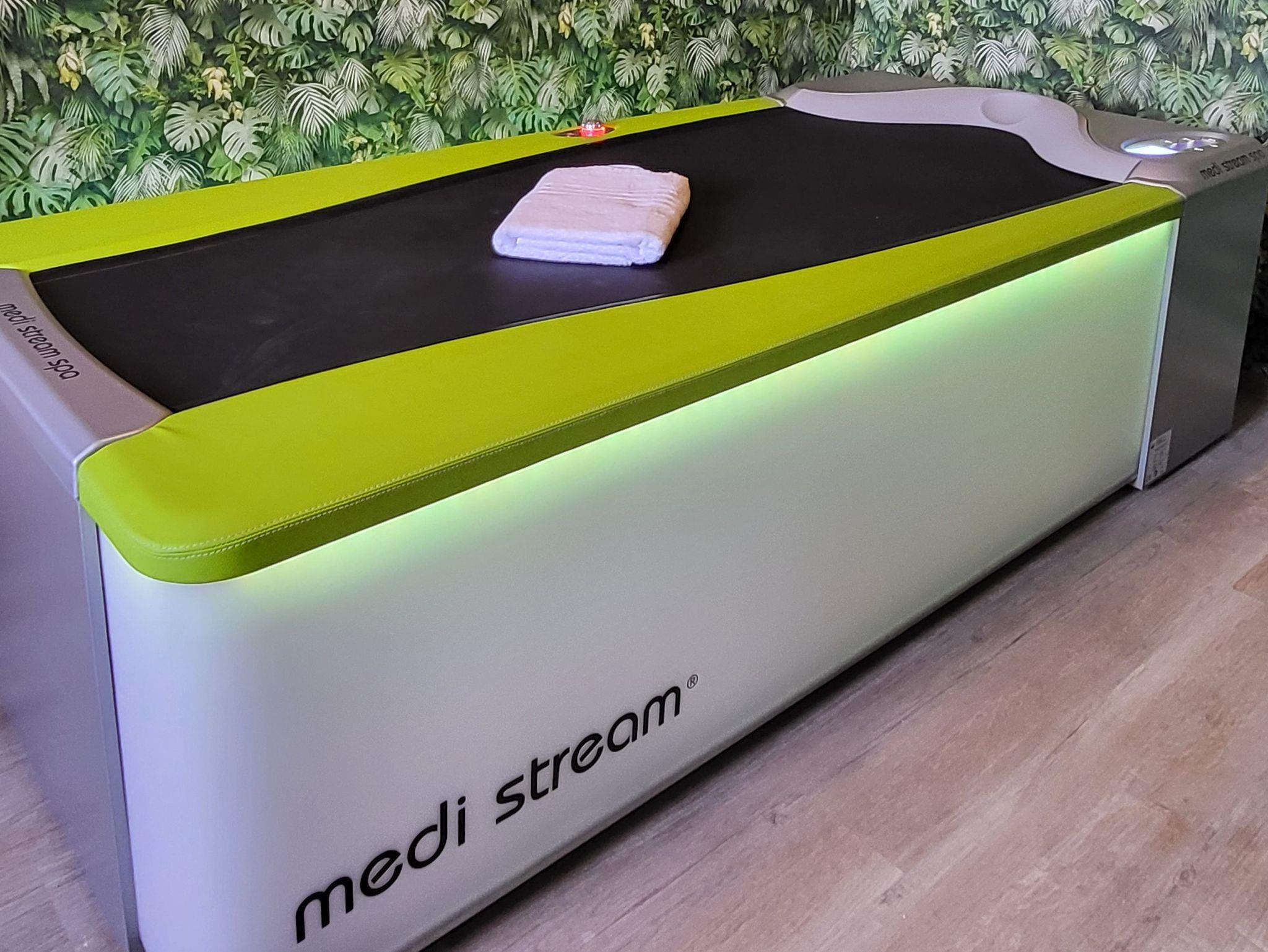 Ein kleines Highlight befindet sich im Dachgeschoss, dort wartet eine medi stream Wasser-Massage-Liege auf Sie. Genießen Sie die aus Reha Kliniken bekannte, wohltuende Massage mit warmen Wasserstrahlen.