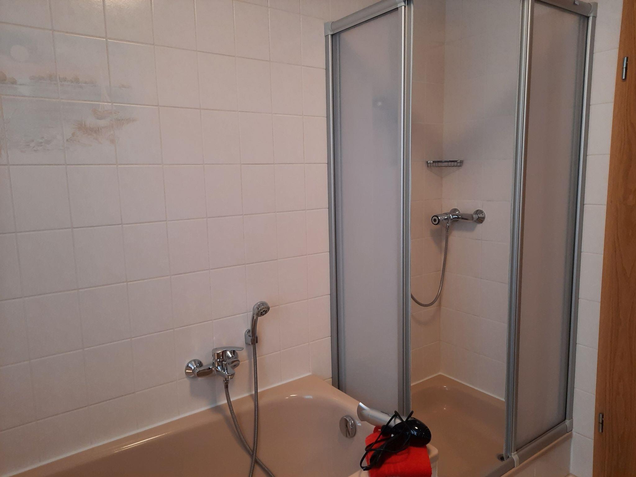 2 Waschbecken, Dusche, Badewanne und Föhn.