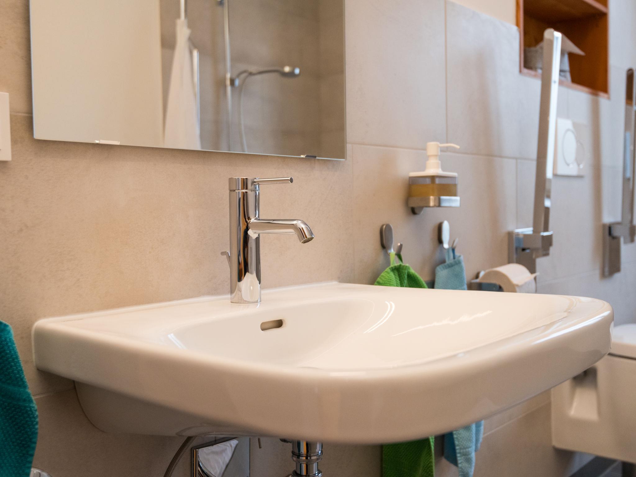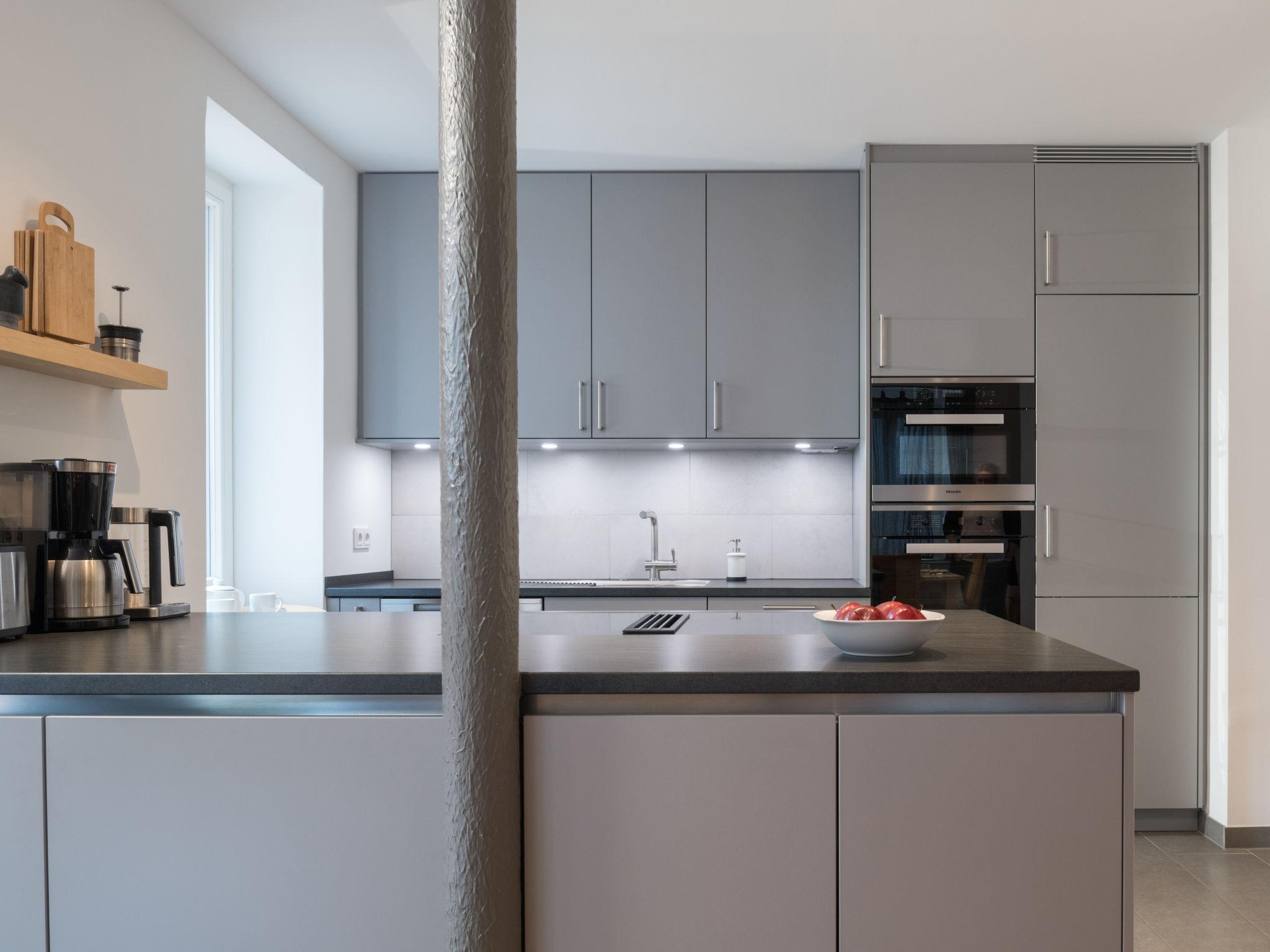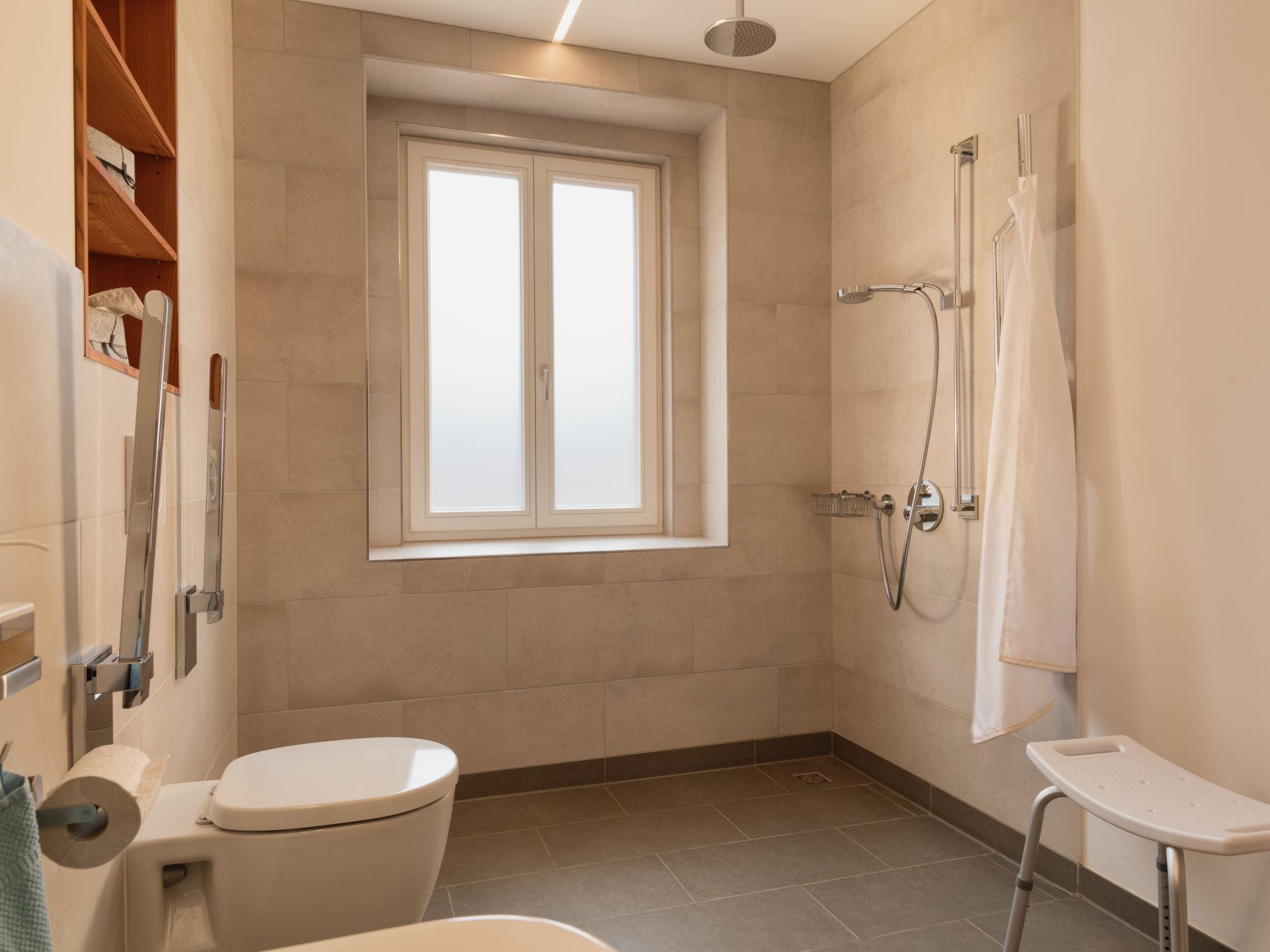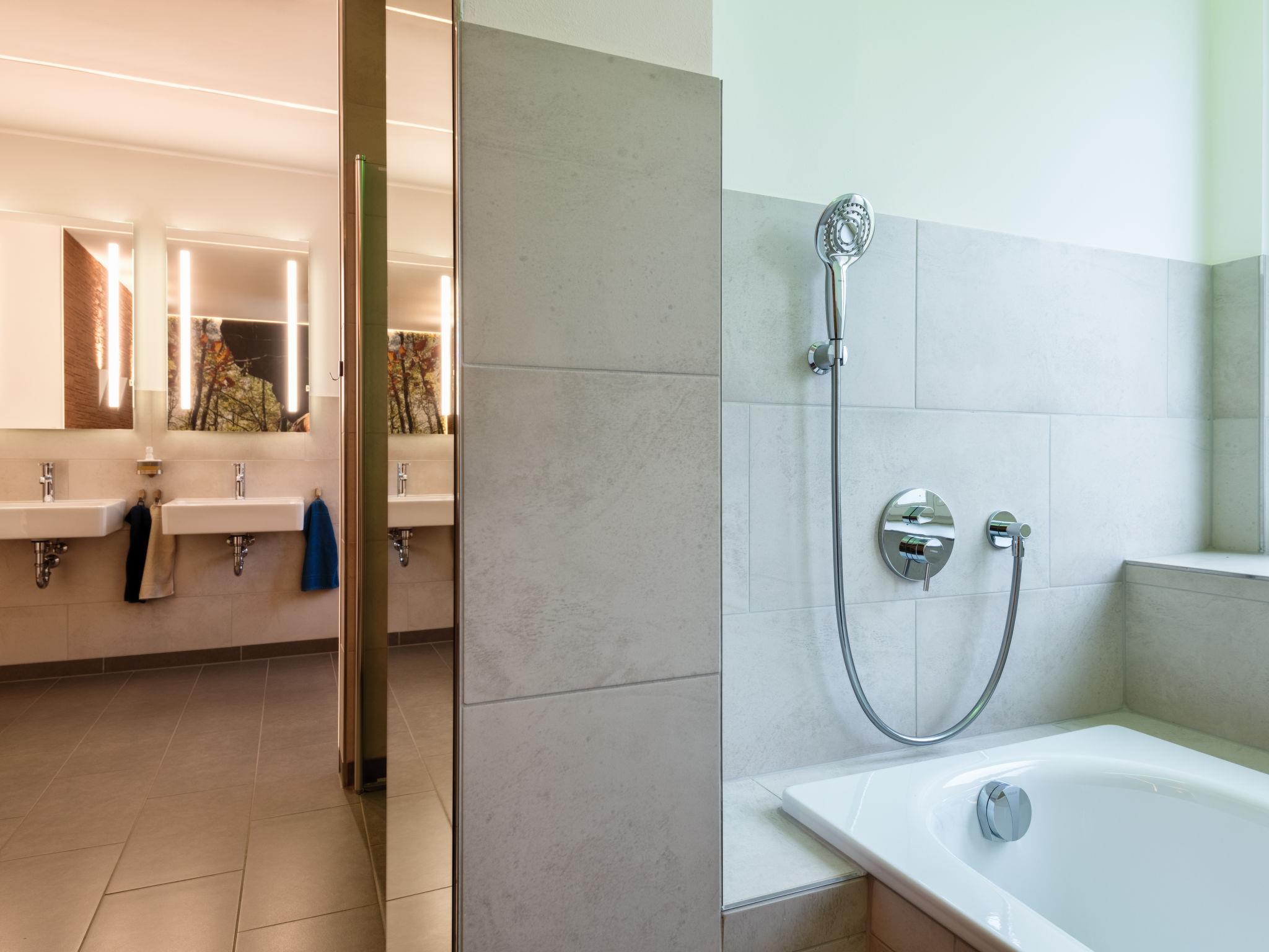 5-room apartment 180 m2, on the ground floor. Bright, fully renovated in 2018, comfortable and modern furnishings: large living room with cable TV (flat screen). Exit to the terrace. 4 rooms, each room with 1 double bed (2 x 90 cm, length 220 cm). Open kitchen (oven, dishwasher, 4 induction hot plates, toaster, kettle, microwave, electric coffee machine) with dining table. Shower/WC, bath/shower/WC. Heating. Solar power. Terrace. Terrace furniture. Facilities: Internet (WiFi, free). Parking (roofed, 1 car). Please note: non-smokers only. Smoke alarm. This apartment is barrier-free and you can enter the house via a ramp. One bathroom is barrier-free. Bookings accepted for holiday purposes only.