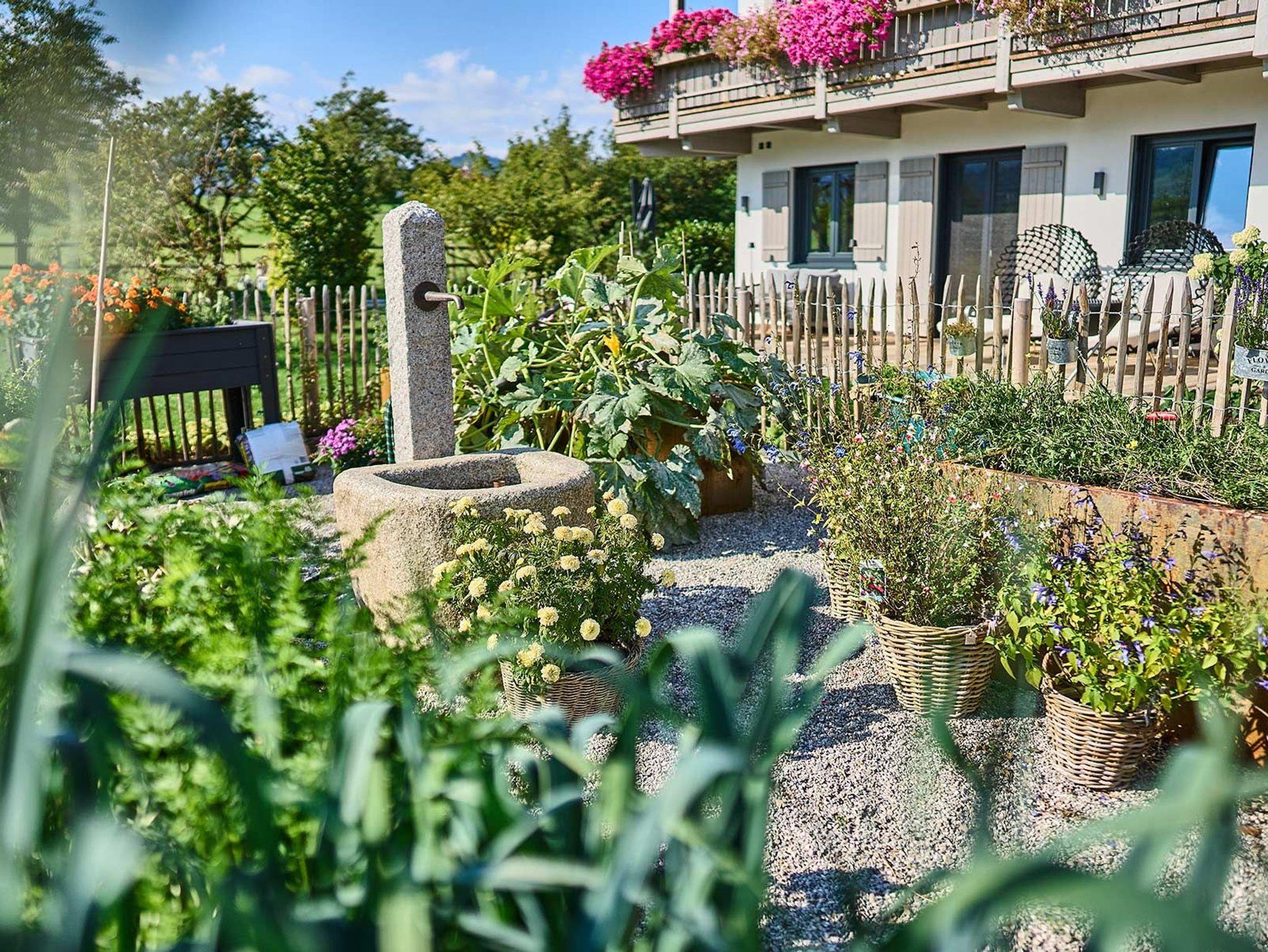 -Der große Gemeinschaftsgarten mit Liegestühlen, Tisch und Bänken sowie einer Outdoor-Lounge mit Panoramablick und Grill steht allen Gästen offen.