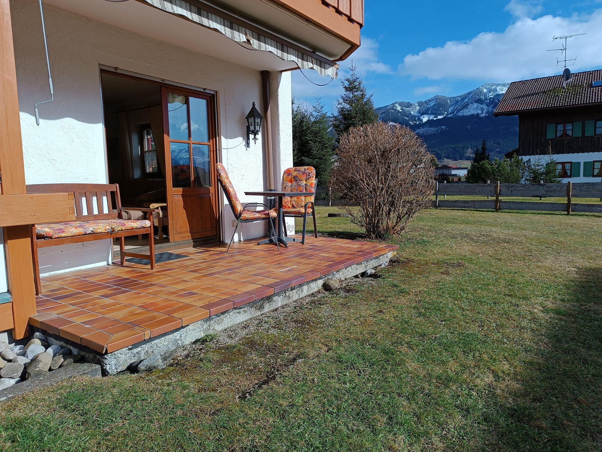 Die Ruhe und Aussicht der Ferienwohnung Hörnerblick werden Sie begeistern. Sie liegt absolut ruhig am Ortsrand von Fischen auf einer kleinen Anhöhe. Von der Terrasse und dem Garten hat man freie Sicht über den Kurort Fischen, auf den Alpenhauptkamm im Süden und die Berge der Hörnergruppe im Westen.