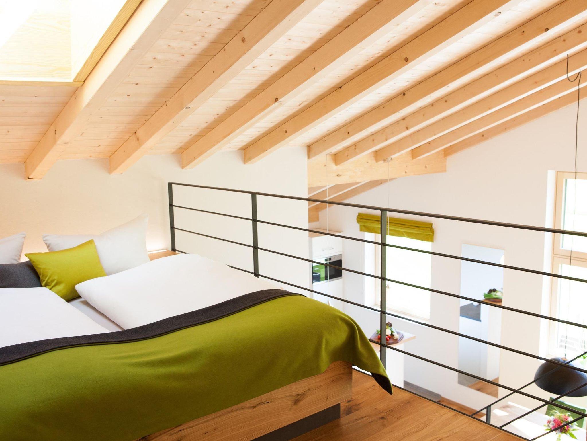 Unsere Dachgeschosswohnung „Weitblick“ ist bester Bemühung, ihrem Namen gerecht zu werden. Bereits beim Betreten bietet sich Ihnen ein wunderschöner Süd-Ost-Ausblick in die Berge für einen traumhaften Start in den Urlaub. Verteilt auf zwei Ebenen finden Sie hier hoffentlich alles, was Sie für Ihren Urlaub benötigen. Die Küche, der angrenzende offene Wohn- und Essbereich sowie das gemütliche Schlafzimmer und das kleine Spa-Erlebnis mit Sauna und Regendusche im Bad finden Sie auf der unteren Etage. Auf der Galerie finden Sie ein gemütliches Doppelbett sowie einen Sessel zum entspannen und lesen.