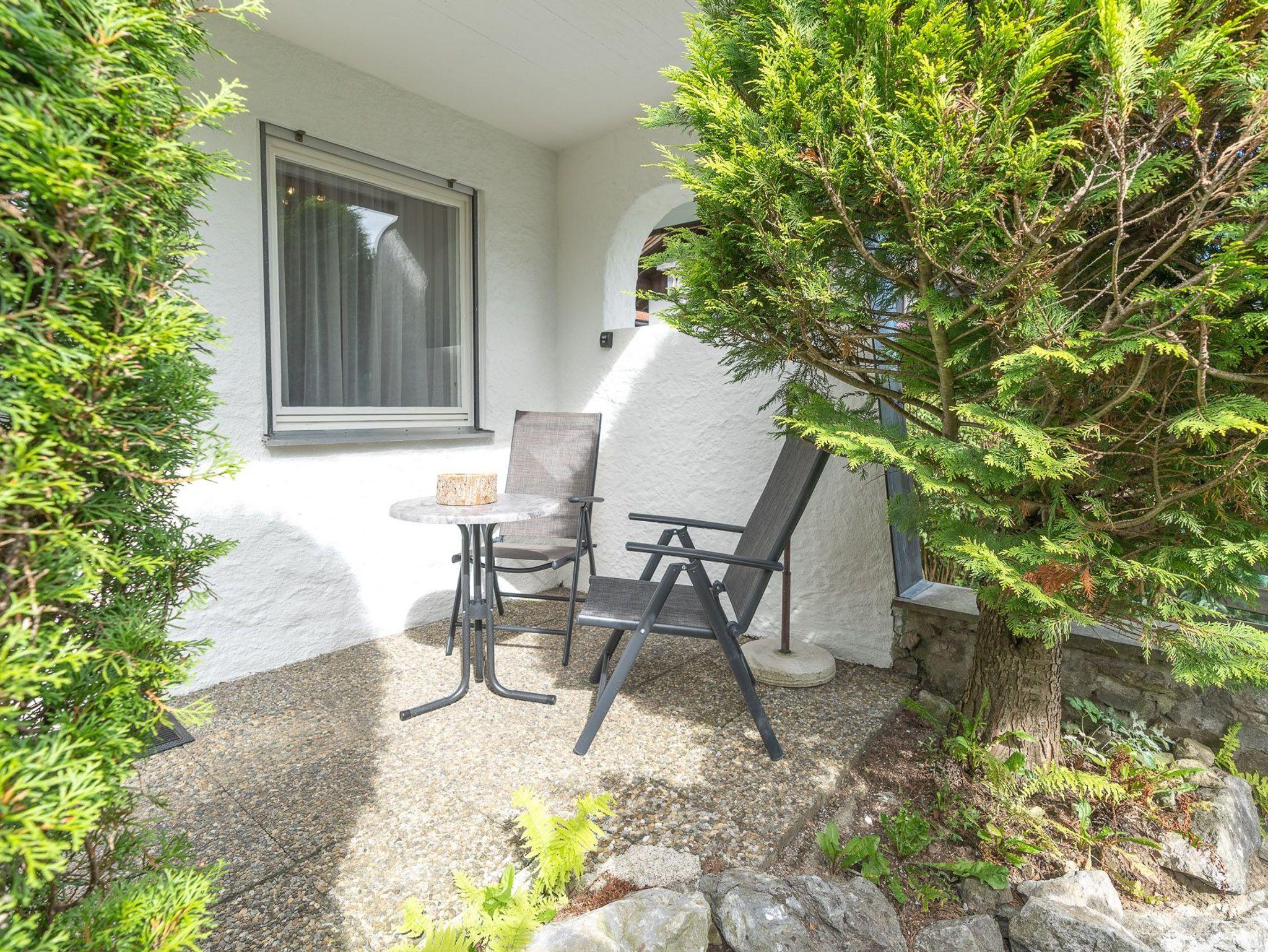 Hier finden Sie eine kleine, schnuckelige, im Erdgeschoß befindliche Ferienwohnung vor. Im Wohnbereich lädt ein Sofa zum Verweilen ein. Ebenso befindet sich hier das Doppelbett 160 / 200 und ein Esstisch mit 3 Sesseln. Von hier aus gelangen Sie auf die Terrasse und können die ruhige Lage und die schöne Aussicht genießen. Dem Wohnbereich schließt sich ein kleiner Raum an, welcher mit einem Schreibtisch, einem Regal und ausreichend Stauraum für Ihre Urlaubsgarderobe ausgestattet ist. Die kleine Küche ist kpl. ausgestattet und die technischen Geräte erleichtern Ihnen die Arbeit, so dass die Zubereitung einer Mahlzeit auch ein Vergnügen sein kann. In dem freundlichen Bad finden Sie eine Dusche, WC, Föhn und eine Handtuchheizung vor.