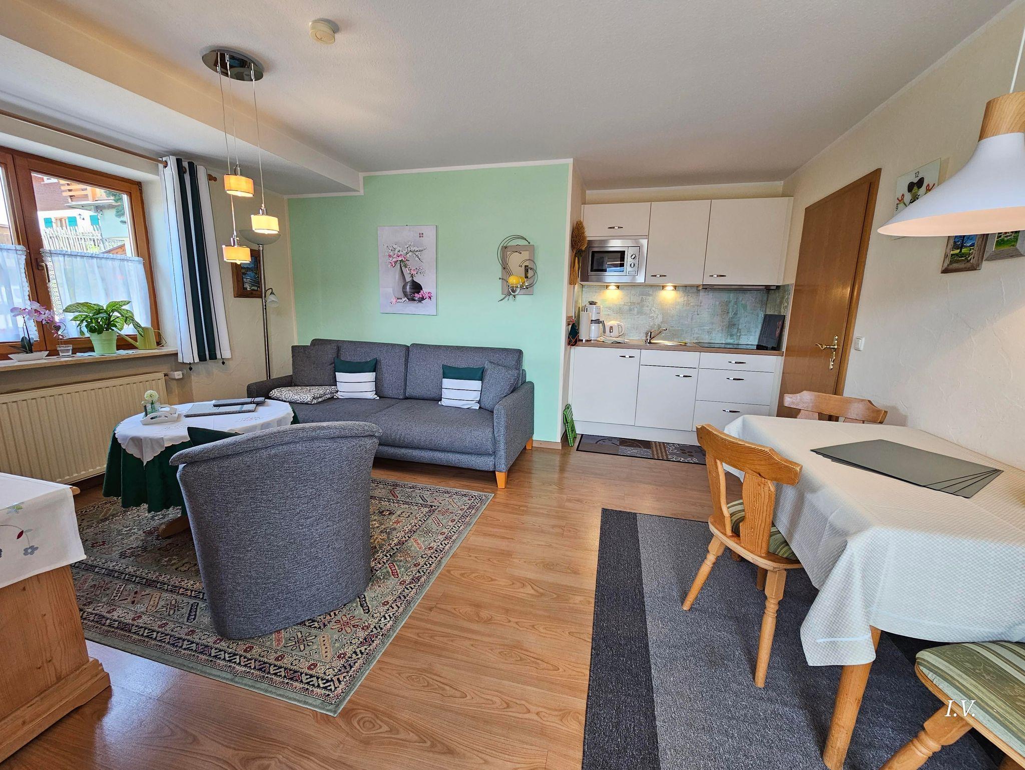 Unsere kompakt-wohnliche und in grünem Ambiente ebenfalls ländlich eingerichtete Erdgeschoss-Wohnung mit komplett ausgestattetem Kochbereich bietet zusätzlich eine schön eingewachsene Terrasse für Ihre ganz private Erholung, vom Frühstückskaffee bis zum Glas Rotwein vor dem „Zu-Bett-Gehen“ werden Sie sich hier wohl fühlen und die Urlaubstage genießen.