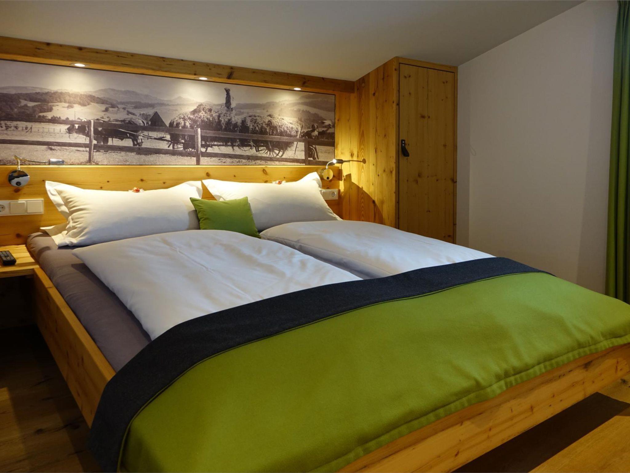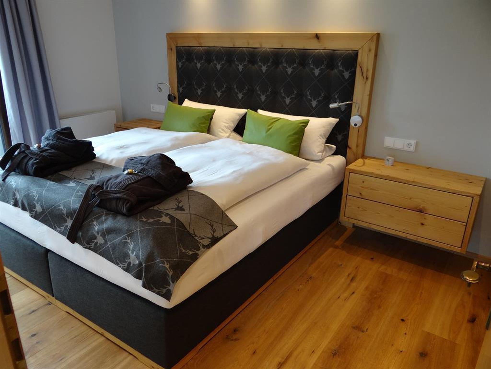 Zeitlos schön verbindet unser Appartement Sonnenkopfblick Tradition, Luxus und Komfort: 81 qm, 2 separate Schlafzimmer, 2 Bäder, Mini Spa (Sauna und Rainshower), großzügiger Wohnraum mit Essplatz und offener Küche mit Theke. Der Ausbau wurde mit Altholz gemacht und mit alten schwarz-weiß Fotografien kombiniert. Das Appartement verfügt zudem über einen Ost- und einen Südbalkon mit Blick in die Berge.