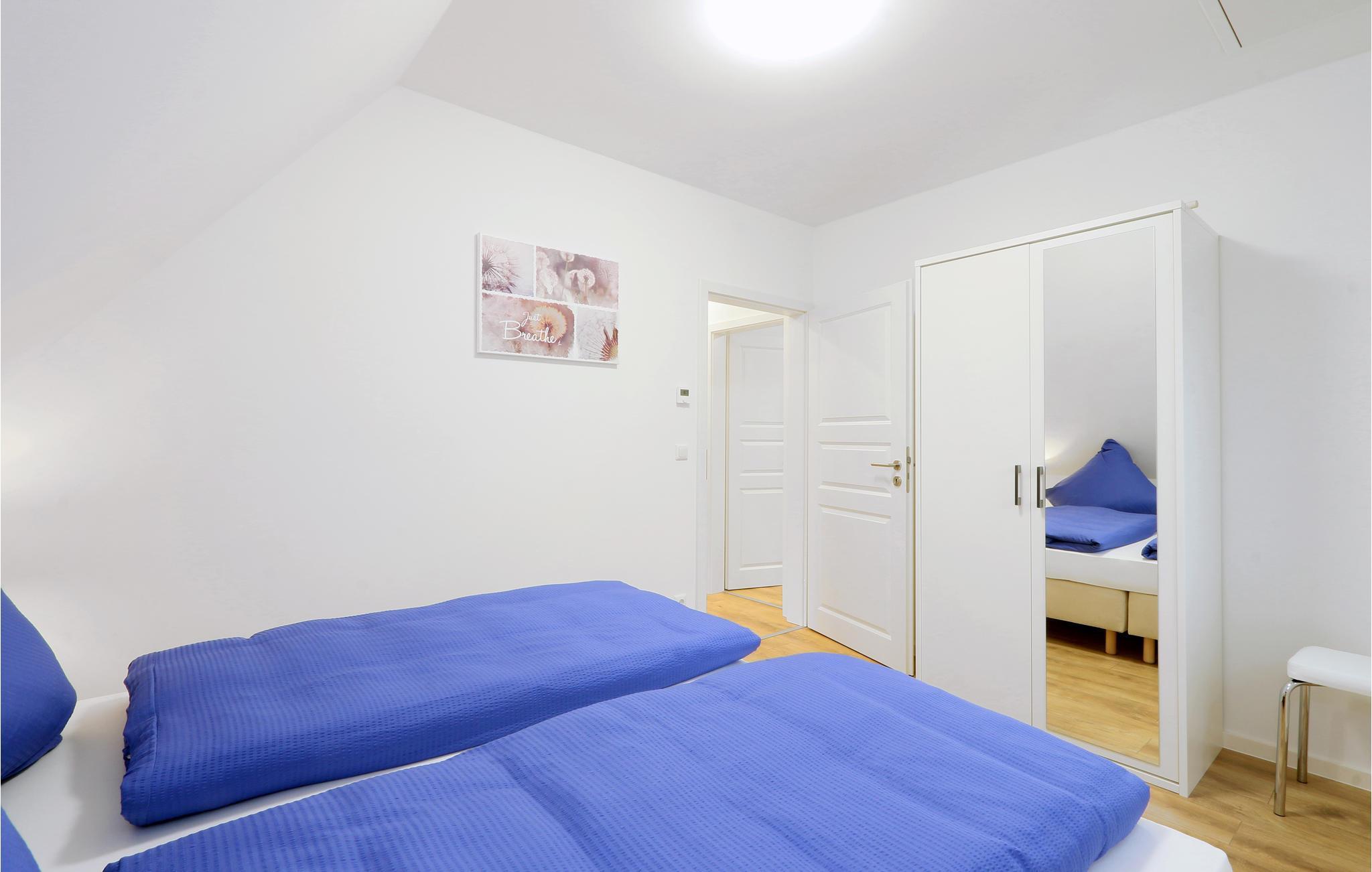 Det veludstyrede halve dobbelthus er fordelt over to etager med en moderne og venlig indretning. Fra det kombinerede stue-/køkkenområde går I ud på terrassen, hvor I kan nyde de mange solrige timer under ferien. En grill til dejlige grillaftener står til jeres rådighed. På kølige dage kan I gøre brug af saunaen og få varmen eller sætte jer foran brændeovnen. I det ene af de to soveværelser findes en dobbeltseng, i det andet findes to enkeltsenge.