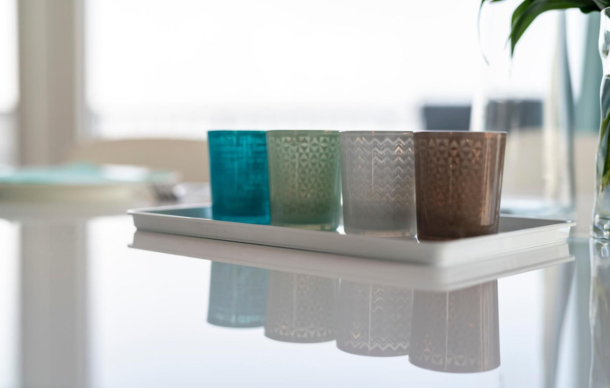 Sommerhusets stue/spisestue er oversvømmet med lys og har gulv til loft vinduer, der fører til de tilstødende terrasser på begge sider. Fantastisk udsigt åbner op på terrassen, der støder op til spisepladsen med udsigt over den brede Slei. Sejlskibe, der passerer forbi, sørger for underholdning under en hyggelig grillfest eller en romantisk middag i levende lys. På ferien er der tid til kreativ madlavning, det fuldt udstyrede køkken-alrum lader intet tilbage at ønske. Morgenmad lige ved havet, ren feriefølelse.