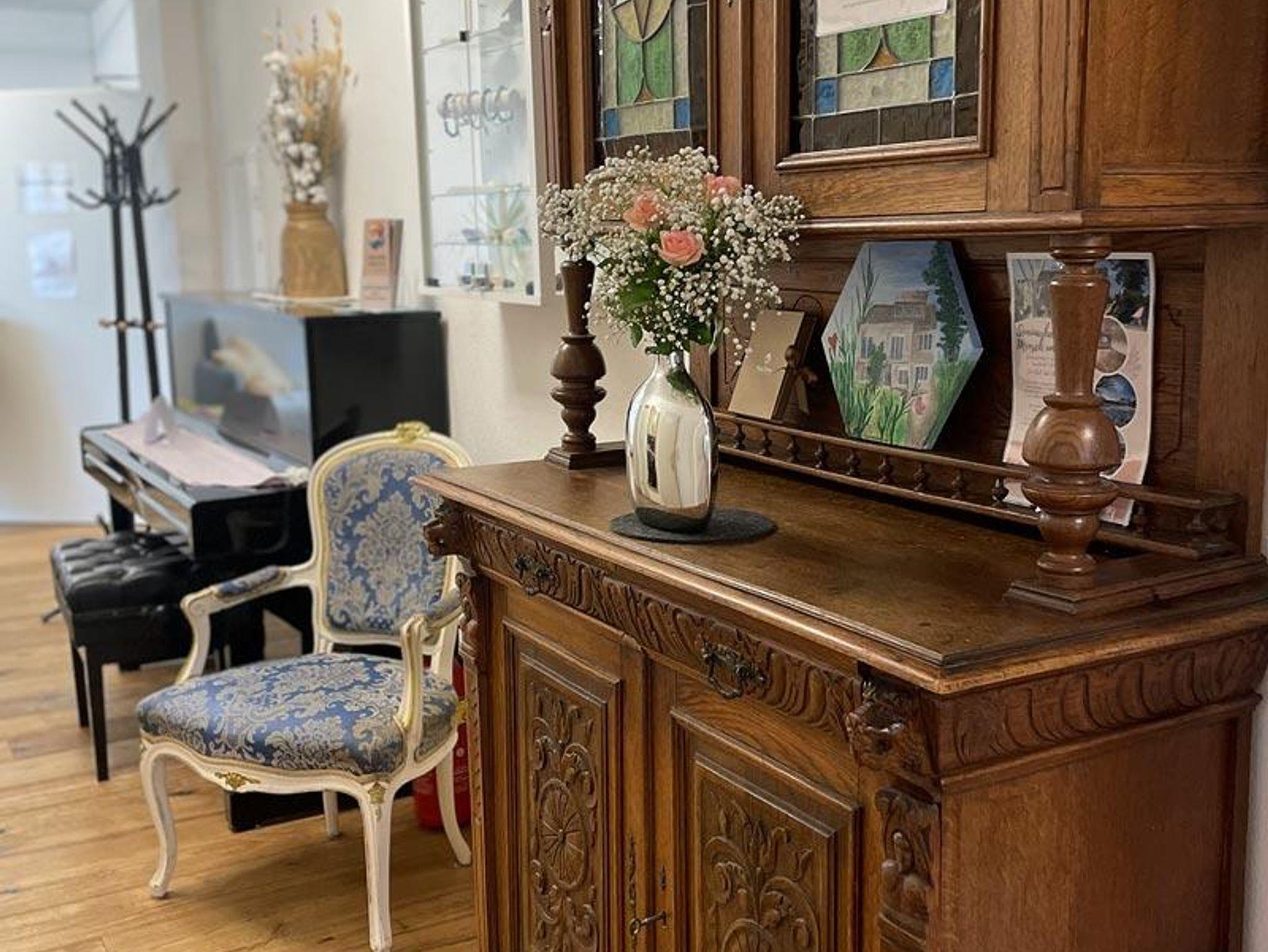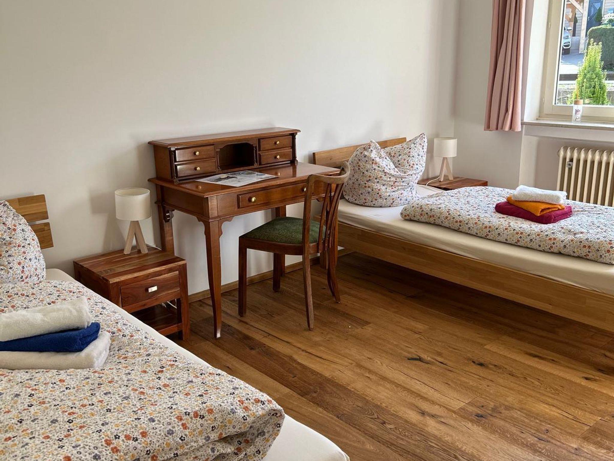 Zimmer Ahorn ist liebevoll und individuell getstaltet. Es liegt in richtung Nordwest und hat zwei Einzelbetten. Ebenso mit Tisch, Stühlen und einem Waschbecken ausgestattet. Das BAdezimmer befindet sich im Flur.