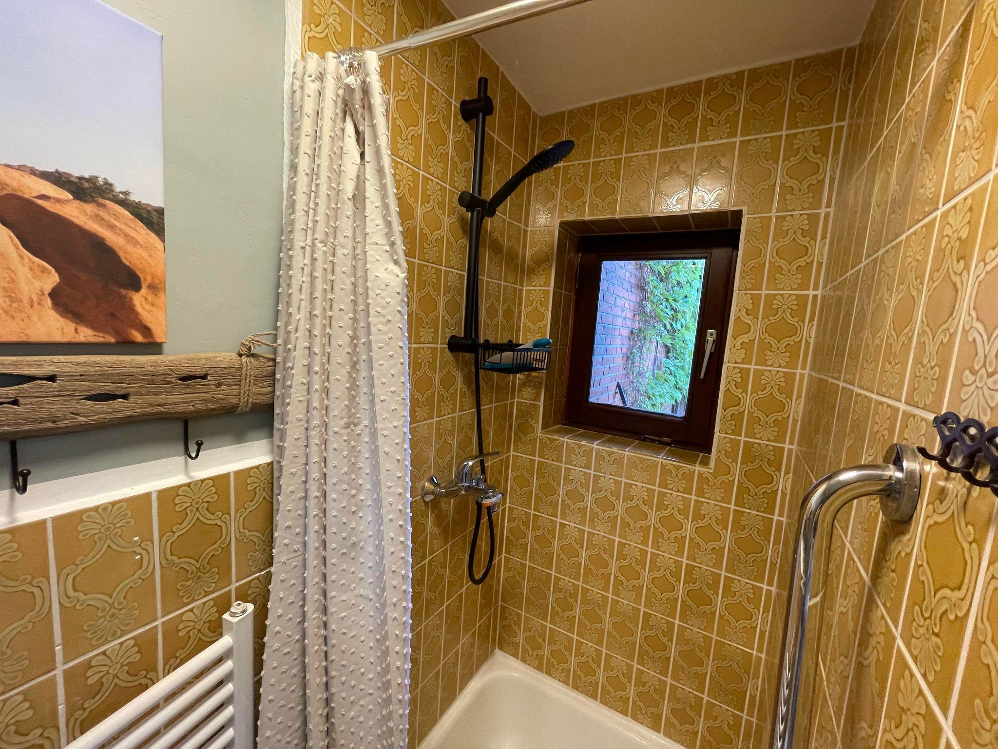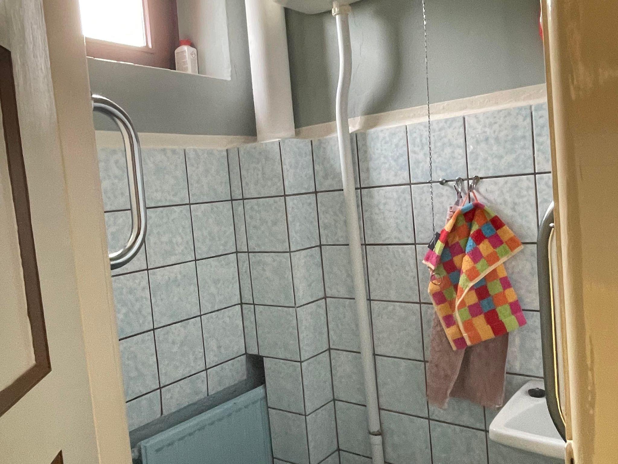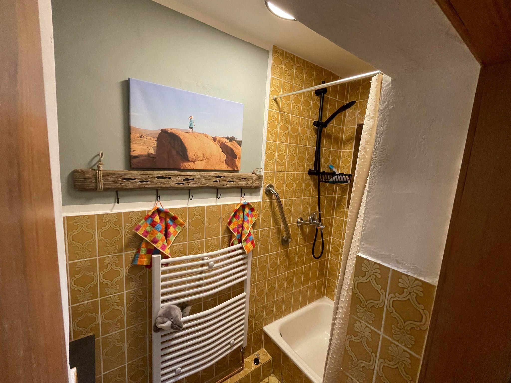 Das Badezimmermit Dusche und Waschbecken ist von der Toilette getrennt, was für zusätzlichen Komfort sorgt.