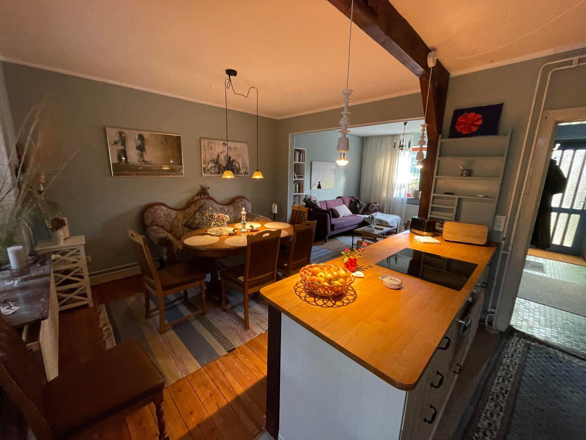 Der offene Wohnbereich umfasst ein Wohnzimmer, ein Esszimmer und eine voll ausgestattete Küche. Hier können Sie gemeinsam entspannen, kochen und Ihre Mahlzeiten genießen. Die Einrichtung ist ansprechend und sorgt für eine angenehme Atmosphäre.