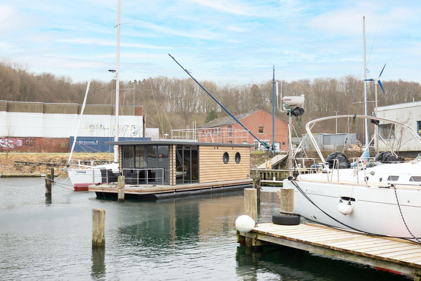 Luxus-Auszeit auf dem Hausboot in Flensburg: Genießen Sie das besondere Ambiente des schwimmenden Ferienhauses und verbringen Sie einen unvergesslichen Urlaub auf dem Wasser - Sie werden begeistert sein.
