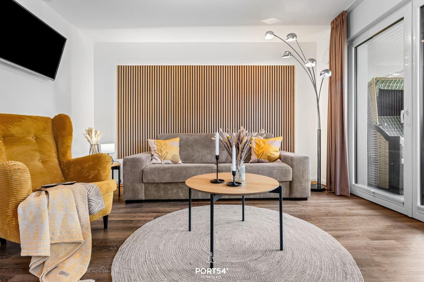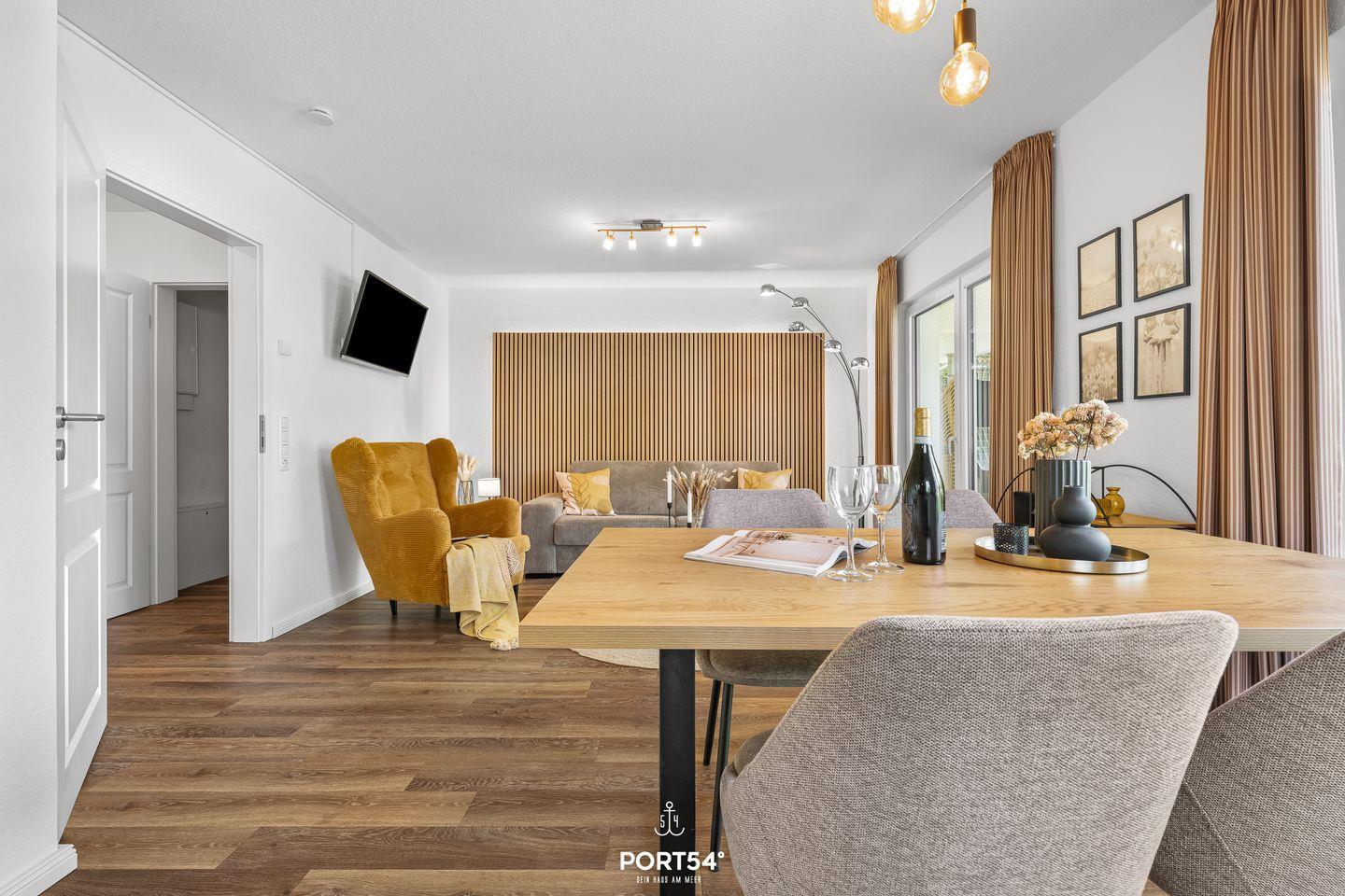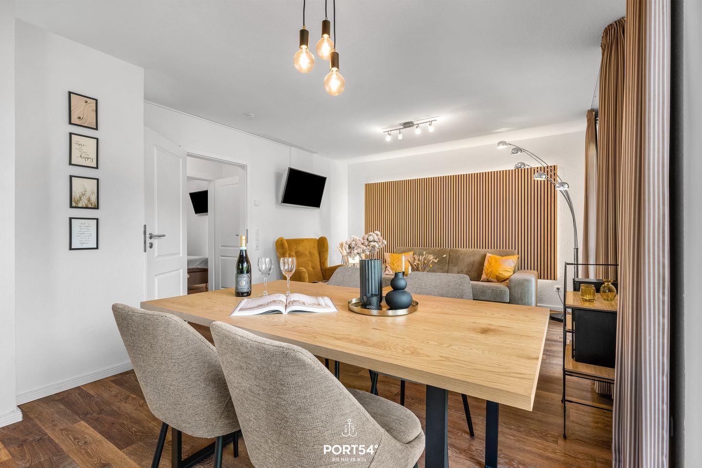 Das Hier und Jetzt genießen. Das ist in dieser Ferienwohnung einfach, denn mit klaren Linien, warmen Farben und moderner Ausstattung verbindet die Wohnung stilvolles Design mit echter Herzlichkeit. Große Fenster holen Licht und Meeresluft ins Haus, während du auf dem Sofa, der Terrasse oder beim Frühstück am großen Esstisch das Gefühl hast: Hier ist Zuhause.