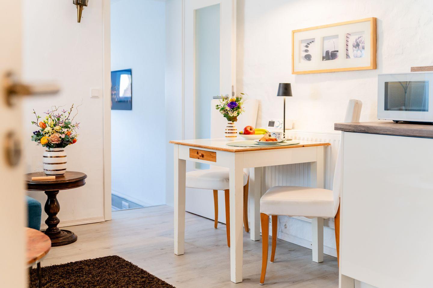 Im Hinterhof befindet sich ein kleiner Bistrotisch mit Stühlen, die bei schönem Wetter gerne genutzt werden dürfen.