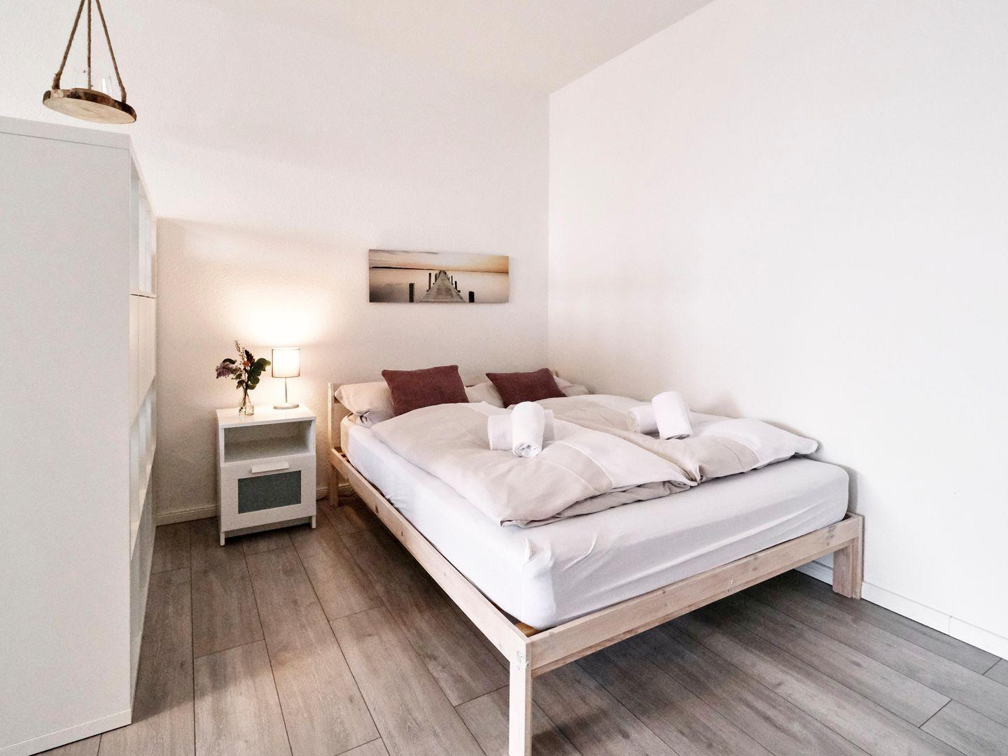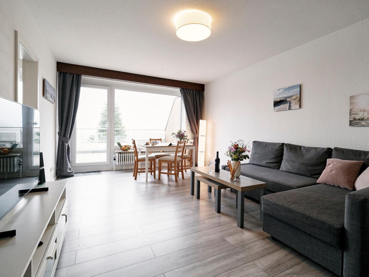 Diese Ferienwohnung verfügt über einen Balkon, ein Wohnzimmer in dem auch das 140x 200 cm Bett steht, mit einem Raumtrenner vom Sofabereich getrennt.