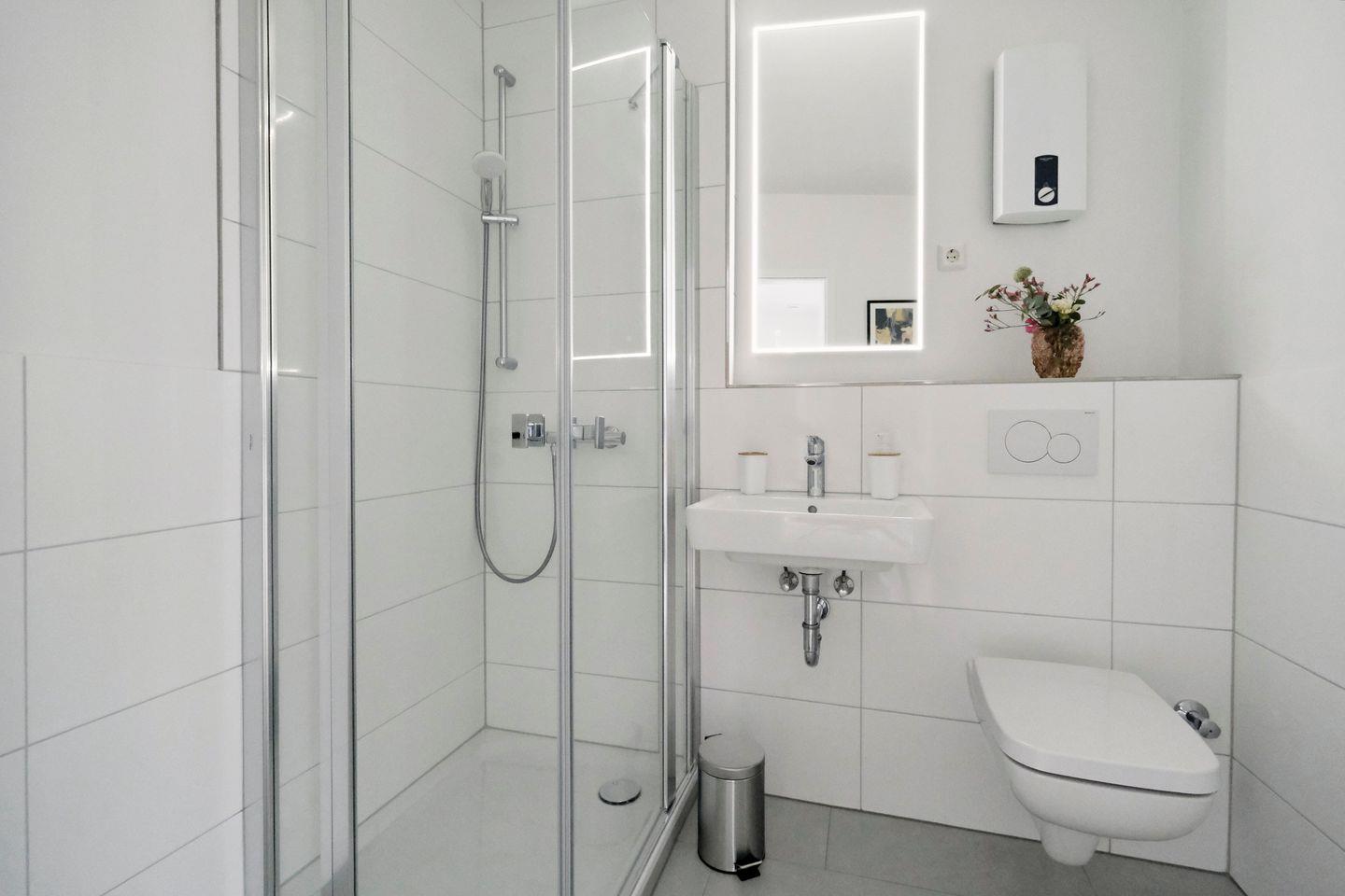 Das Badezimmer ist mit einer Dusche ausgestattet und wurde kürzlich erst neu renoviert. Die schicke, gut ausgestattete, schwarze Küche lädt zum gemeinsamen Kochen ein.