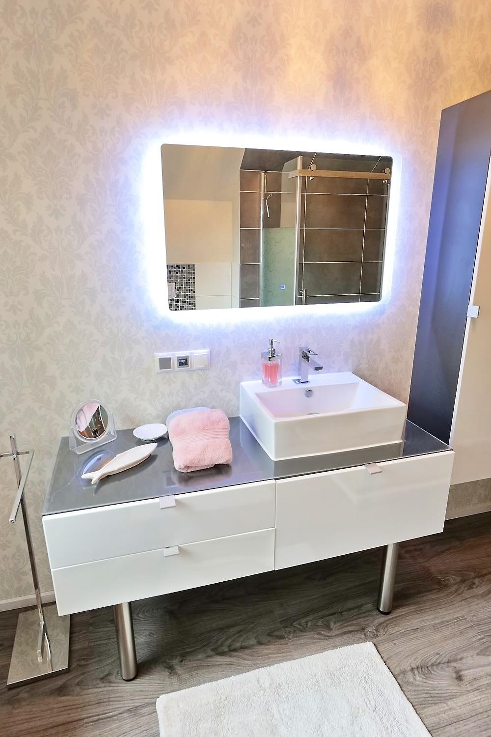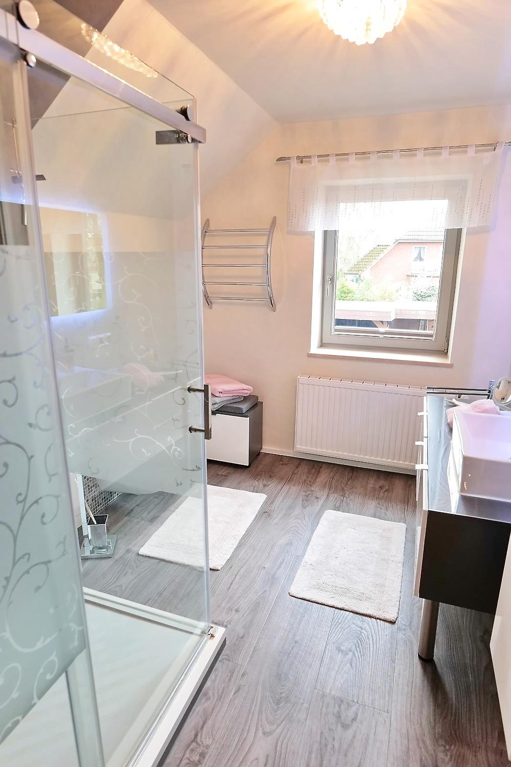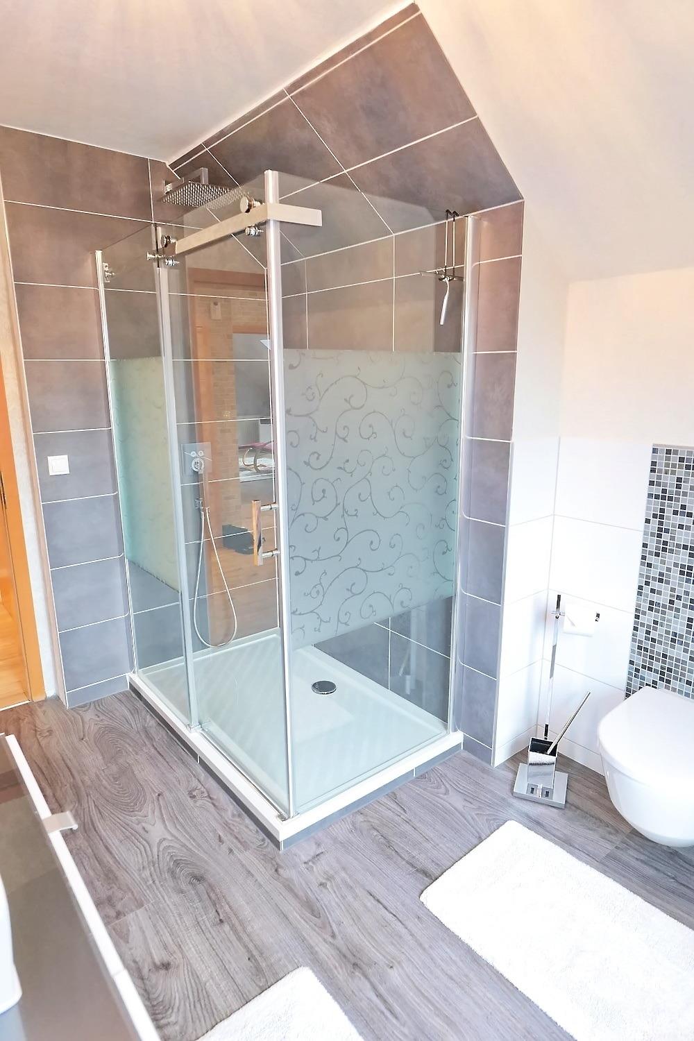 - Badezimmer mit großer Dusche, Badmöbel, Spiegelschrank und Föhn