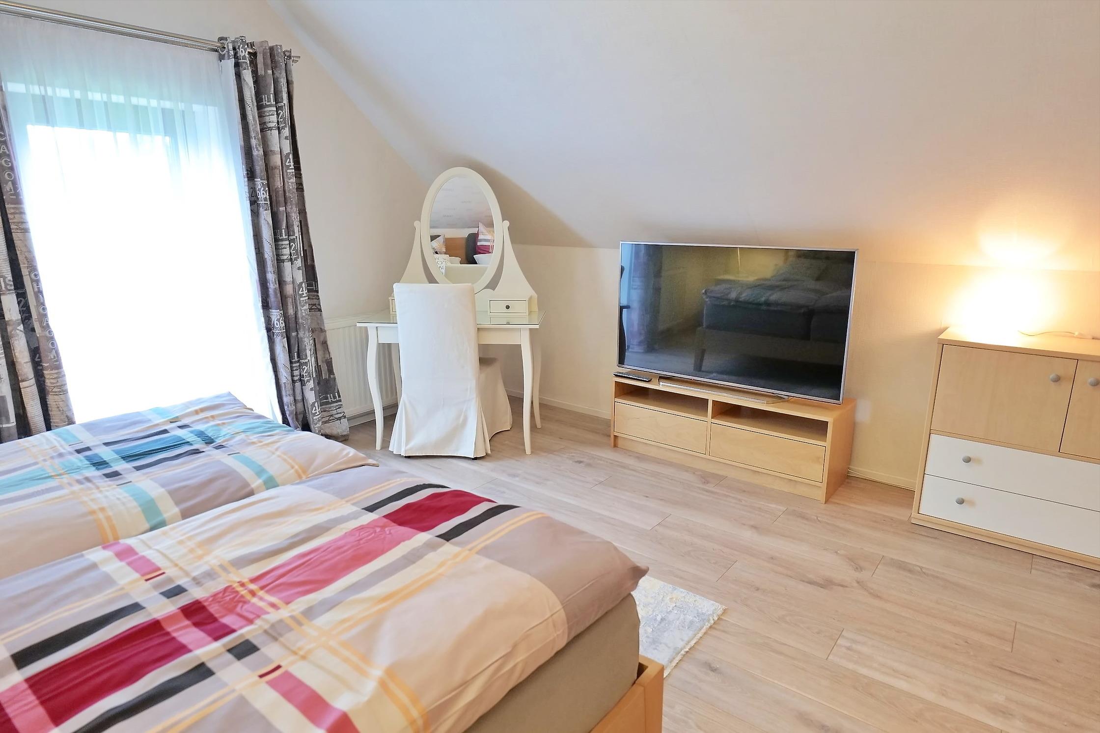 - separates Schlafzimmer mit Doppelbett (1,80 x 2,00 m), zusätzlichen Flat-TV, Schminktisch, Schrank