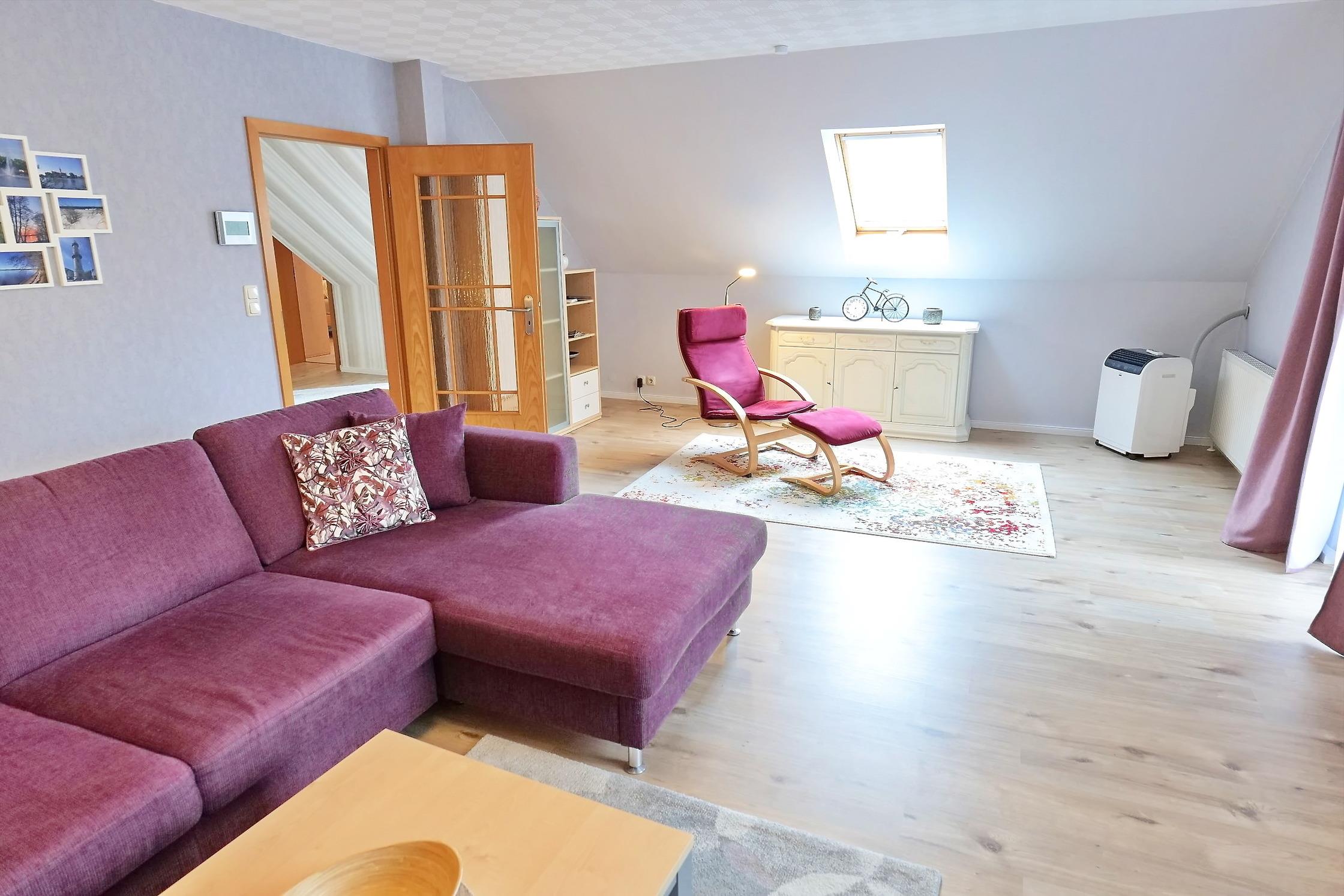 - großes Wohnzimmer mit kombinierter Sitz-/ Schlafcouch ausziehbar, Relaxsessel, Flat-TV, Musikanlage, Klimagerät, Bücher und Spiel