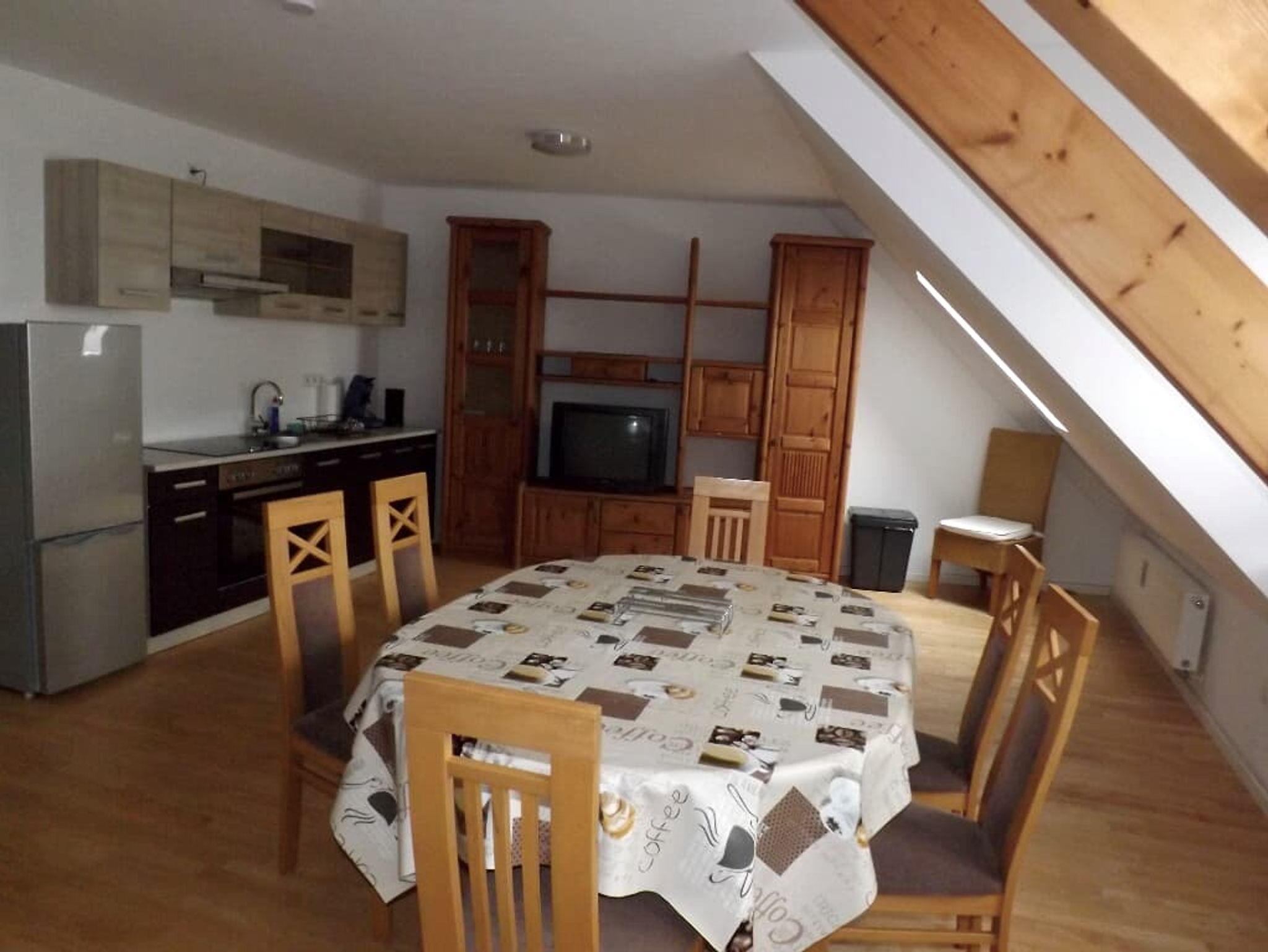 Unsere freundliche, komfortabel ausgestattete Ferienwohnung mit einem hellen großen Wohnraum mit Einbauküche, Essecke und Einzelbett, ein Schlafzimmer mit 2 Einzelbetten und ein Schlafzimmer mit 3 Einzelbetten sowie Badezimmer mit Dusche, Waschbecken und WC lädt zum Wohlfühlen ein. Bett- und Tischwäsche sowie Handtücher sind vorhanden.