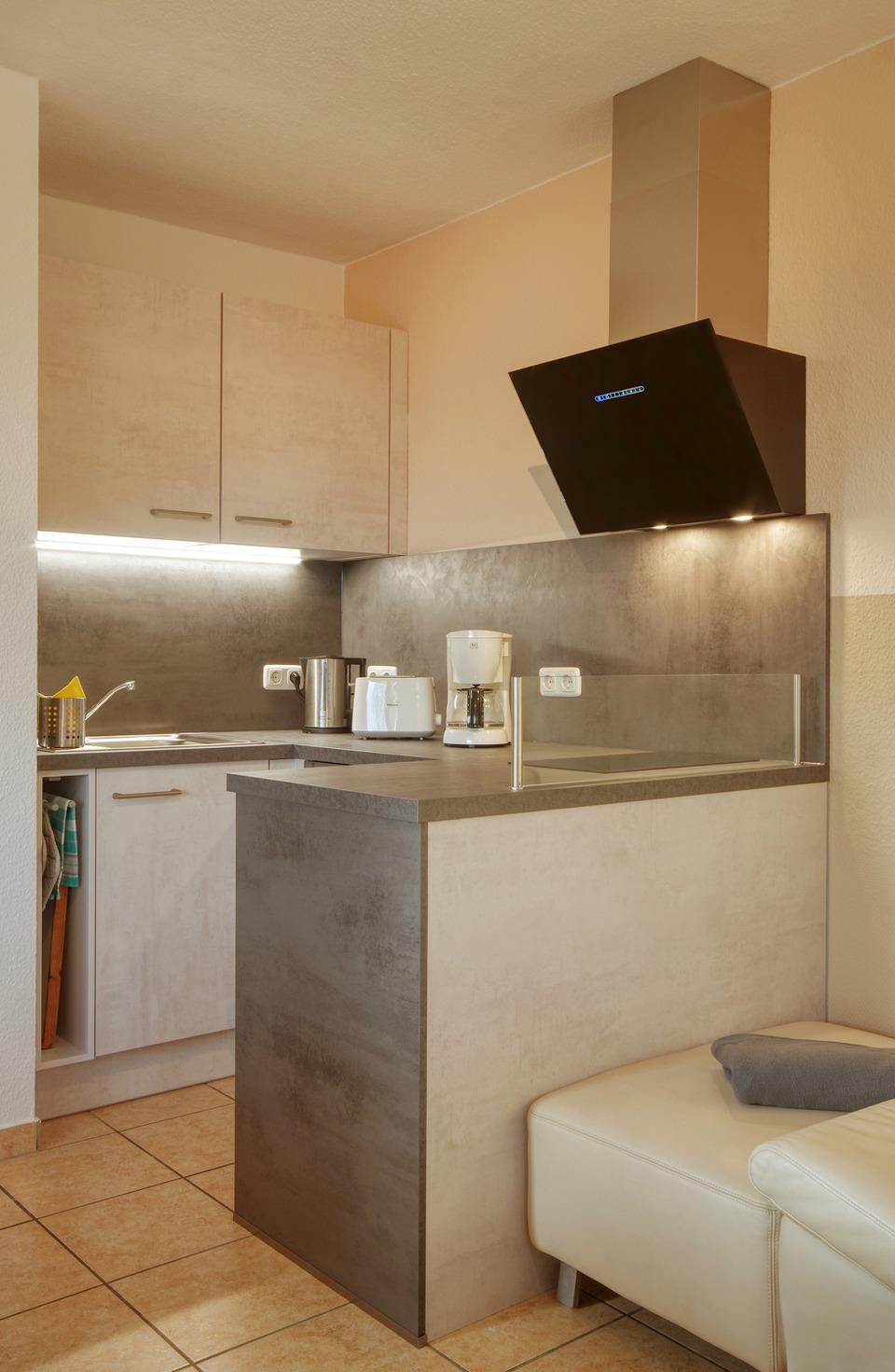 eine voll ausgestattete Küche mit Spülmaschine, Mini-Backofen, Kühlschrank mit Eisfach