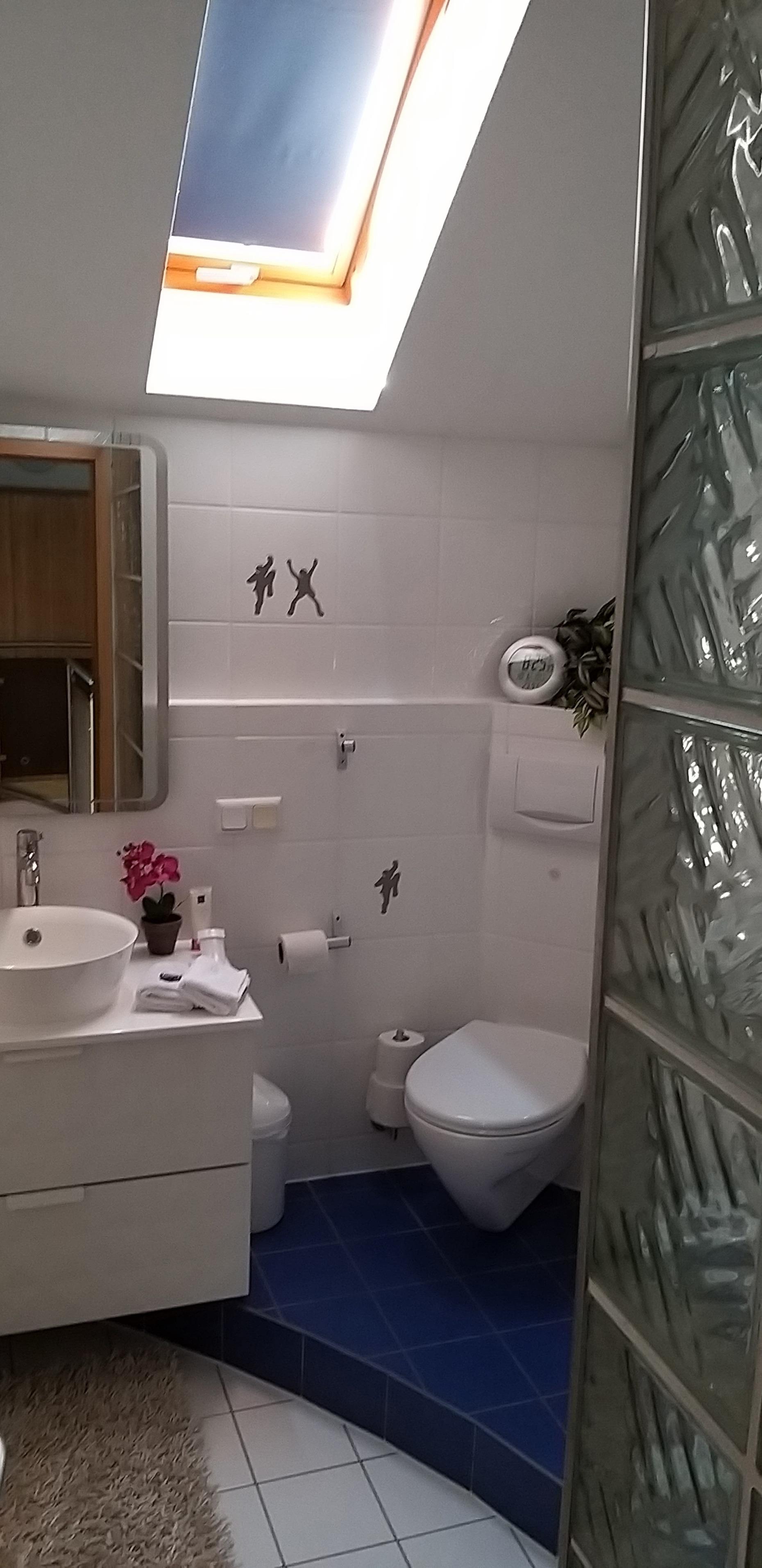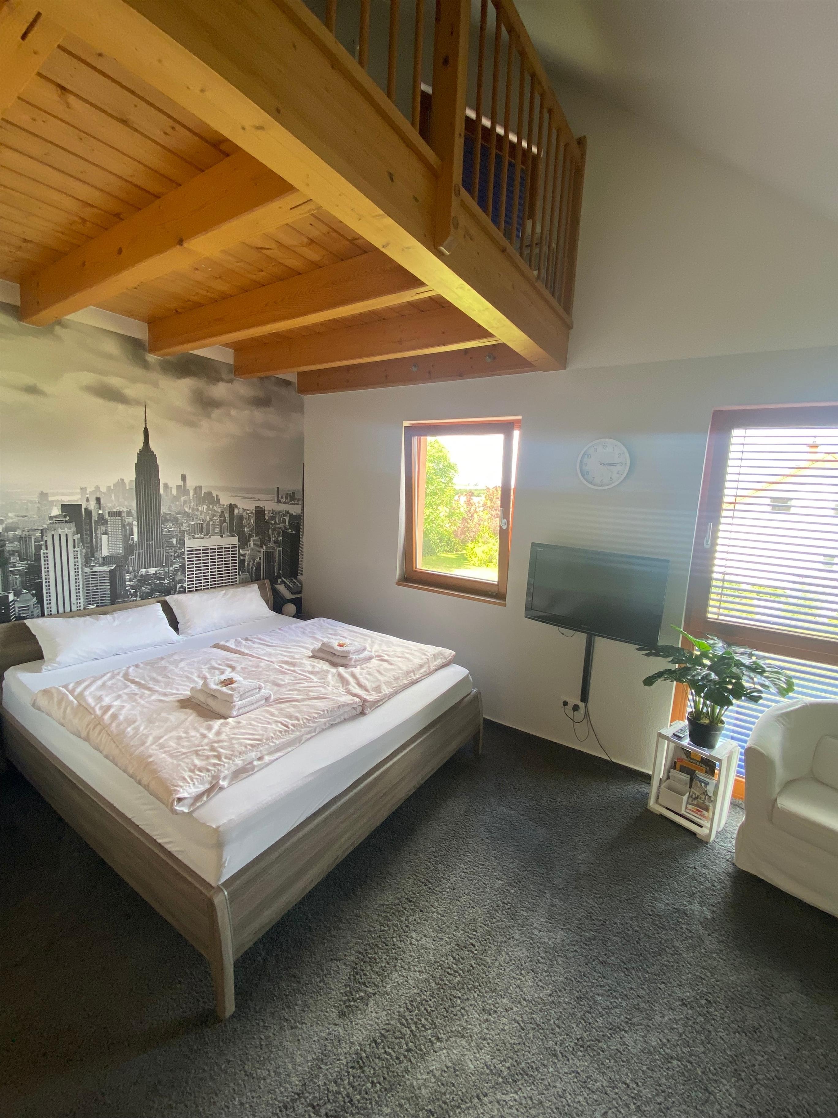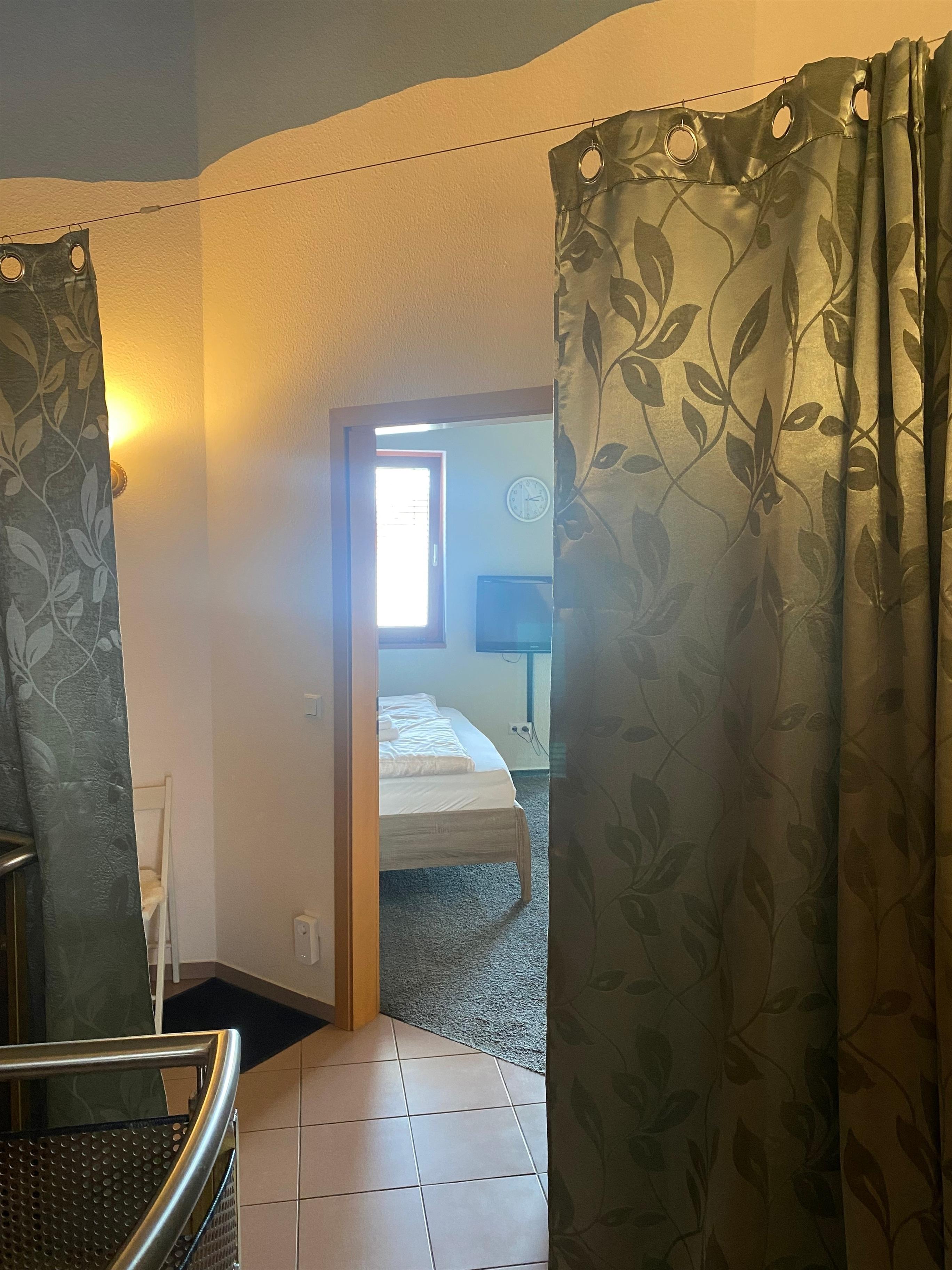 Das im 1. Stock unseres Hauses befindliche 26 m² Maisonette-Ferienzimmer besteht aus einem Wohn-/Schlafbereich mit Doppelbett 180x200 und auf der Galerie ein Doppelbett 140x200 (Buchung 3-4 Personen). Wenn 2 Personen nicht im gleichen Bett schlafen möchten, bitte als Serviceleistung extra buchen. Die Wohnung verfügt zwar nicht über einen eigenen Eingang, jedoch ist der Privatbereich mit Sichtschutz abgetrennt.