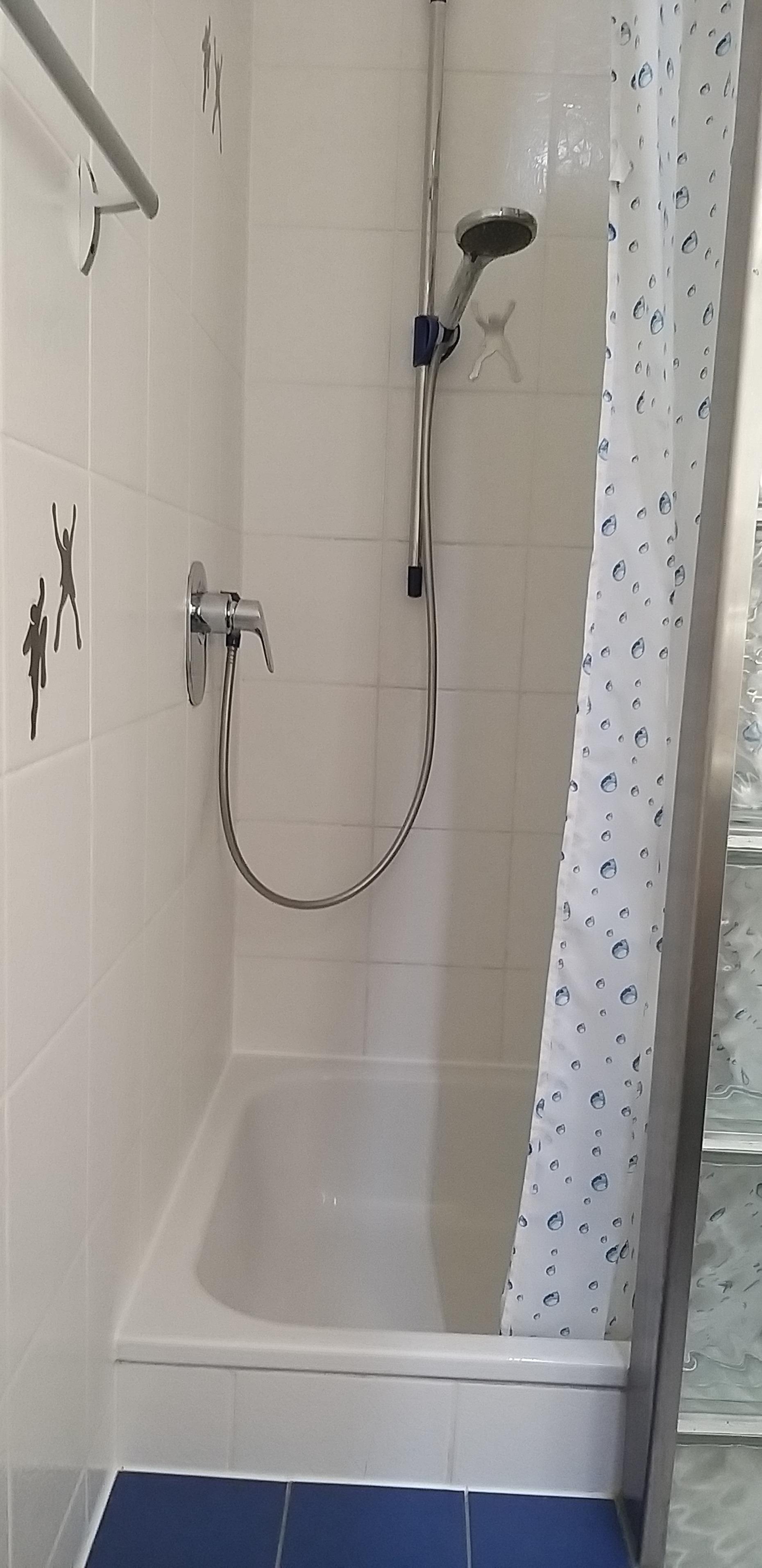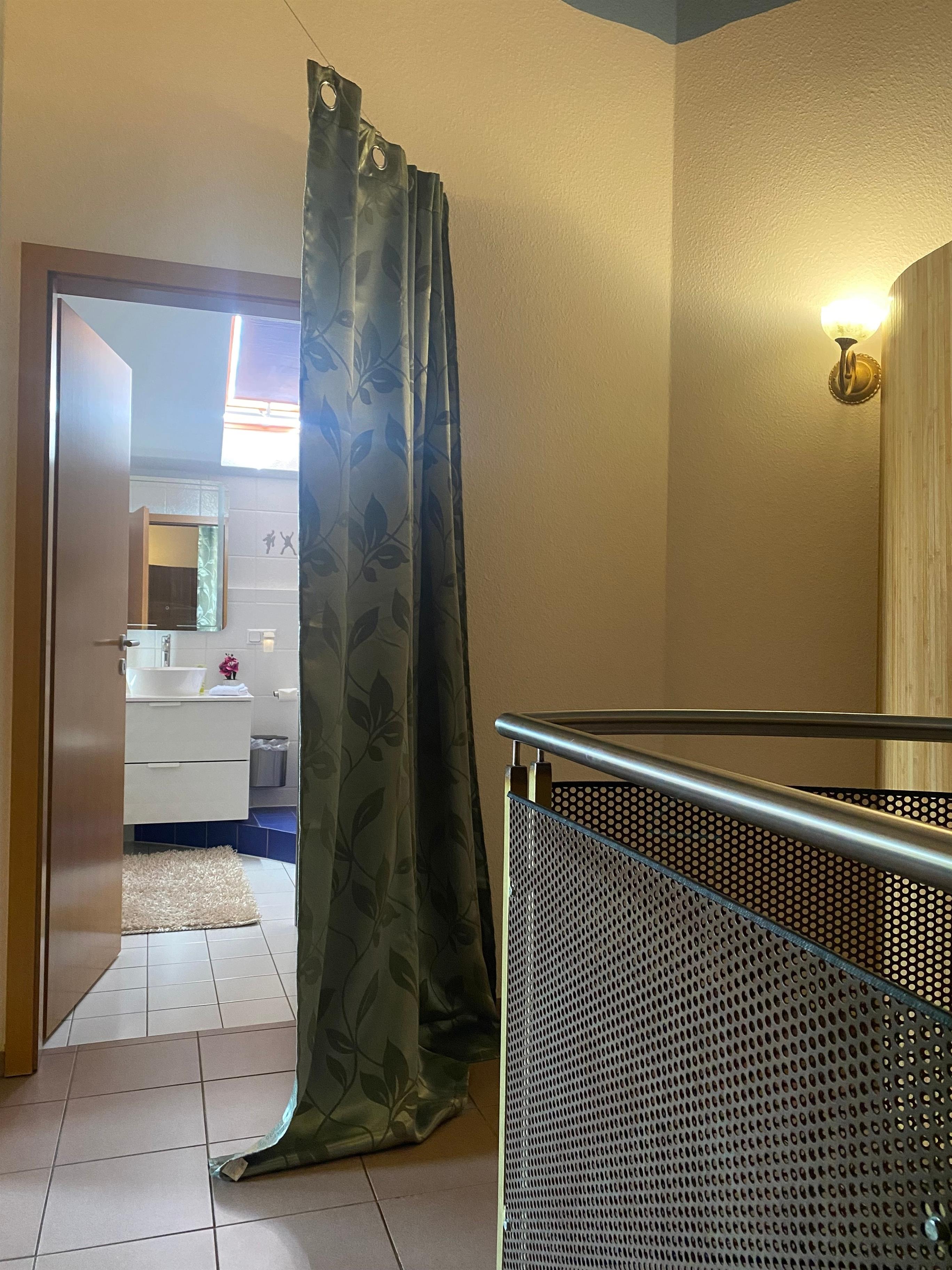 Der Zugang zum Badezimmer ist mit einem blickdichten Vorhang versehen und dadurch diskret zugänglich.