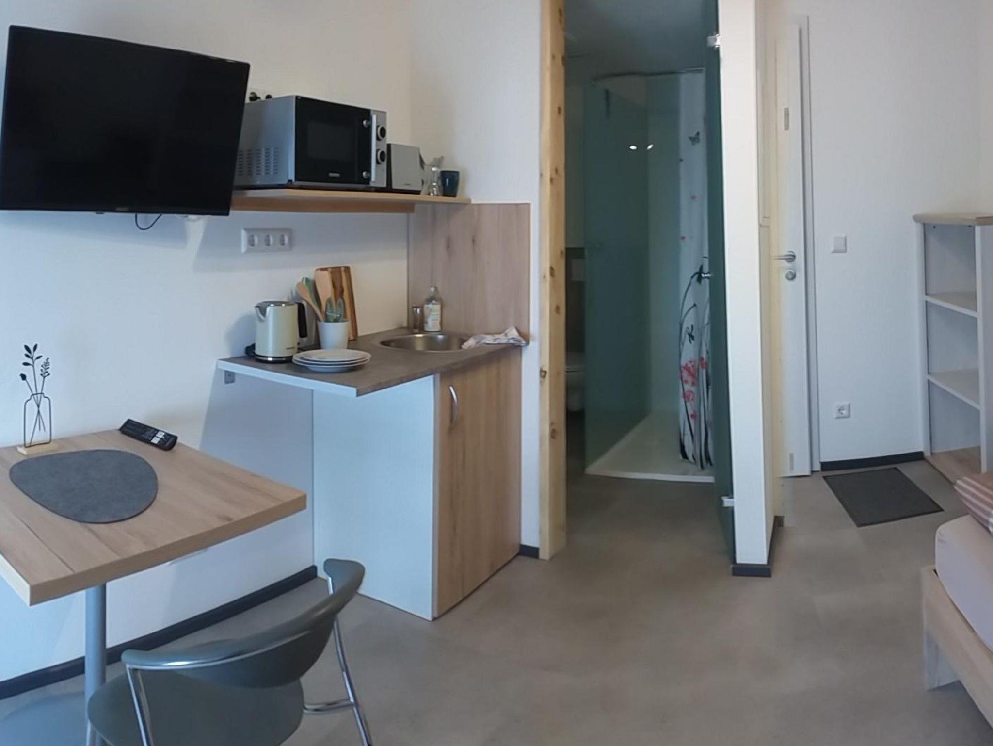 Zwei Doppelzimmer im Studio-Still ca. 24m² mit Küchenzeile, Bad, WC, Dusche, TV und WLAN. Die Küche verfügt über Mikrowelle, 2 Ceranfeldplatten, Kühlschrank sowie Kochgegenstände. Handtücher stehen Ihnen zur Verfügung.