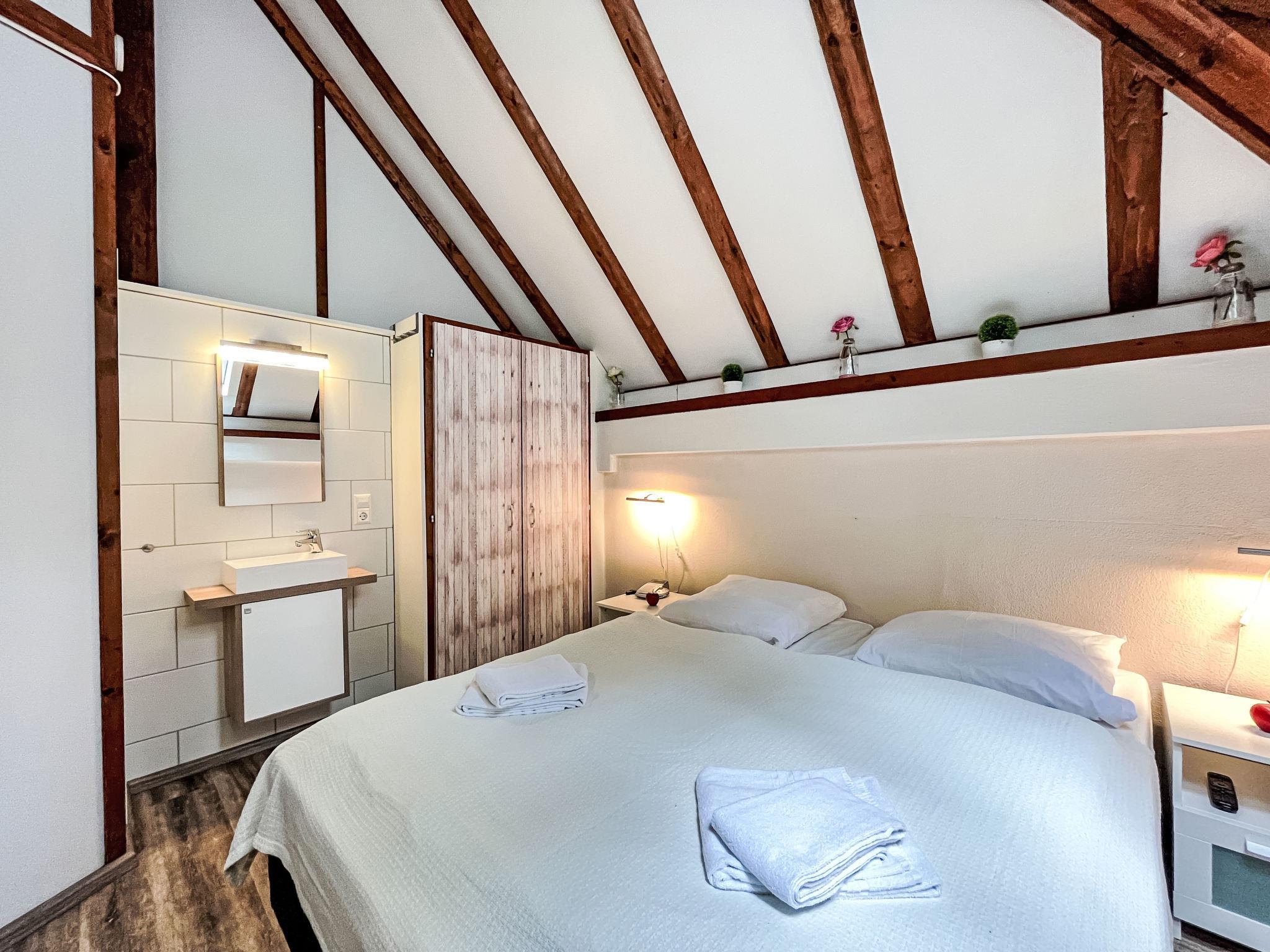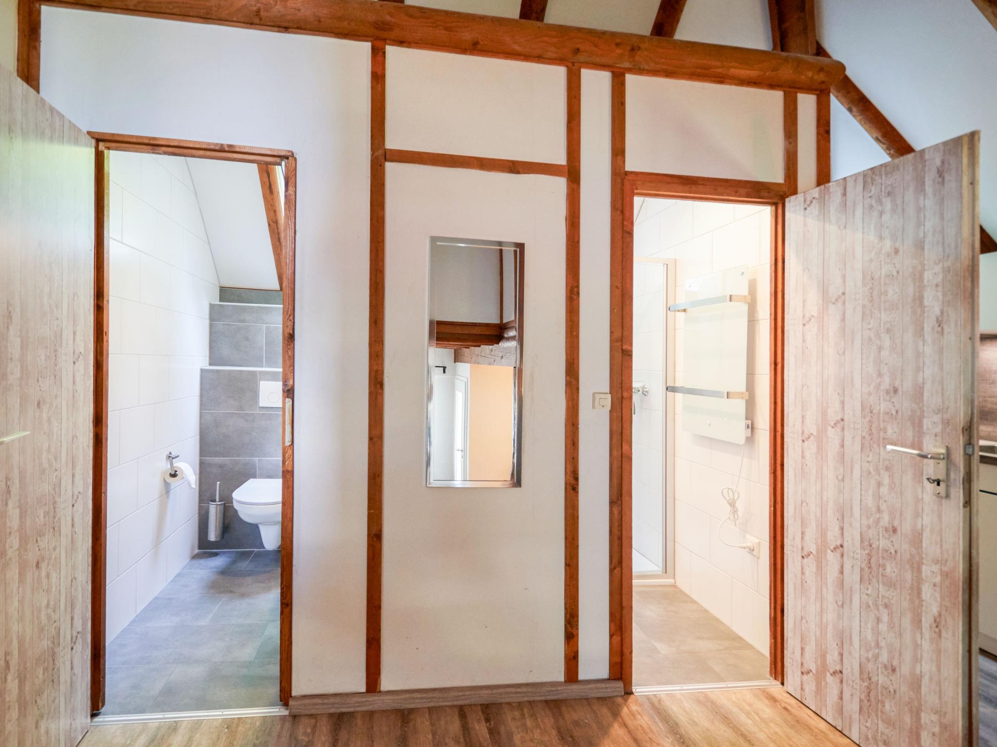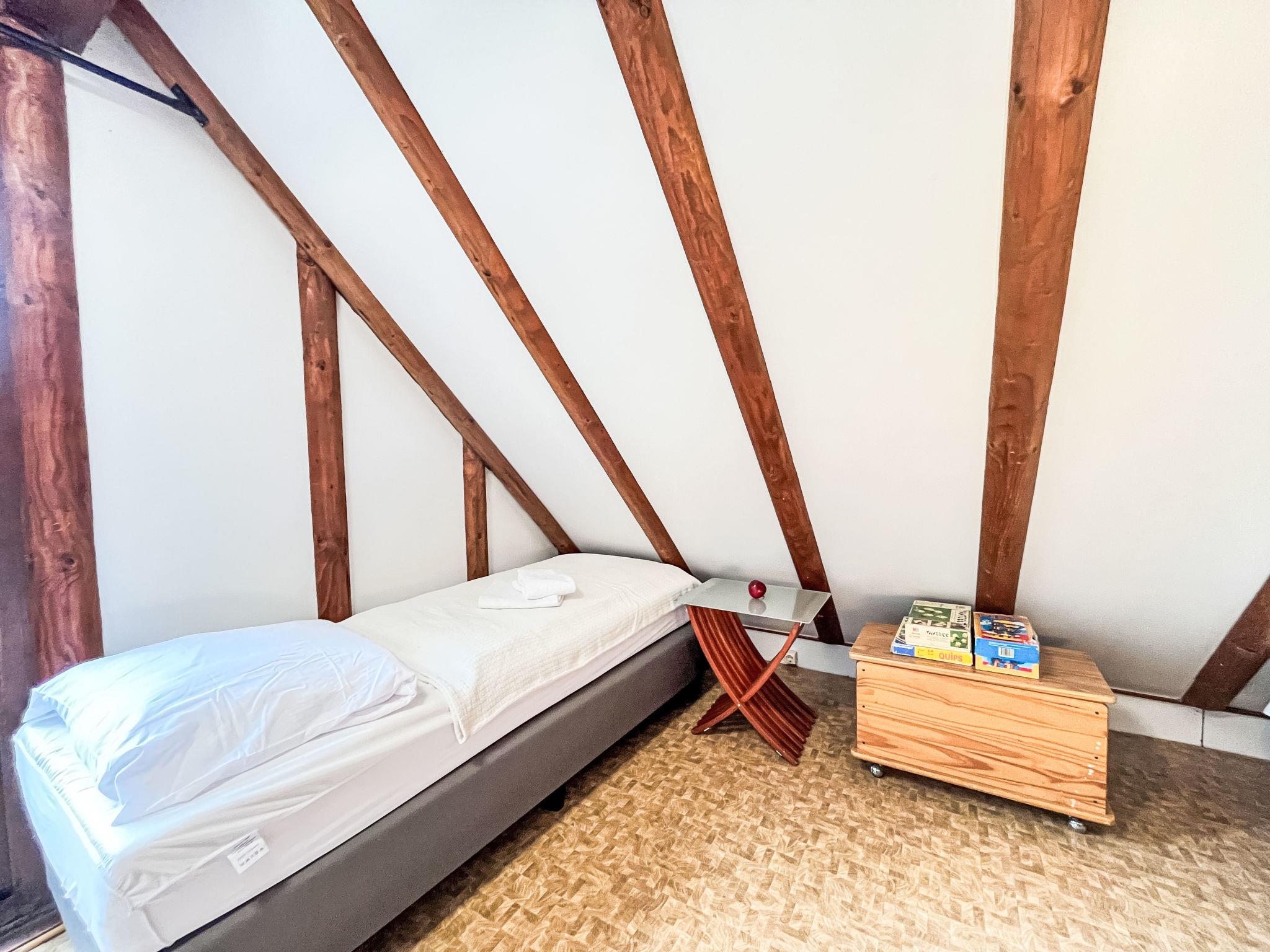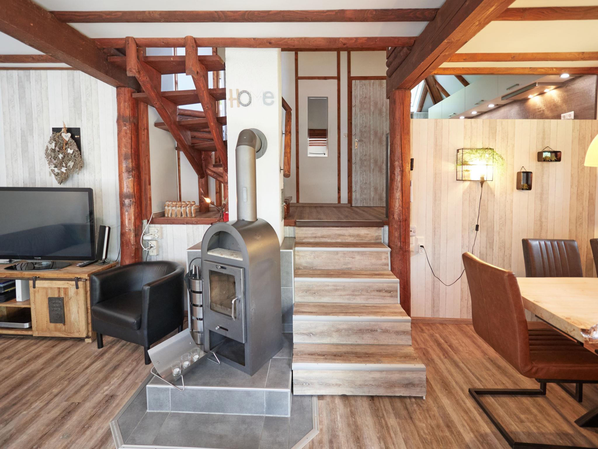 "Am Sternberg 50", 4-room house 75 m2 on 2 levels, on the ground floor. Cosy and wooden furniture furnishings: living/dining room 25 m2 with Scandinavian wood stove and cable TV (flat screen), hi-fi system. Exit to the terrace, to the patio. 1 room 12 m2 with 1 double bed (180 cm, length 200 cm), hand-basin, separate WC and cable TV (flat screen). Open kitchen 8 m2 (oven, dishwasher, 4 ceramic glass hob hotplates, kettle, microwave, electric coffee machine, Capsules for coffee machine (Senseo)). Shower/WC. Upper floor: (spiral staircase), 1 room 12 m2, with sloping ceilings with 1 double bed (180 cm, length 200 cm), hand-basin. Exit to the balcony. 1 room 11 m2, with sloping ceilings with 2 beds (90 cm, length 200 cm), hand-basin. Exit to the balcony. Electric heating, air-conditioning, forced-air heating. Small balcony 5 m2, south facing position, terrace 20 m2 partly roofed, patio, lawn 150 m2. Terrace furniture, balcony furniture, barbecue (portable). Facilities: children's high chair, hair dryer, logs (extra). Internet (WiFi, free). Please note: non-smoking house. Maximum 2 pets/ dogs allowed. Smoke alarm, fire extinguisher. The rooms on the ground floor are connected by stairs (mezzanine).