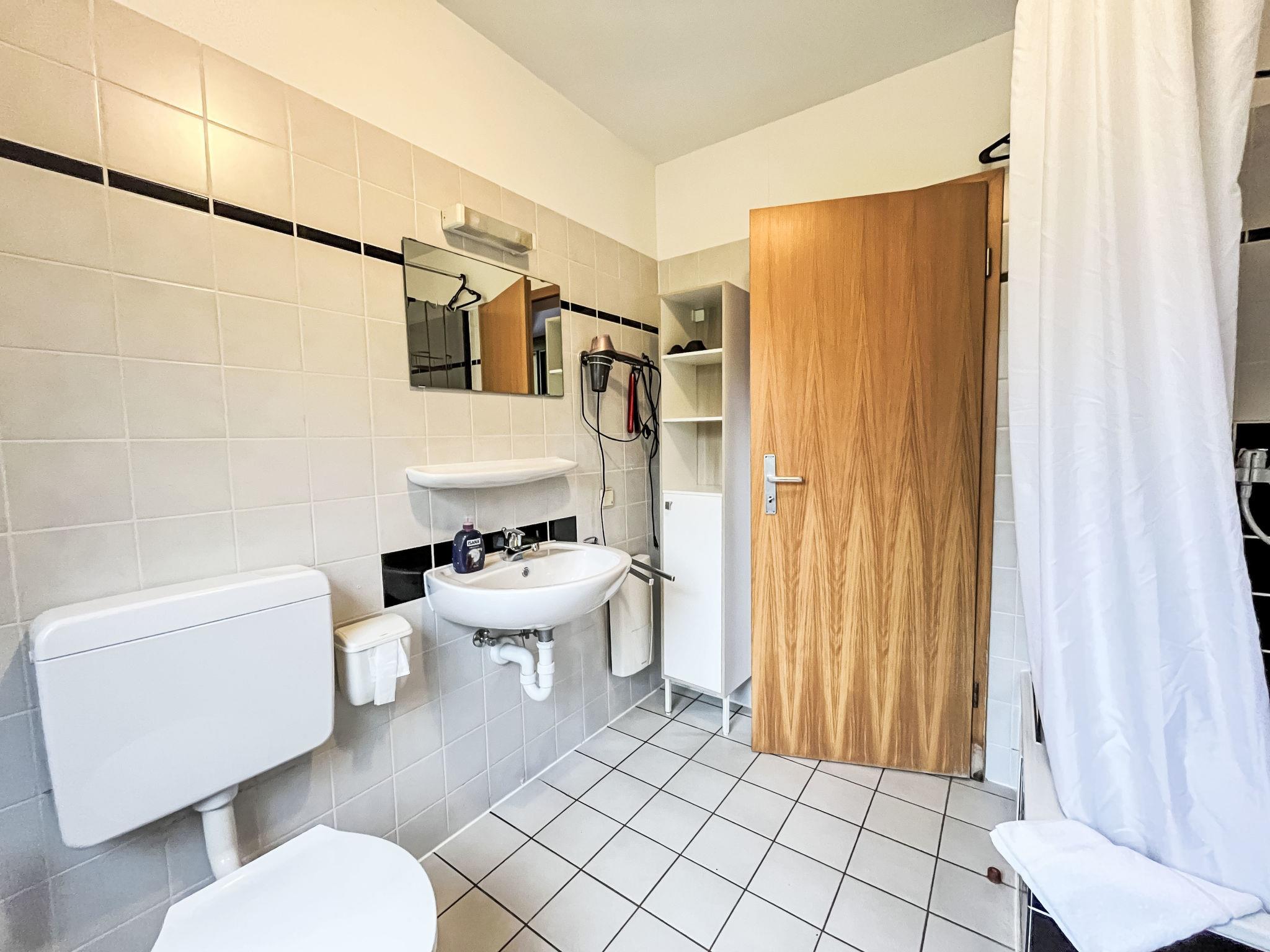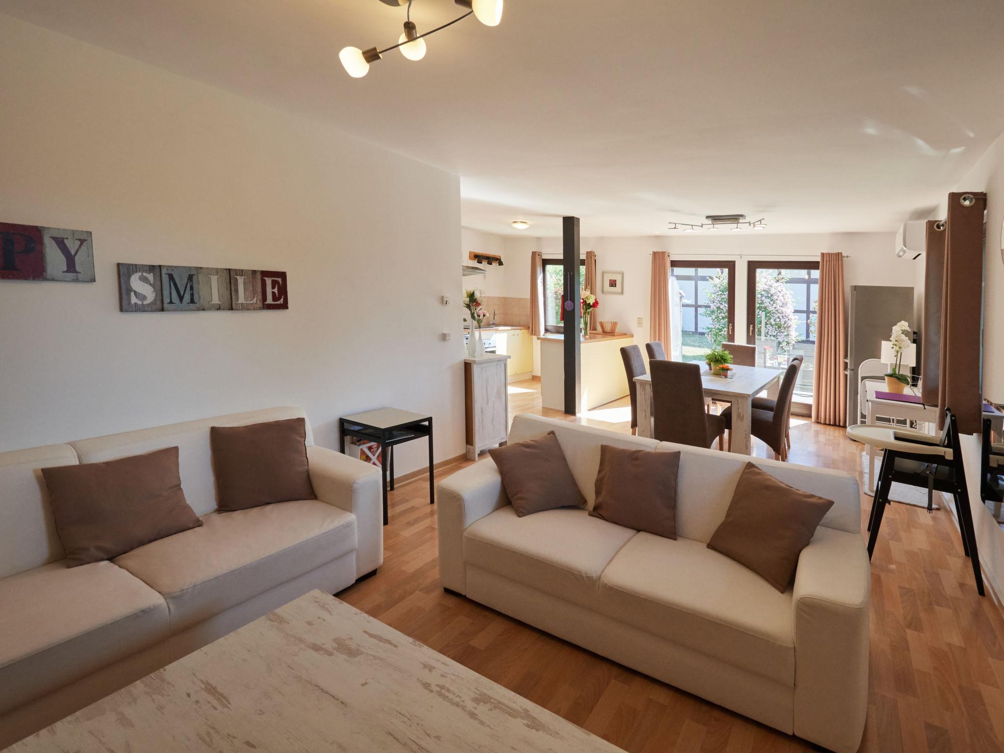 "Am Sternberg 230", 3-room apartment 75 m2, lower ground floor. Cosy furnishings: living/dining room 40 m2 with cable TV (flat screen), hi-fi system. Exit to the garden, to the terrace. 1 room 10 m2 with 1 double bed (180 cm, length 200 cm). 1 room 10 m2 with 2 beds (90 cm, length 190 cm). Kitchenette (oven, dishwasher, 4 ceramic glass hob hotplates, microwave, electric coffee machine). Shower/WC. Electric heating, air-conditioning, forced-air heating. Large terrace 30 m2, lawn 200 m2. Terrace furniture, barbecue (portable). Facilities: washing machine, children's high chair, baby cot, hair dryer. Internet (WiFi, free). Parking at 10 m. Please note: non-smokers only. Maximum 2 pets/ dogs allowed. Private entrance, smoke alarm, fire extinguisher. A Senseo pad machine is available. A shared lawn is available. Access from the parking lot to the apartment is via 8 steps. A portable dog fence is available for self-assembly. DE3558.200.18