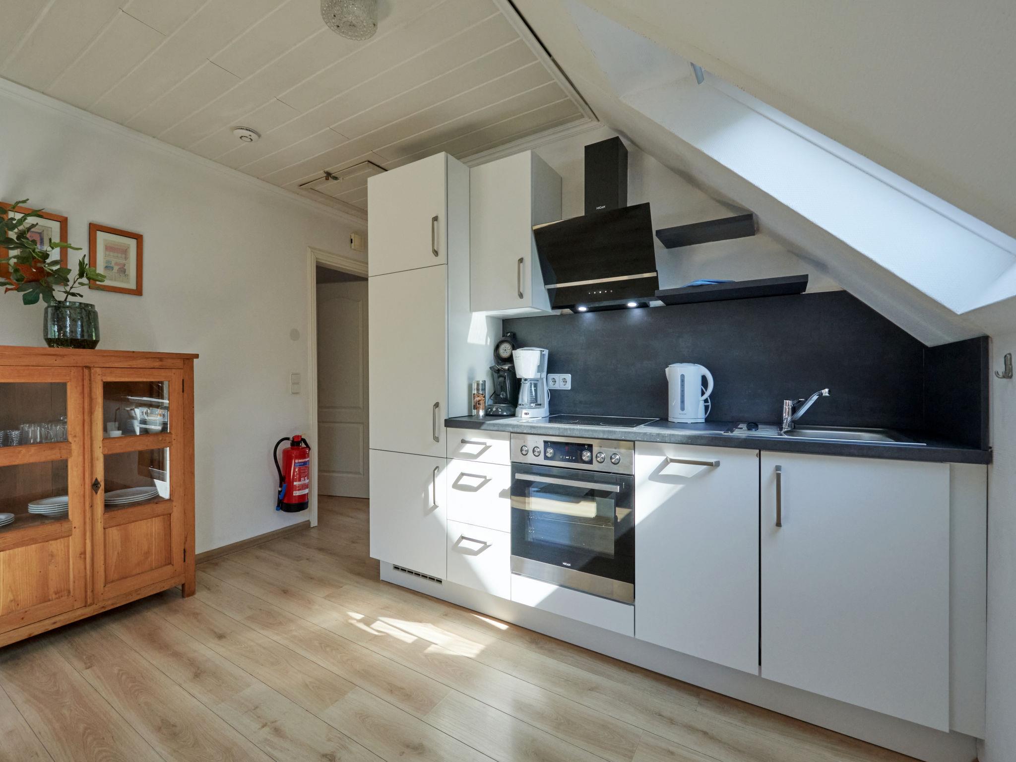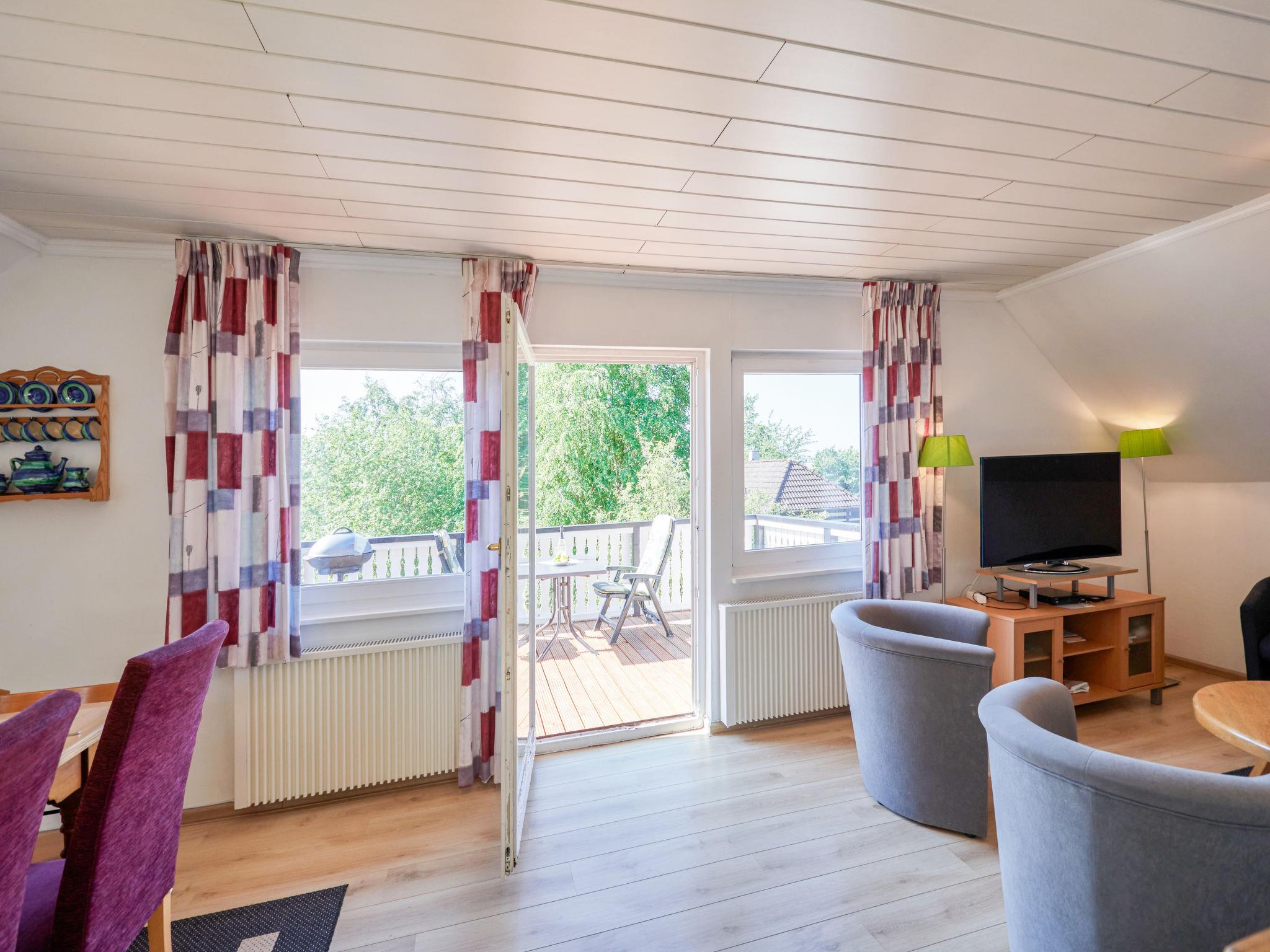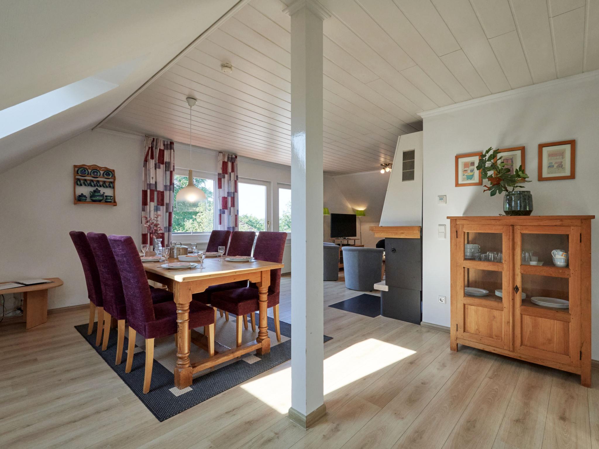 "Am Sternberg 224", 3-room apartment 75 m2, on the upper floor. Partly with sloping ceilings, cosy furnishings: living/dining room 40 m2 with open-hearth fireplace and cable TV (flat screen), hi-fi system. Exit to the balcony. 1 room 10 m2 with 1 double bed (160 cm, length 200 cm). 1 room 10 m2 with 1 double bed (180 cm, length 200 cm). Kitchenette (oven, dishwasher, 4 ceramic glass hob hotplates, toaster, kettle, electric coffee machine). Bath/WC. Electric heating. Large balcony 10 m2, south facing position. Balcony furniture. Facilities: logs (extra). Internet (WiFi, free). Parking at 10 m. Please note: non-smokers only. Maximum 2 pets/ dogs allowed. Private entrance, smoke alarm, fire extinguisher.