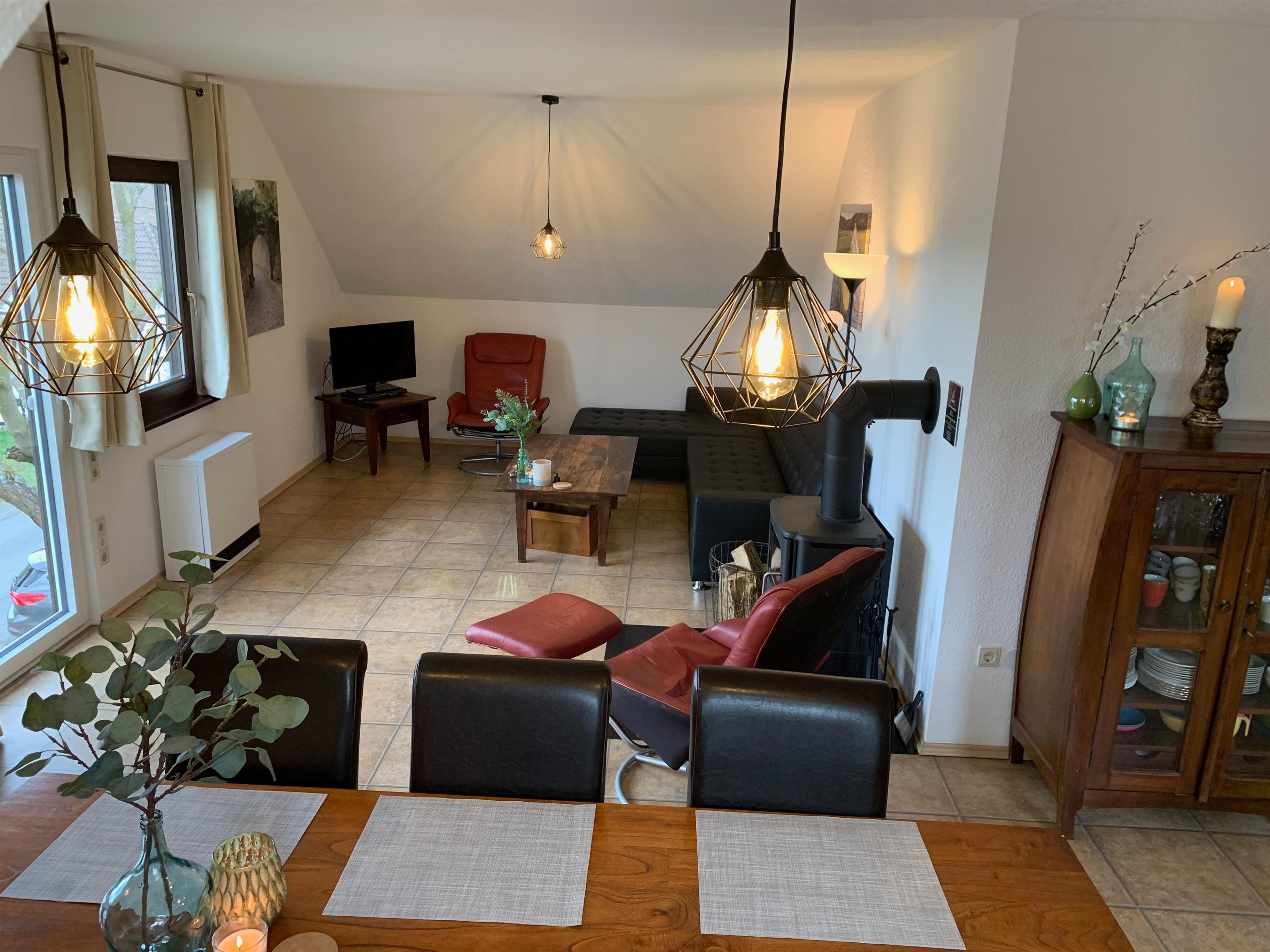 In der Wohnung befinden sich 2 Schlafzimmer mit insgesamt 4 Schlafgelegenheiten (1 Doppelbett und 2 Einzelbetten). Das Tageslicht-Bad bietet eine modernisierte Dusche. Desweiteren gibt es ein separates Gäste-WC. Der offen gestaltete Wohn-/Essbereich bietet 7 Plätze am Esstisch und einen gemütlichen Couchbereich mit 2 separaten Sesseln. So lässt sich eine gemütliche Zeit am Kamin verbringen.