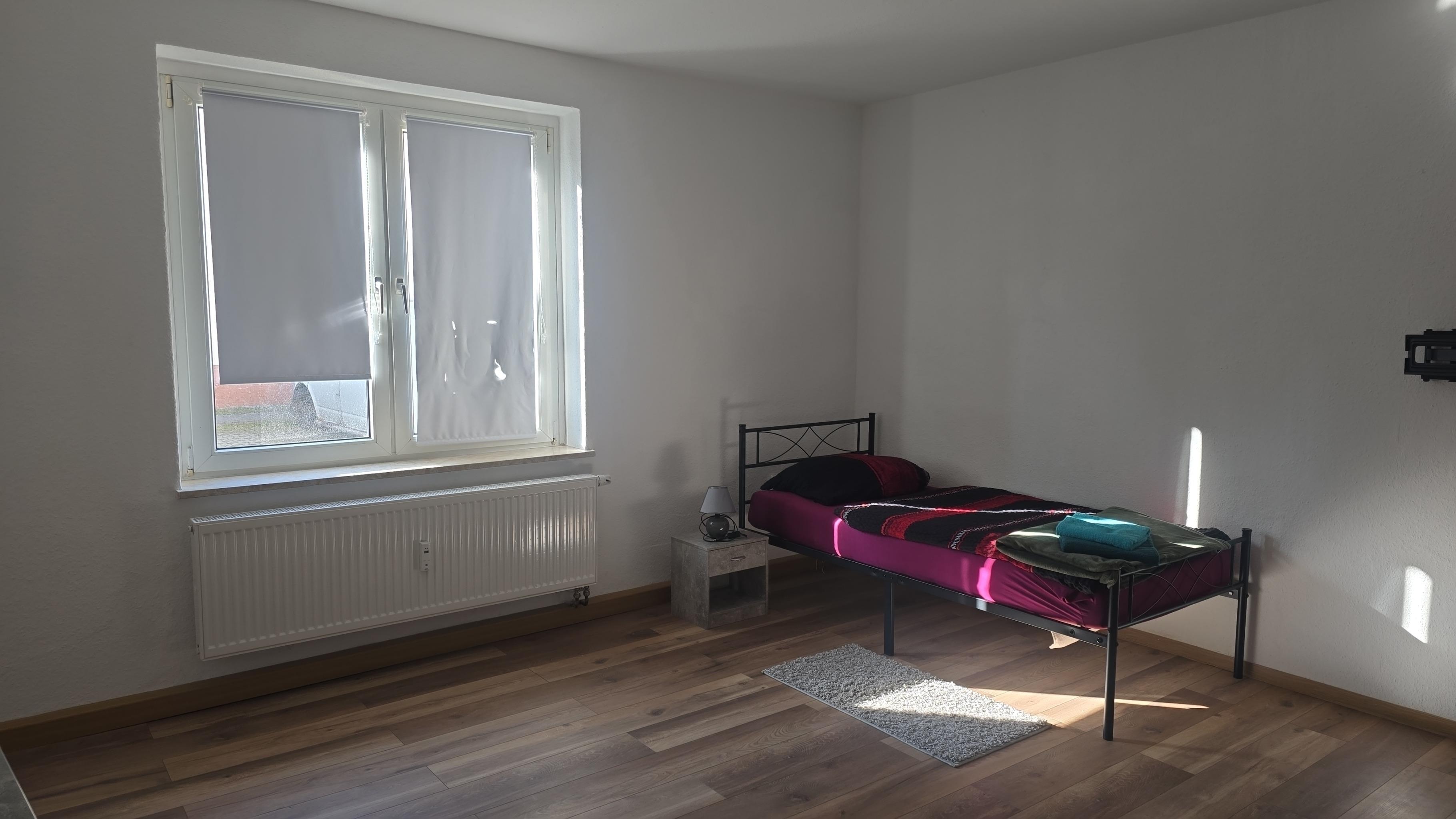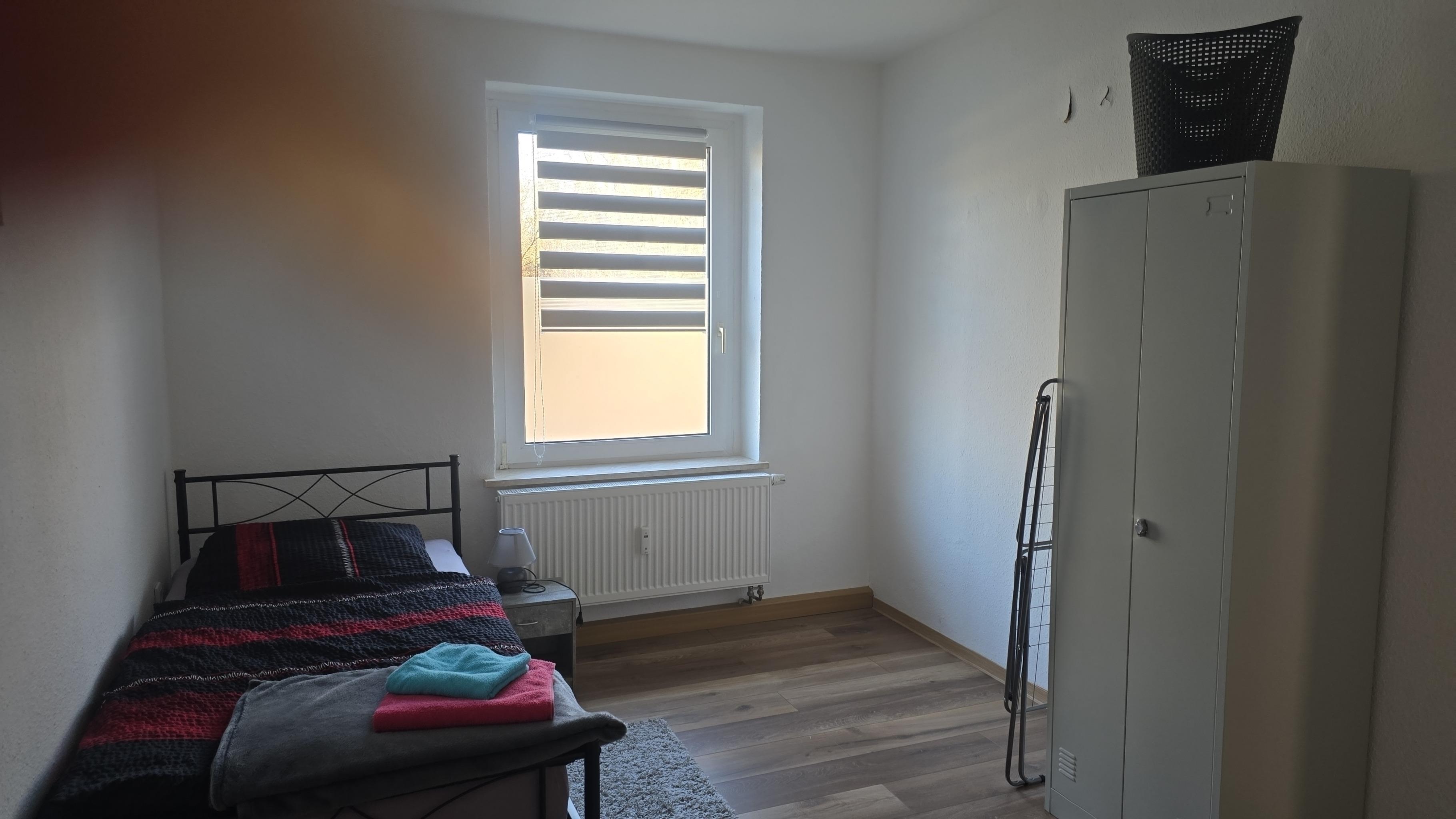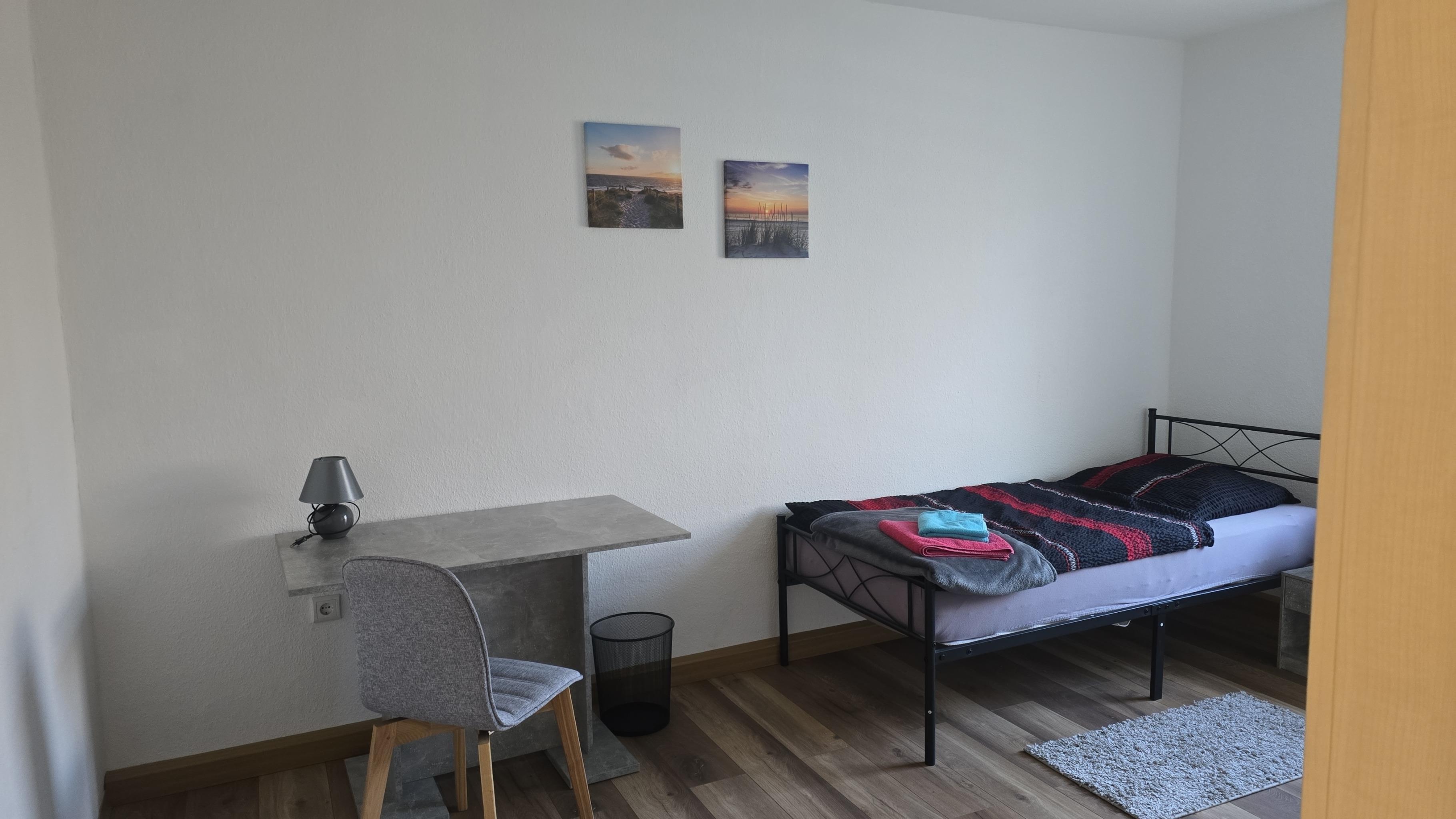 Jedes Zimmer verfügt über 1 oder 2 Einzelbetten 90x200 mit H4 Taschenfederkernmatratze, Kleiderschrank, Nachttischrank mit Nachttischlampe, Schreibtisch + Stuhl, Wäscheständer , Mülleimer. Insgesamt gibt es 4 Schlafzimmer.