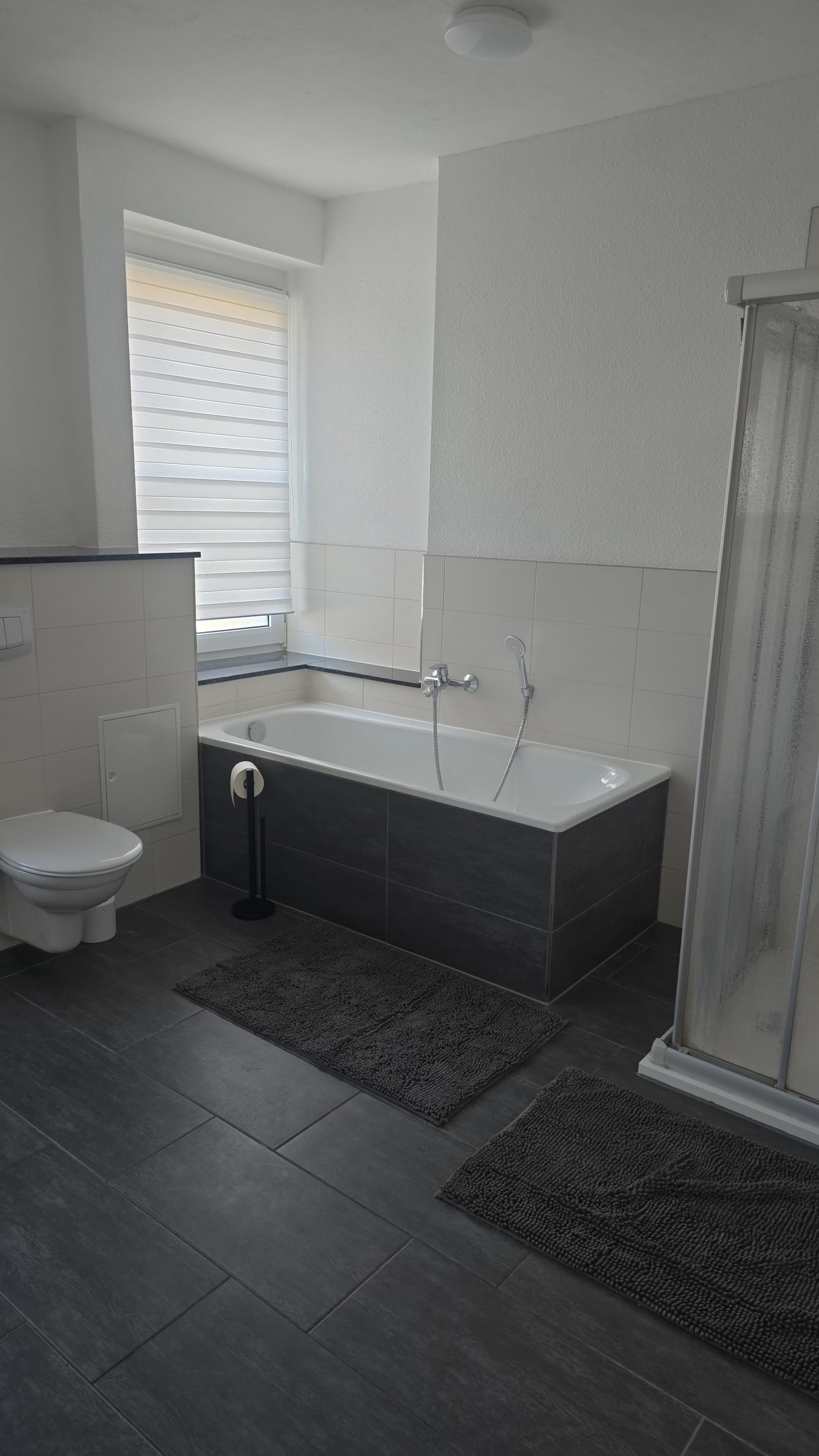 Badezimmer mit Doppel- Waschbecken, Badewanne und begehbarer Dusche.