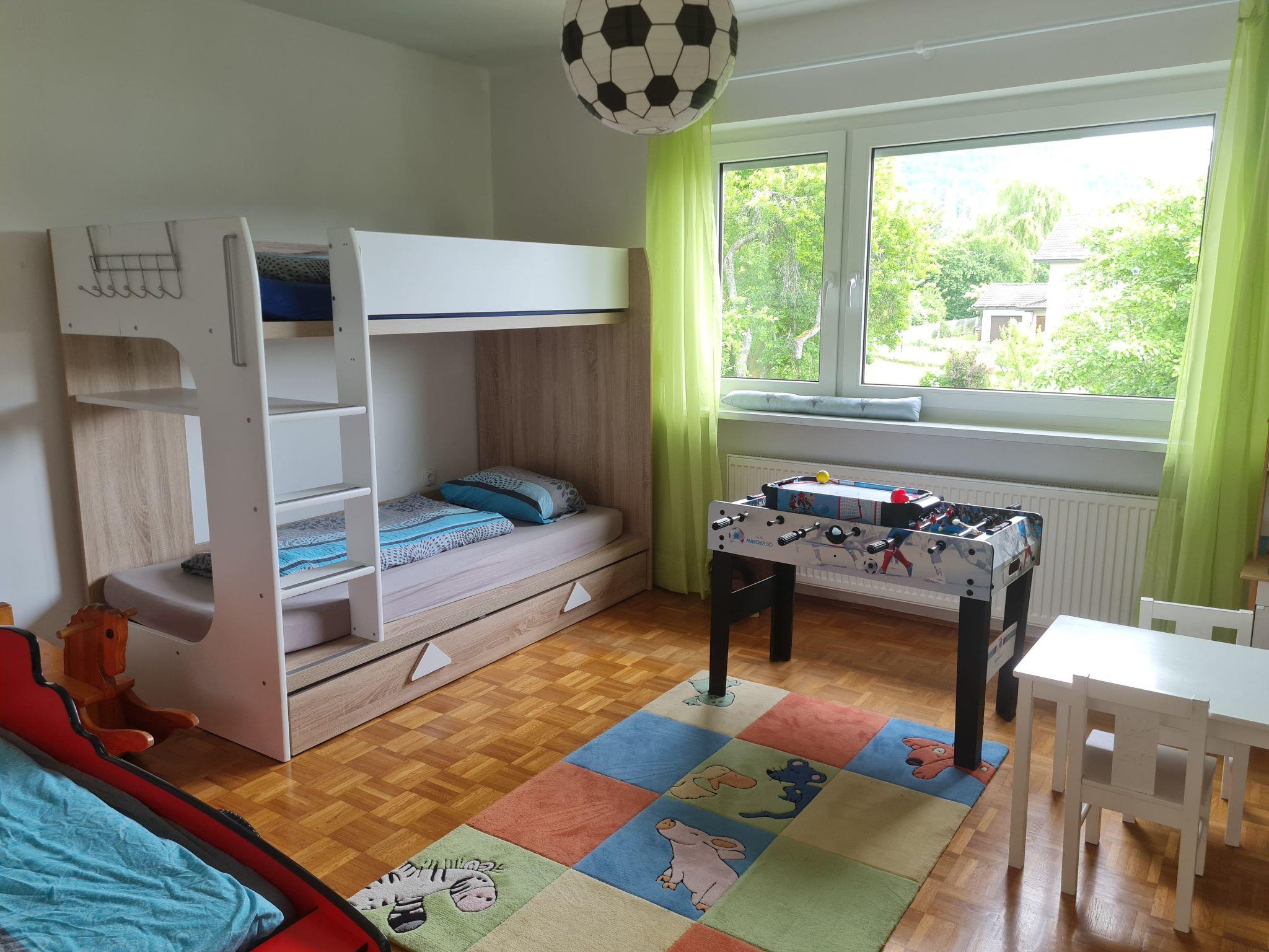 Outside the flat, you can enjoy the fresh mountain air on the communal terrace or balcony. The garden, which is for communal use, is fully fenced so that guests with up to three large dogs can relax in peace while their four-legged friends play safely. For younger guests, there is even a playground in the garden to keep them amused and entertained.