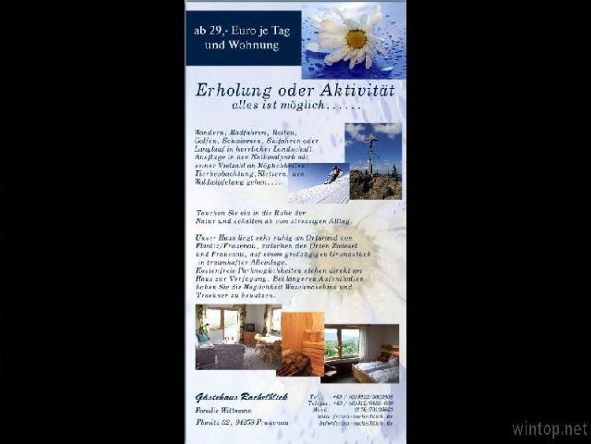 Nutzen Sie die vielfältigen Freizeitangebote in der näheren Umgebung. Ein Freibad in Frauenau, das attraktive Hallenbad mit Saunalandschaft in Zwiesel, Erlebnisbäder in Lam und Dingolfing, der Nationalpark in Grafenau, das Silberbergwerk mit Rodelbahn in Bodenmais - um nur einige Angebote zu nennen - lassen bei keinem Wetter Langeweile aufkommen.