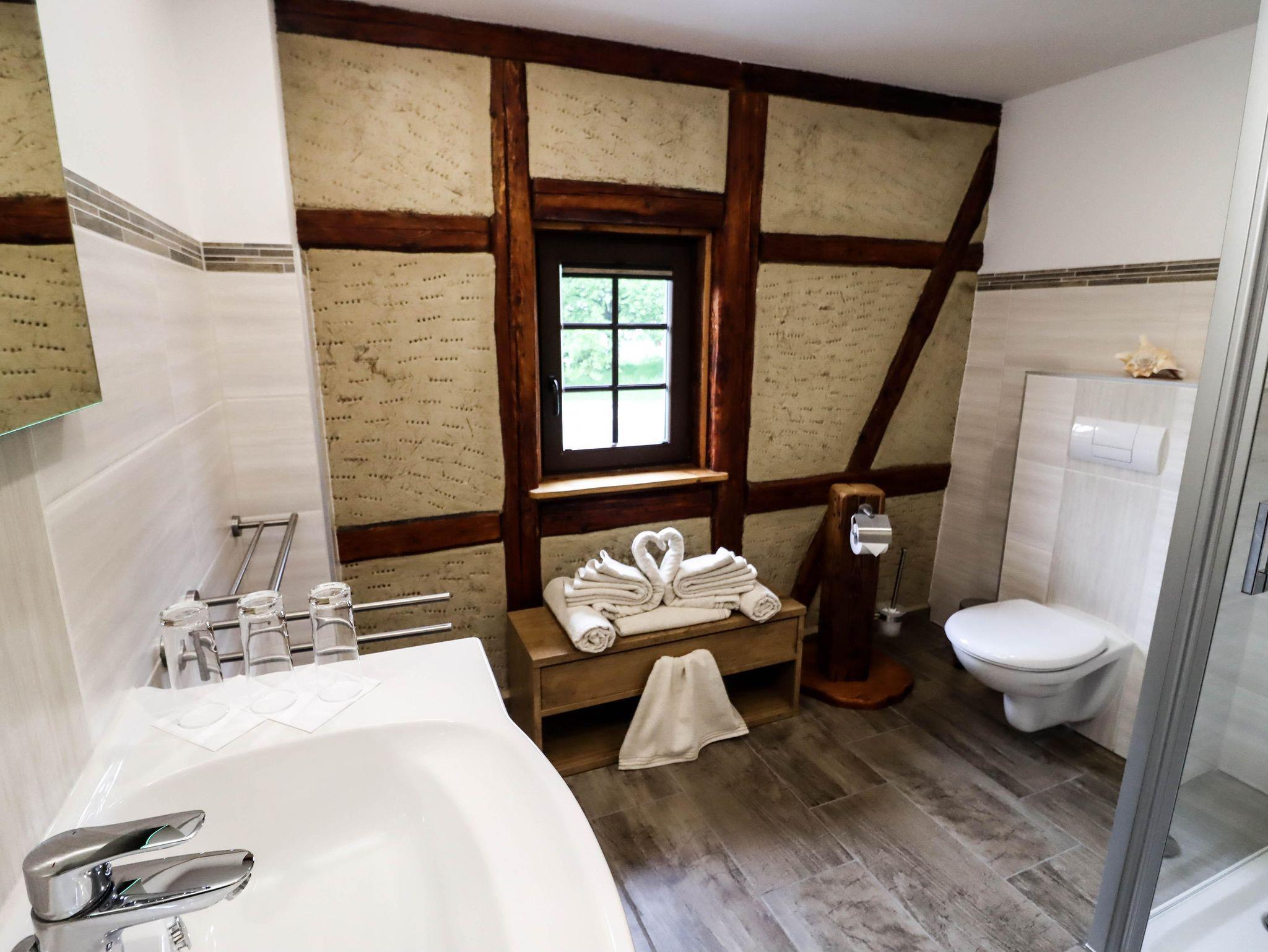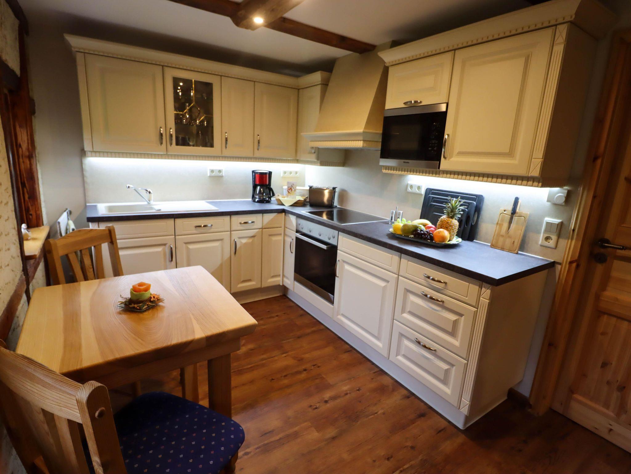 Das Haus, das um 1550 erbaut wurde, haben wir mit viel Liebe zum Detail in mühevoller Kleinarbeit mit historischen Baustoffen wieder hergerichtet. Im Haus finden Sie eine Fußbodenheizung, die durch Erdwärme gespeist wird. Der Lehmputz an den Wänden sorgt für ein gesundes Raumklima. Bei uns können Sie sich vom historischen Ambiente verzaubern lassen während Sie maximalen Komfort genießen.