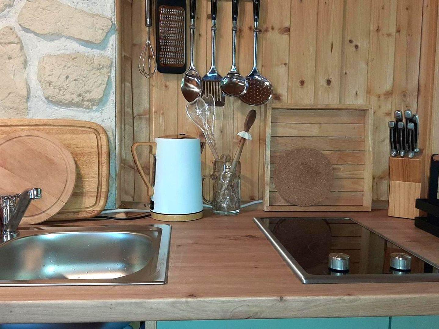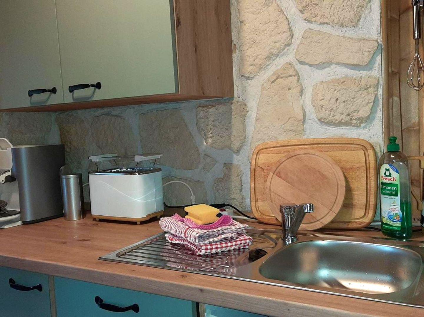 In der voll ausgestatteten kleinen Küche kannst Du alles zubereiten, was Du brauchst. Sie verfügt über Kochplatten, eine Mikrowelle mit Umluftfunktion, einen Kühlschrank, Kaffee- und Senseomaschine, einen Wasserkocher, einen Toaster sowie Geschirr und Besteck. Das Badezimmer ist mit einer Dusche und einem WC ausgestattet und bietet modernen Komfort. Das absolute Highlight des Ferienhauses ist die private Sauna. Nach einem Tag an der frischen Luft gibt es nichts Schöneres, als in der wohltuenden Wärme der Sauna zu entspannen. Sie hilft, Verspannungen zu lösen, die Muskeln zu lockern und sorgt für erholsamen Schlaf – Wellness pur direkt in Deinem Ferienhaus!