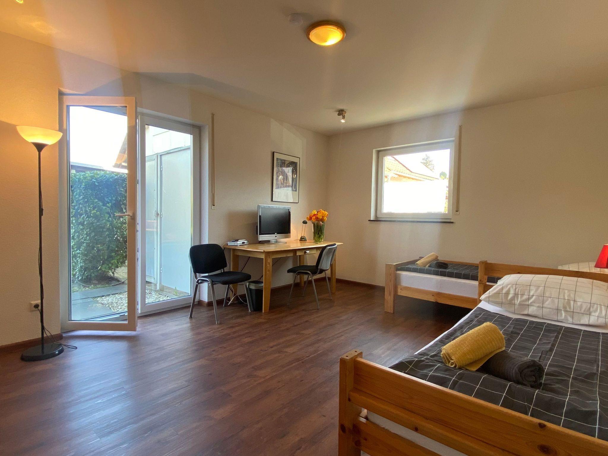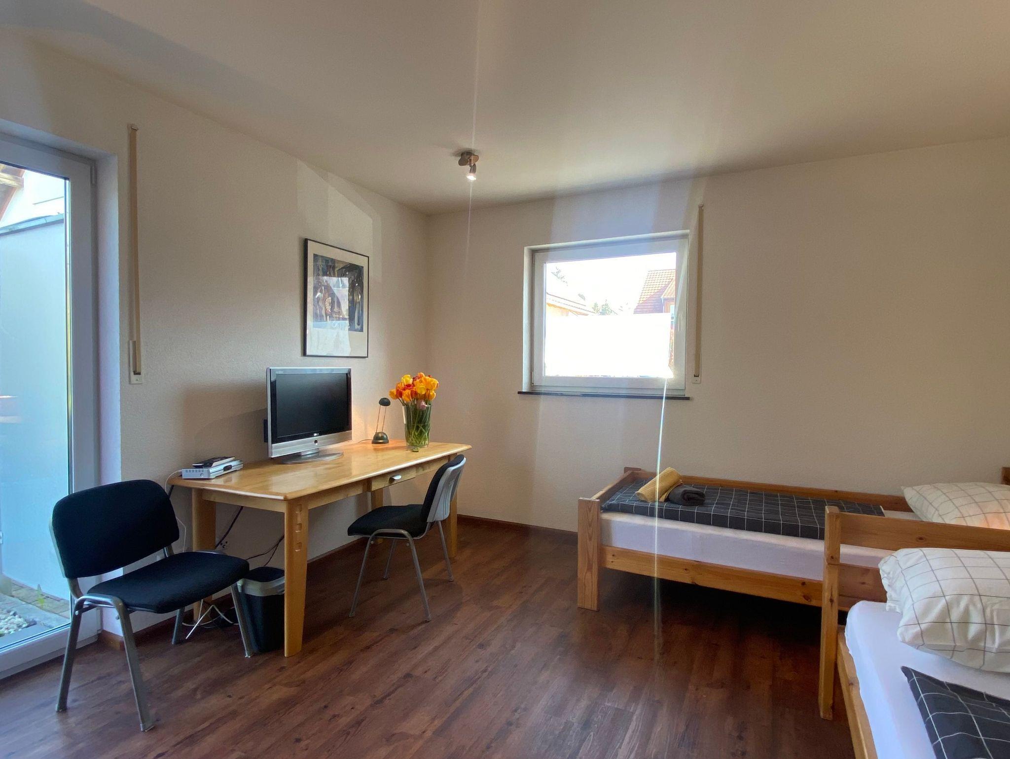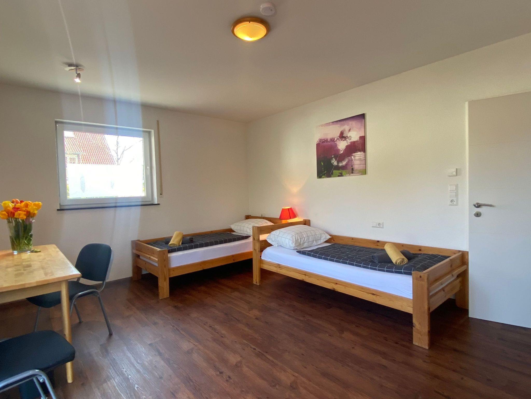 Großes Nichtraucher-Gästezimmer mit Terrasse, ruhig und hell. Ausgestattet ist es mit zwei Einzelbetten, Kleiderschrank, Schreibtisch, WLAN, Bügelbrett. Das private Badezimmer hat eine Dusche auf der Etage . Die Betten sind frisch bezogen. Außerdem gibt es Handtücher, Geschirr und Besteck, Kaffeemaschine und Wasserkocher sind unten in der Küche, die man zusammen nützen kann . Parkplätze sind direkt vor dem Haus.