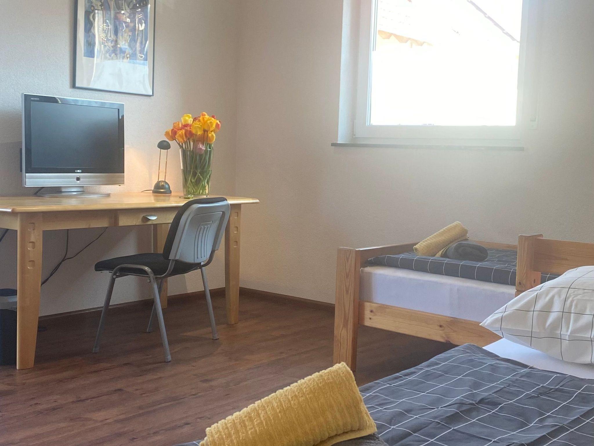 Großes Nichtraucher-Gästezimmer , ruhig und hell. Ausgestattet ist es mit einem Doppelbett, Kleiderschrank, Schreibtisch, TV, WLAN, Bügelbrett, so dass auch 3 Leute Platz finden. Das Badezimmer hat eine Dusche . Die Betten sind frisch bezogen. Außerdem gibt es Handtücher, Geschirr und Besteck, Kaffeemaschine und Wasserkocher sind unten in der Küche, die man zusammen nützen kann.