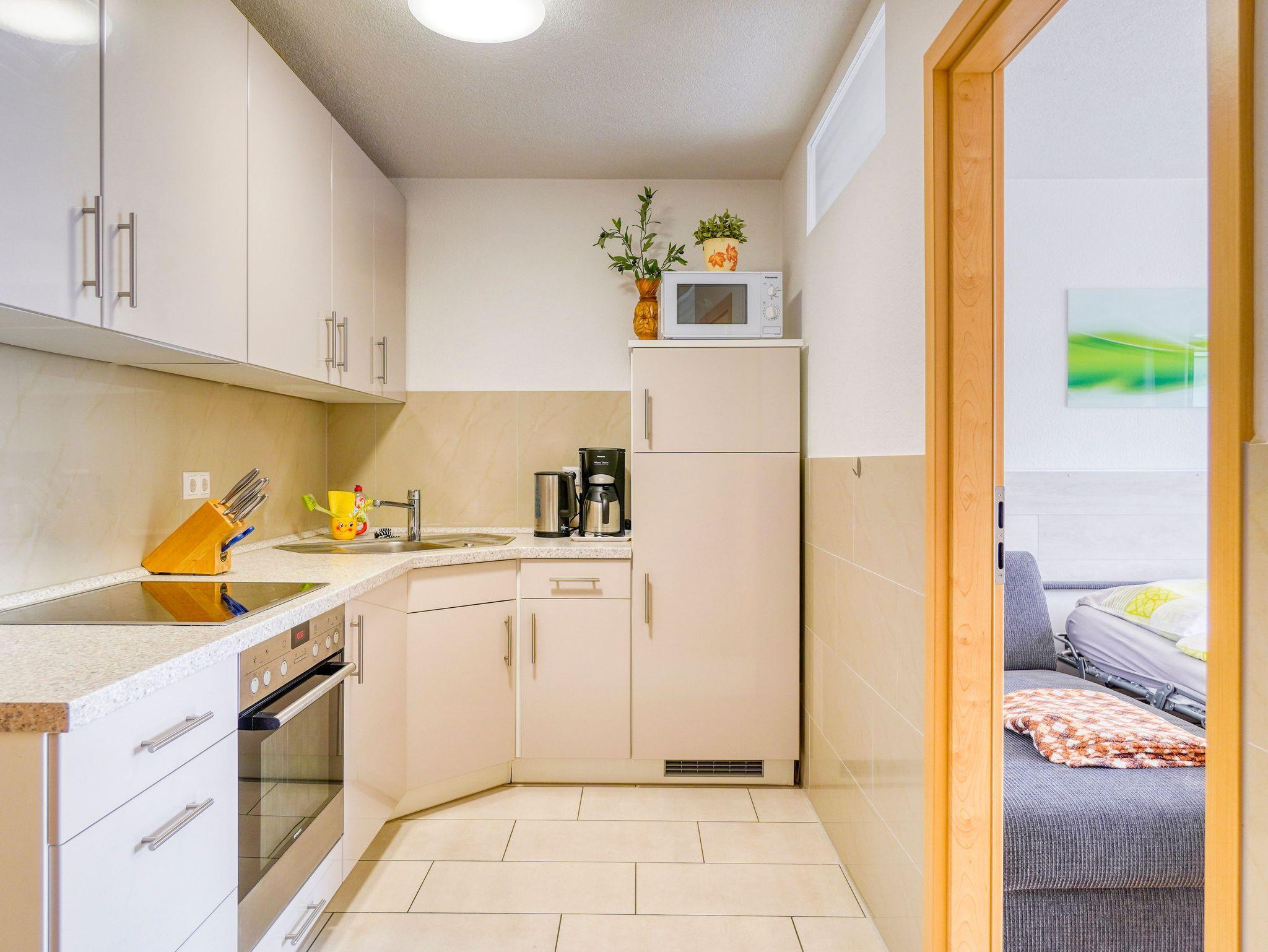 Einzelbett, separate Küche, Bad mit WC und Dusche, Internetanschluß