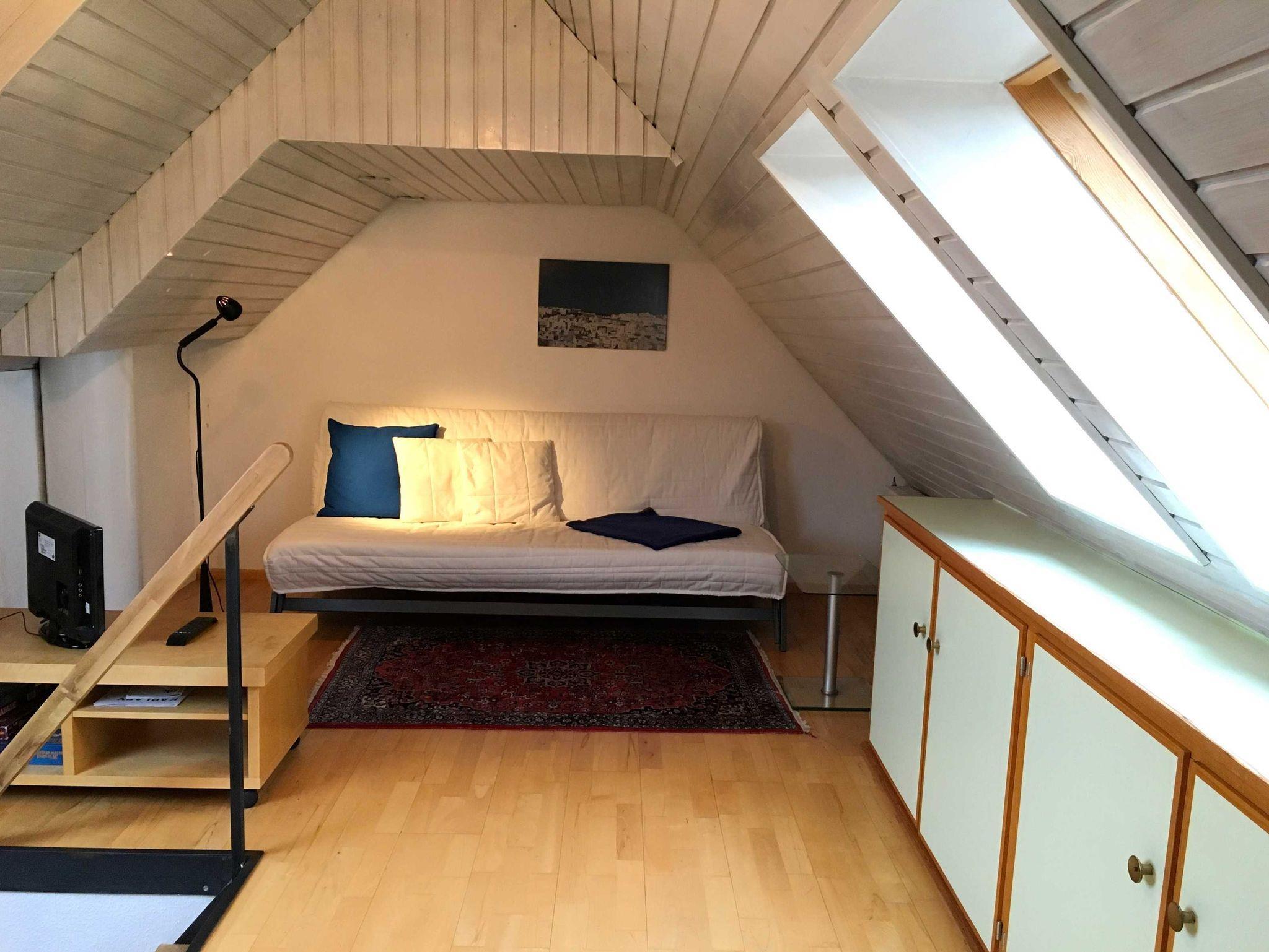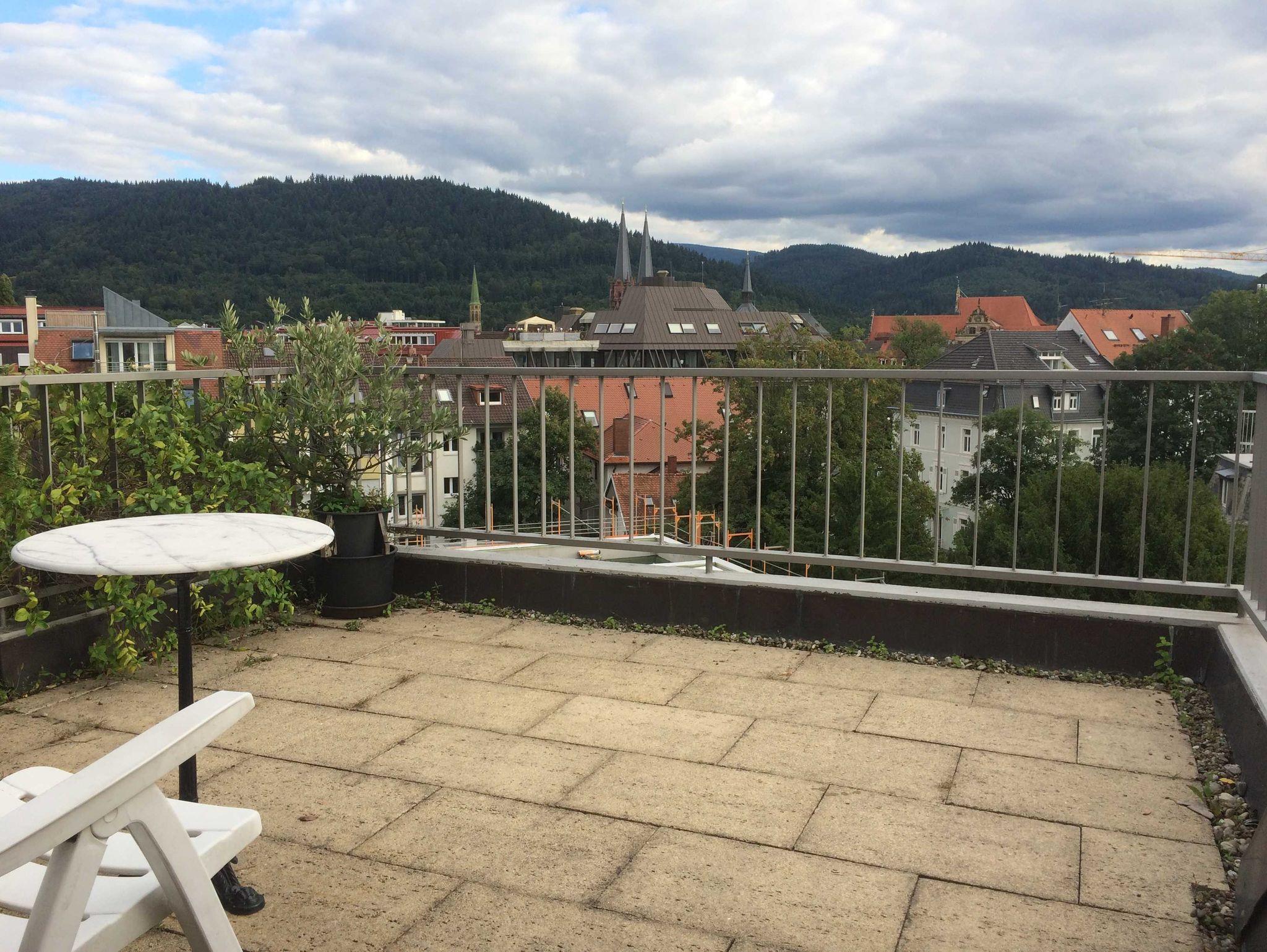 Über den Dächern und im Zentrum Freiburgs gelegene, ruhige und helle Drei-Zimmer-Maisonettewohnung mit Südterrasse. Ein Lift führt in den 5.Stock. Esszimmer, kleine Küche, Bad/WC im unteren Wohnbereich sowie Wohn/Arbeits - und Schlafzimmer im Dachgeschoss. Hinweis für Kinder und ältere Personen: relativ steile Treppe (siehe Foto). TV, Internet, Radio und Schreibtisch vorhanden. Ein Doppelbett mit getrennten Matratzen befindet sich im Schlafzimmer, eine Schlafcoach im Wohnzimmer. Ein mediterranes Lebensgefühl genießen Sie an warmen Abenden auf der großen Dachterasse, von der Sie einen freien Blick auf Schönberg, Sternwald und Schauinsland haben. Parkplatz im Hinterhof kann dazu gemietet werden.